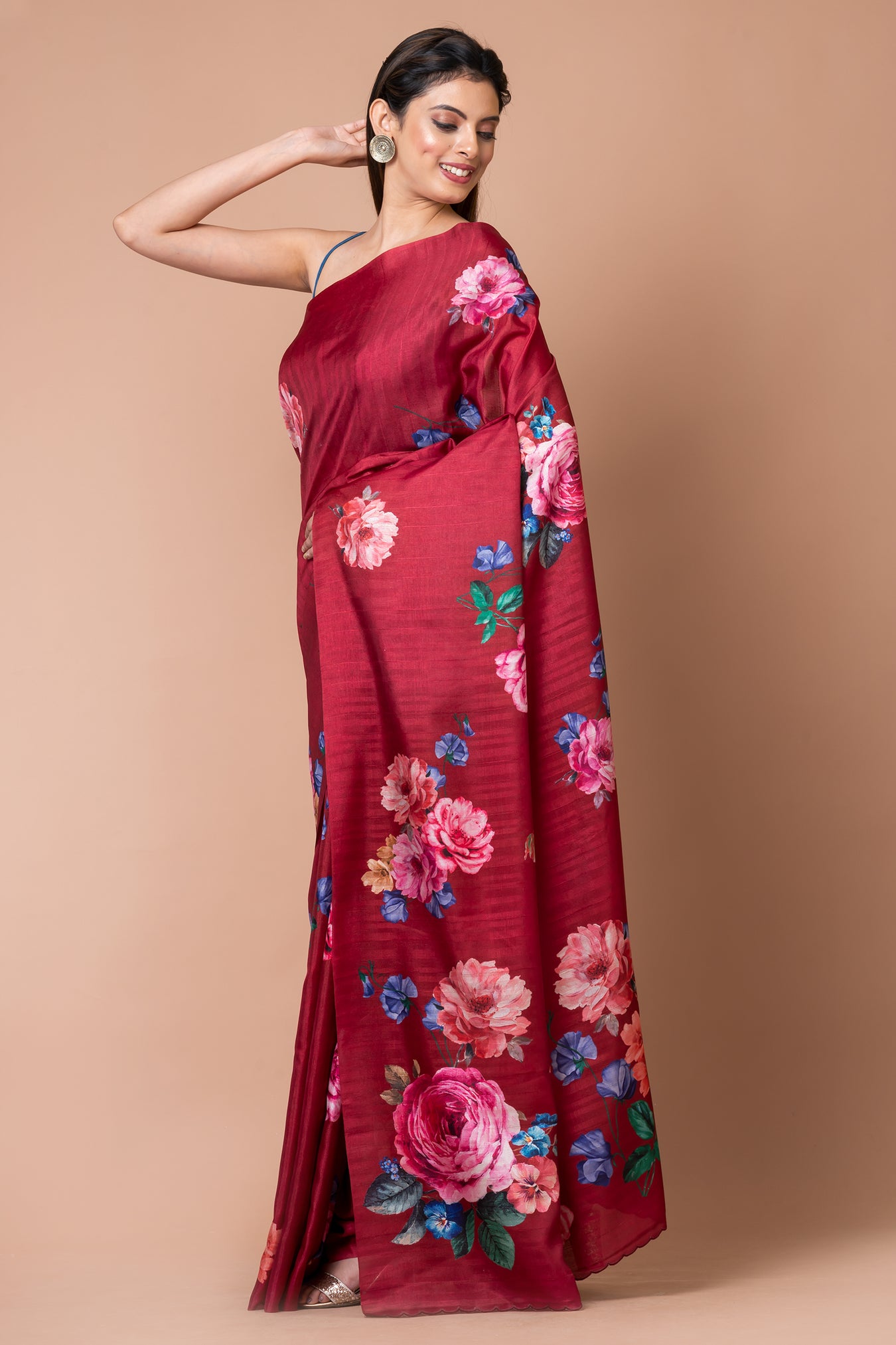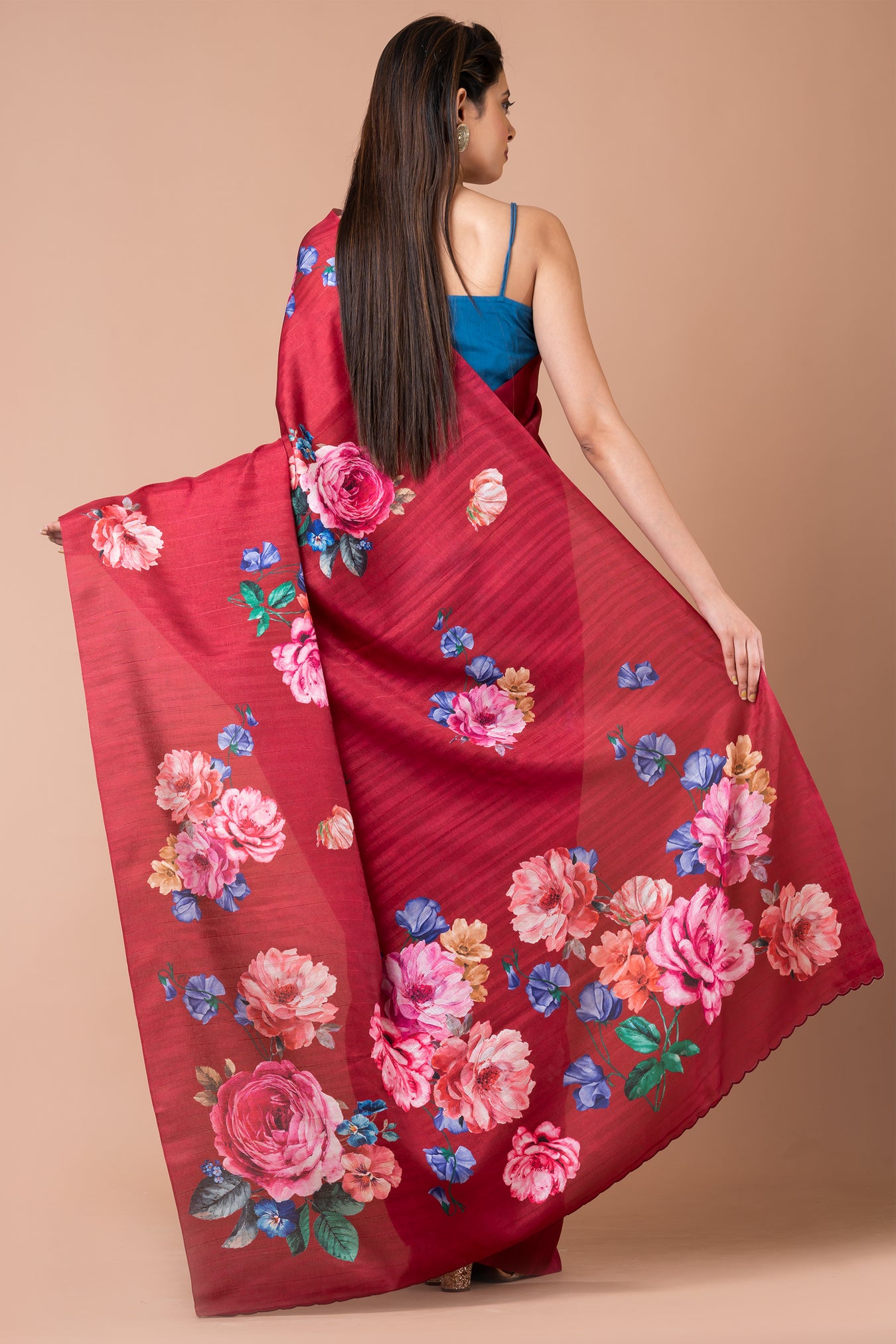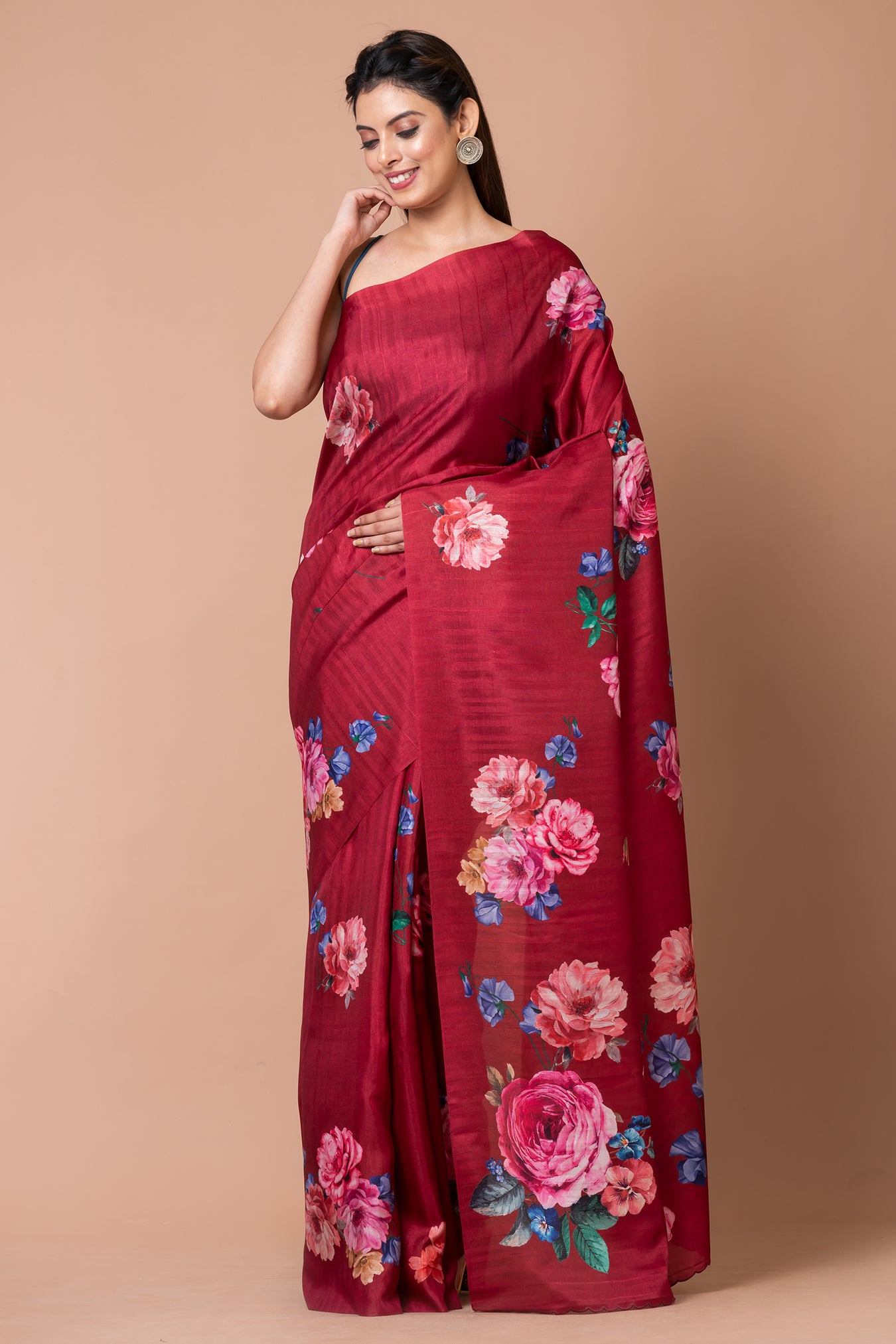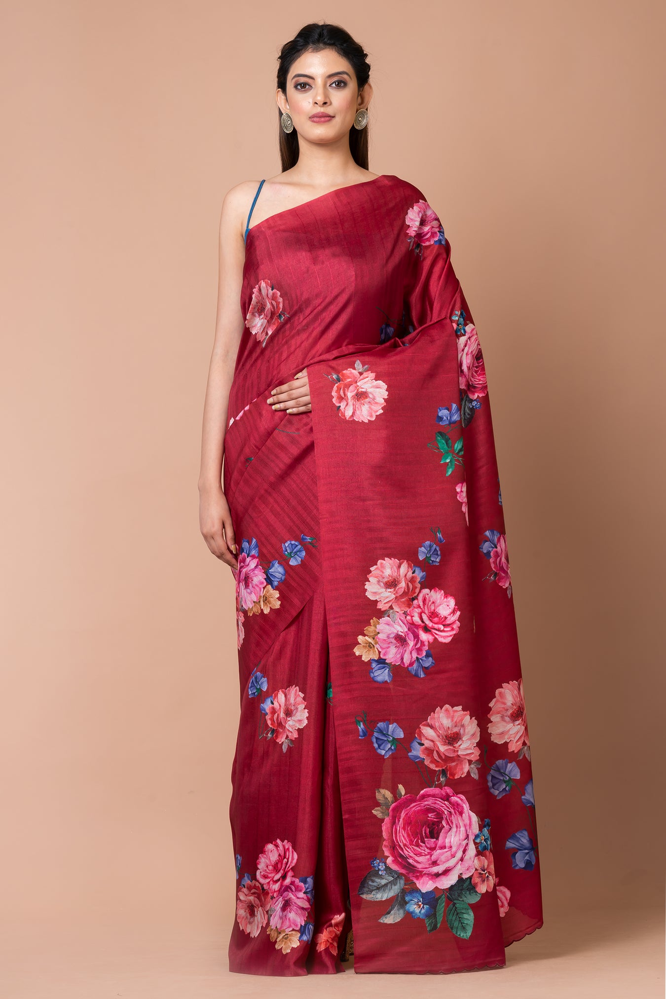 Size: S: 5.50Mtr B: 0.80MtrColour: DARK FUSHIAFabric: Semi tassarPattern and print: The Dark fushia half-tussar saree exudes sophistication with its subtle hue and half-tussar fabric. Adorned with a colorful floral design, it infuses vibrancy and captivates attention, making it a stylish and eye-catching choice for any occasion.Silk purity:Purity: Natural fabricCare instructions: Dry wash