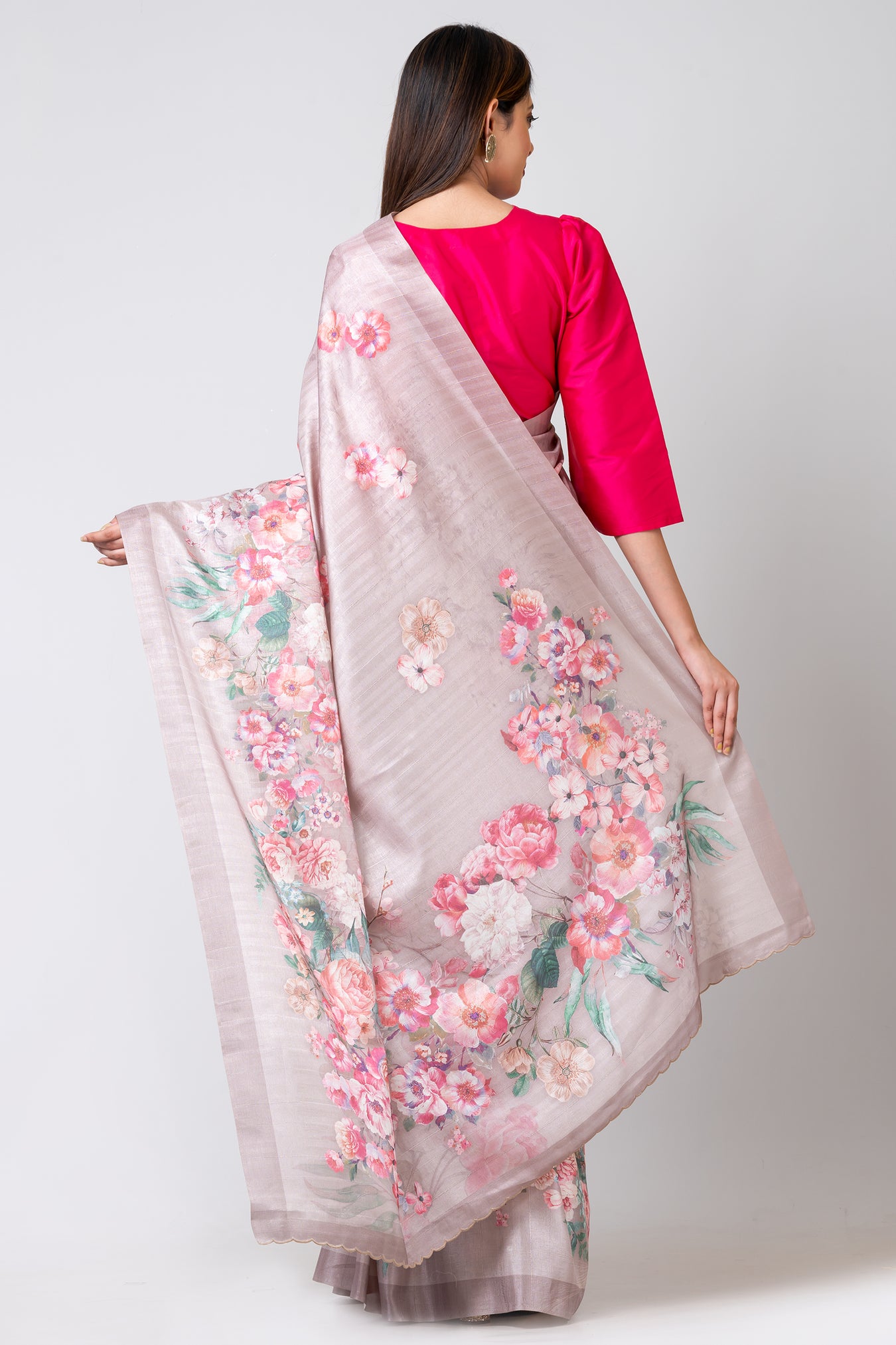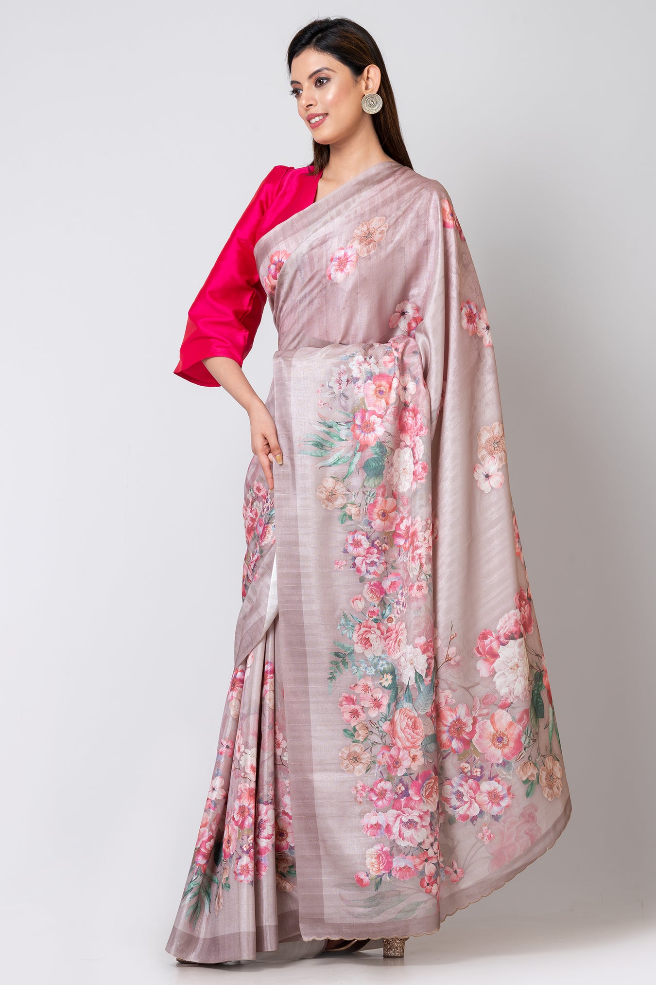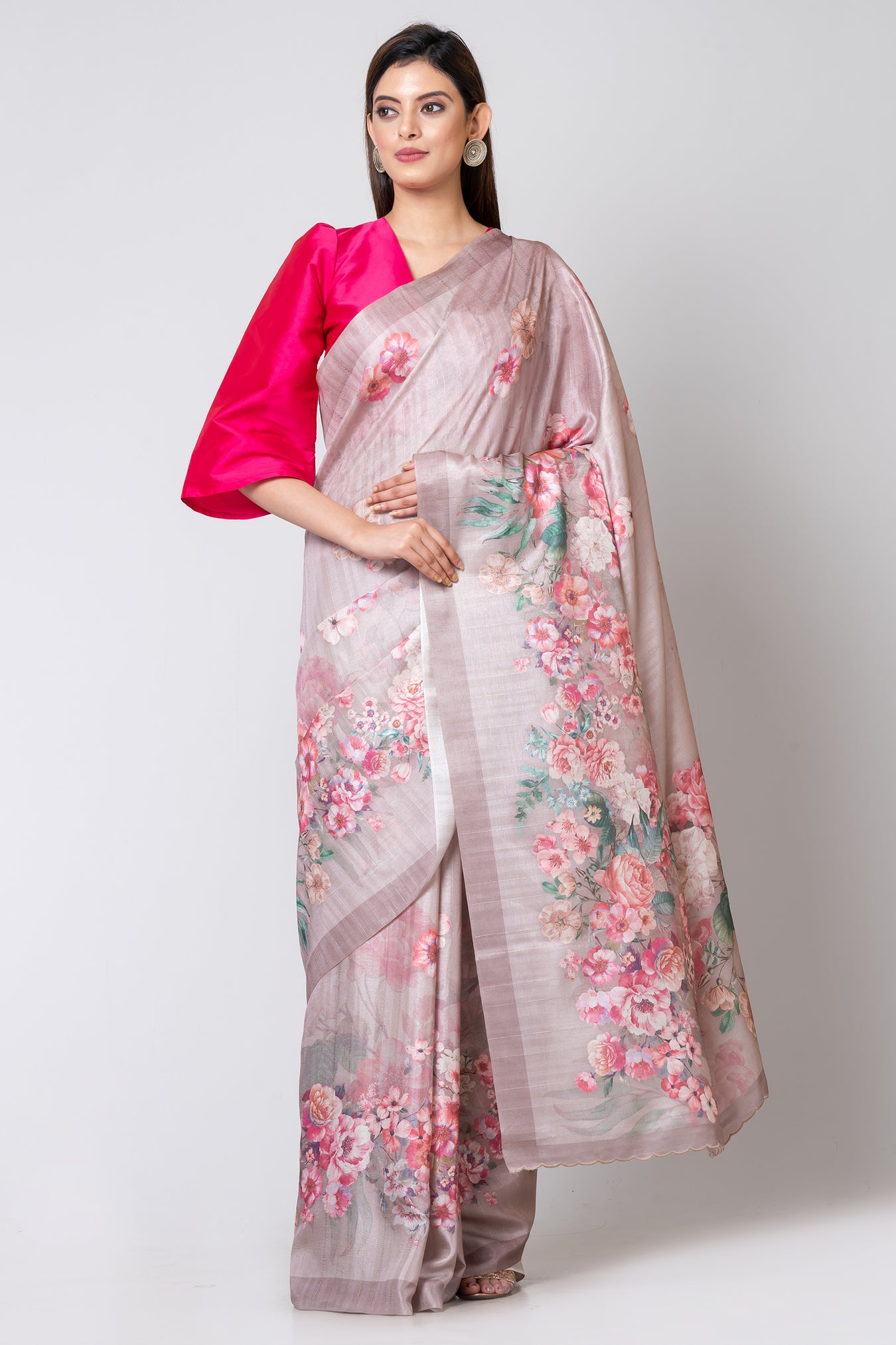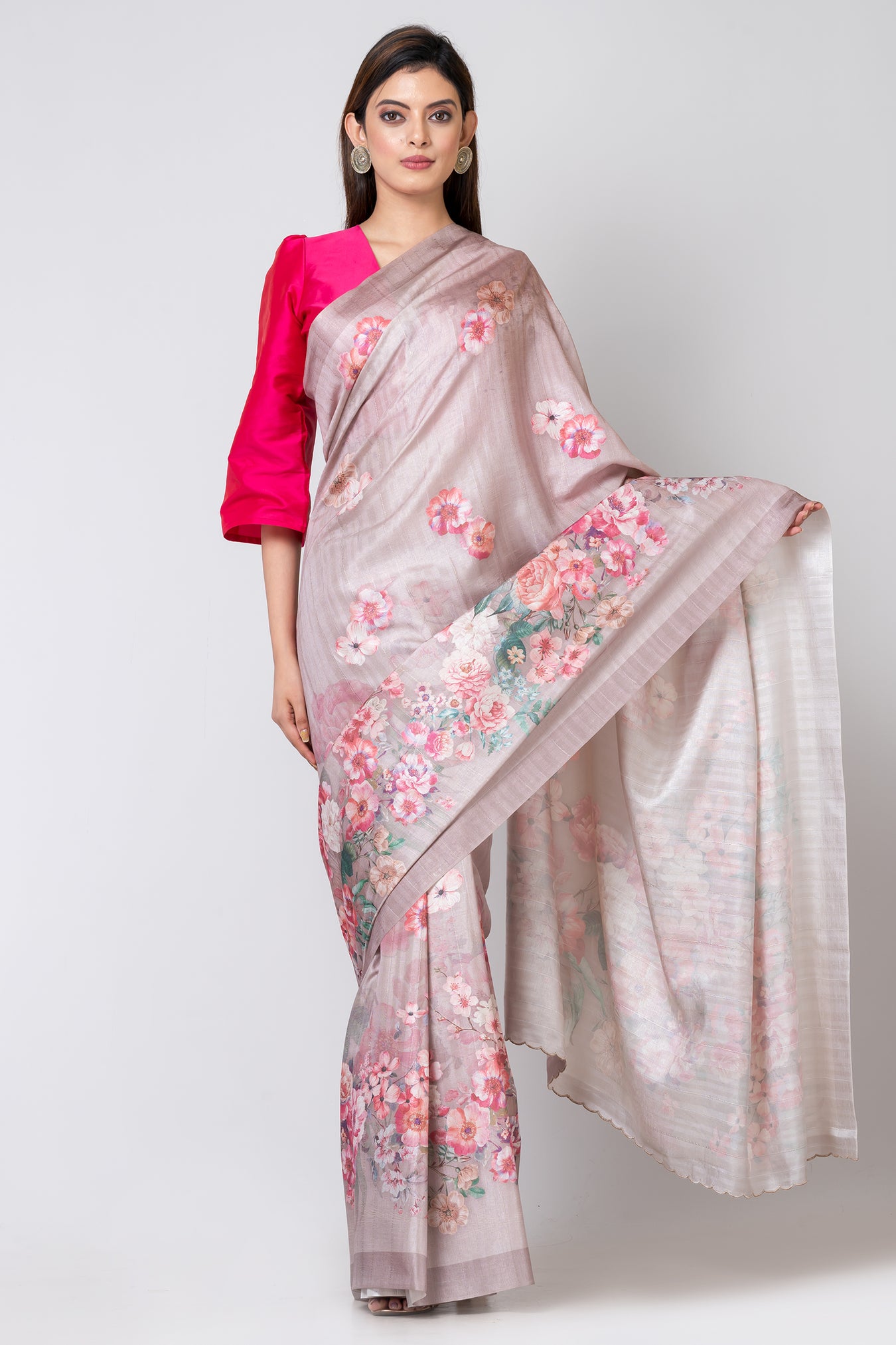 Size: S: 5.50Mtr B: 0.80MtrColour: SILVER GRAYFabric: Semi tassarPattern and print: The Silver gray half-tussar saree exudes sophistication with its subtle hue and half-tussar fabric. Adorned with a colorful floral design, it infuses vibrancy and captivates attention, making it a stylish and eye-catching choice for any occasion.Silk purity:Purity: Natural fabricCare instructions: Dry wash
