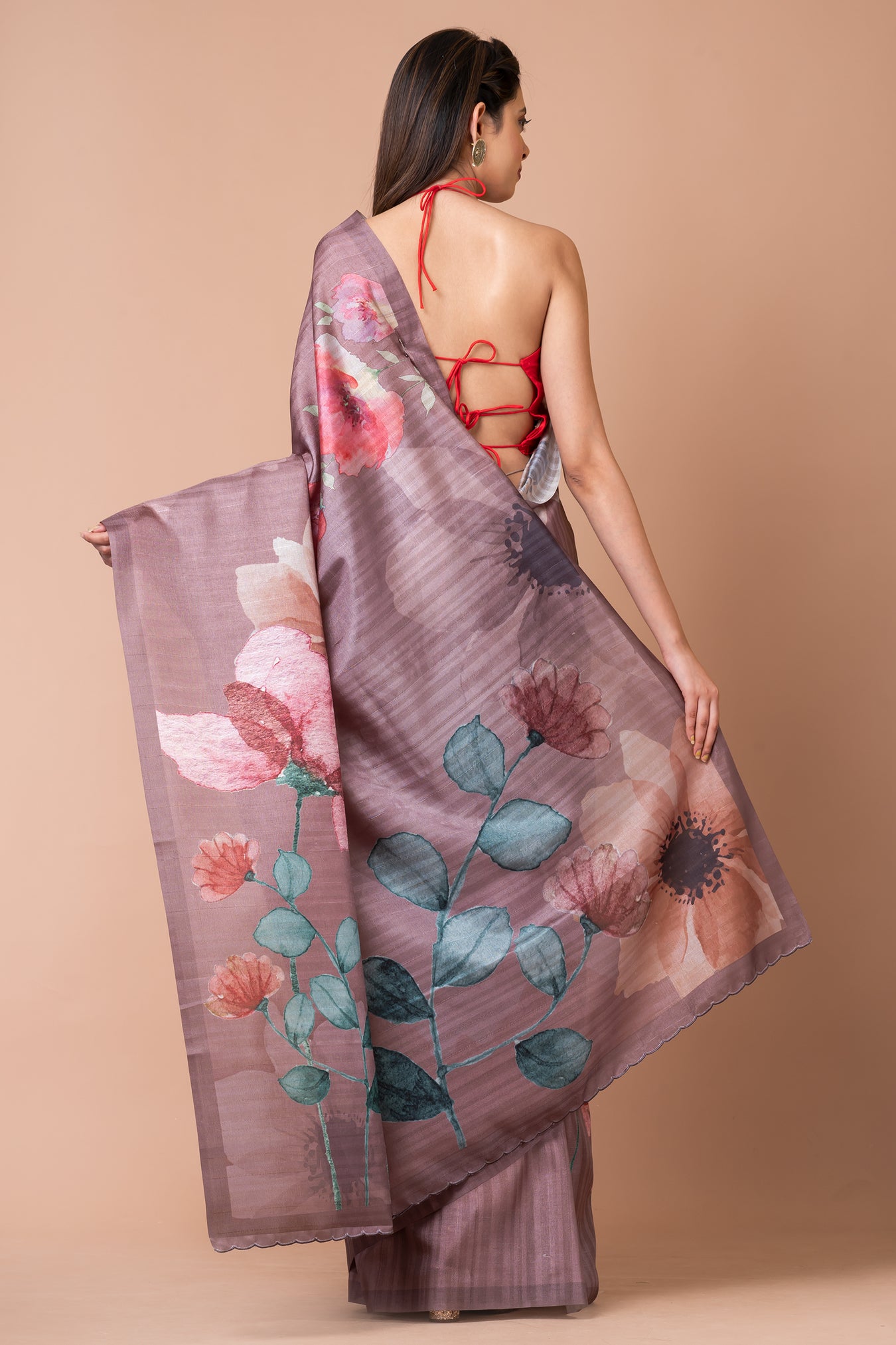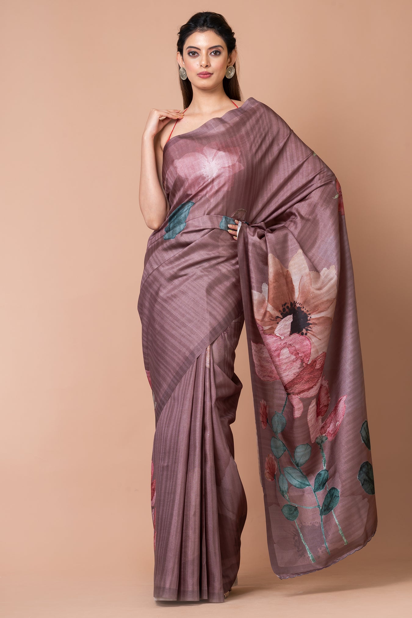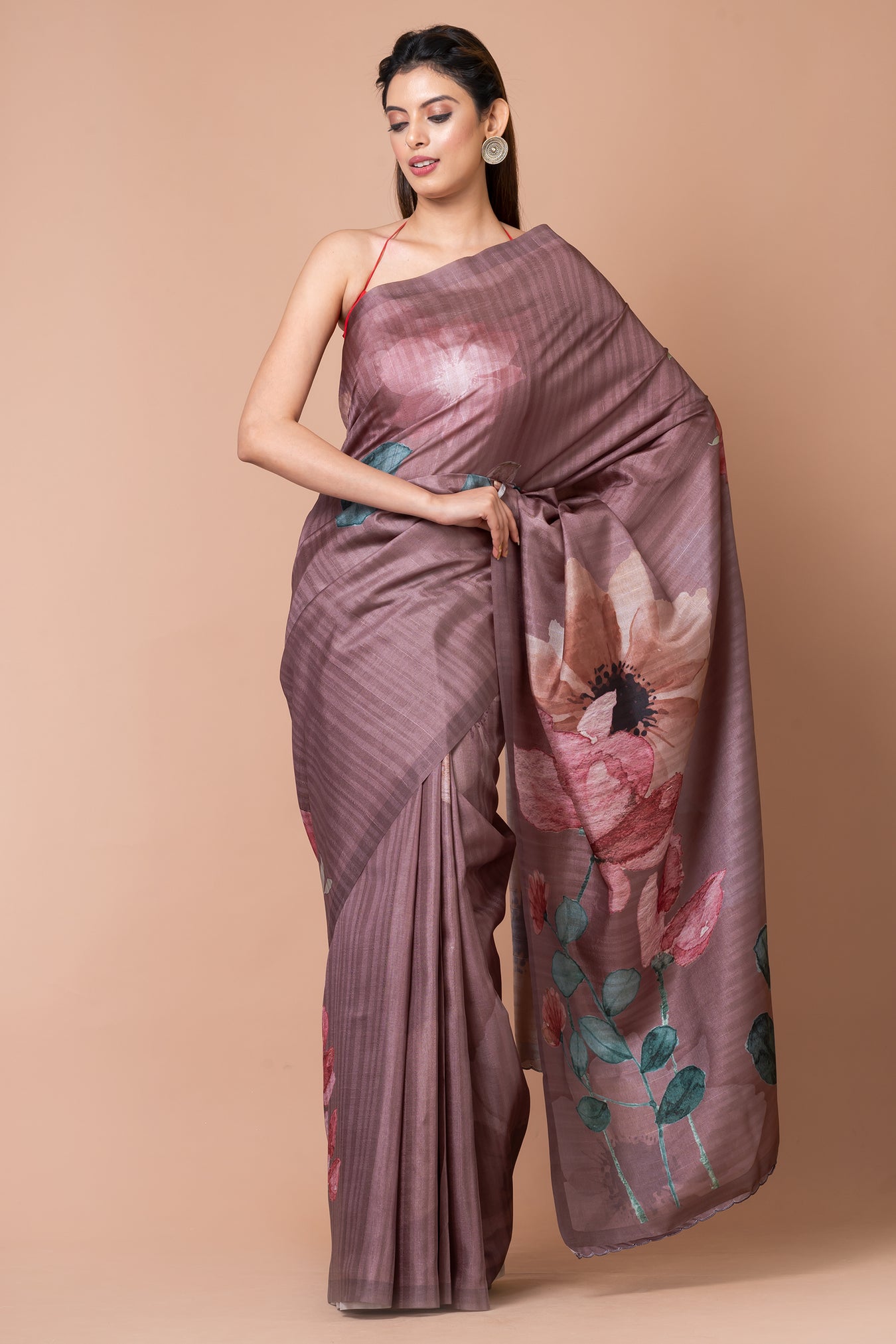 Size: S: 5.50Mtr B: 0.80MtrColour: BROWNFabric: Semi tassarPattern and print: The brown half-tussar saree emanates sophistication with its rich hue and exquisite half-tussar fabric. Enhanced by a mesmerizing watercolor floral design and complemented by a delicate geometric border, it exudes elegance and captivates attention, making it a perfect choice for any occasion.Purity: Natural fabricCare instructions: Dry wash