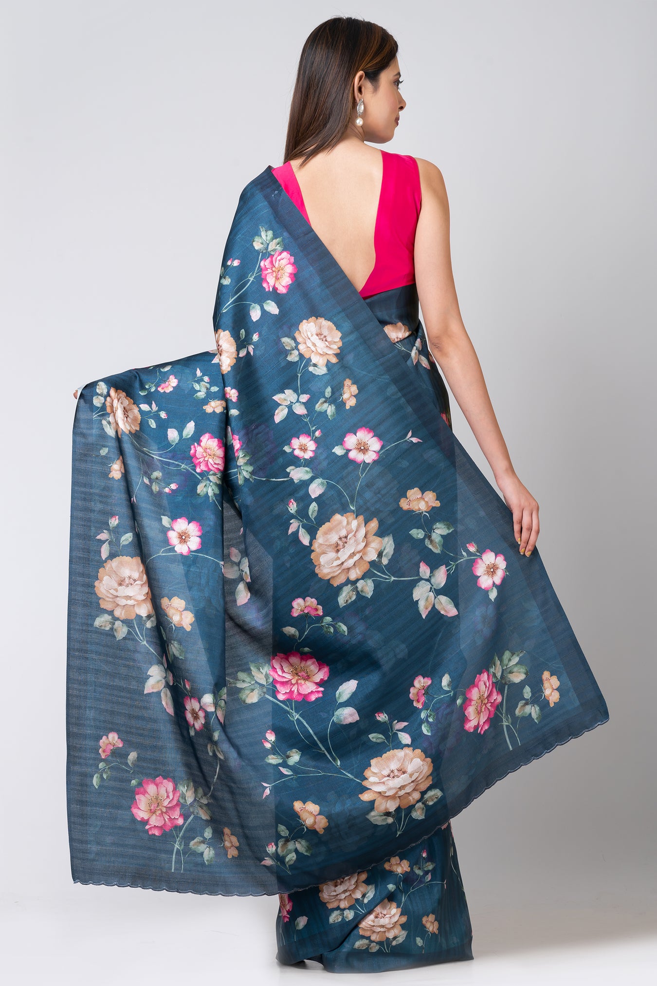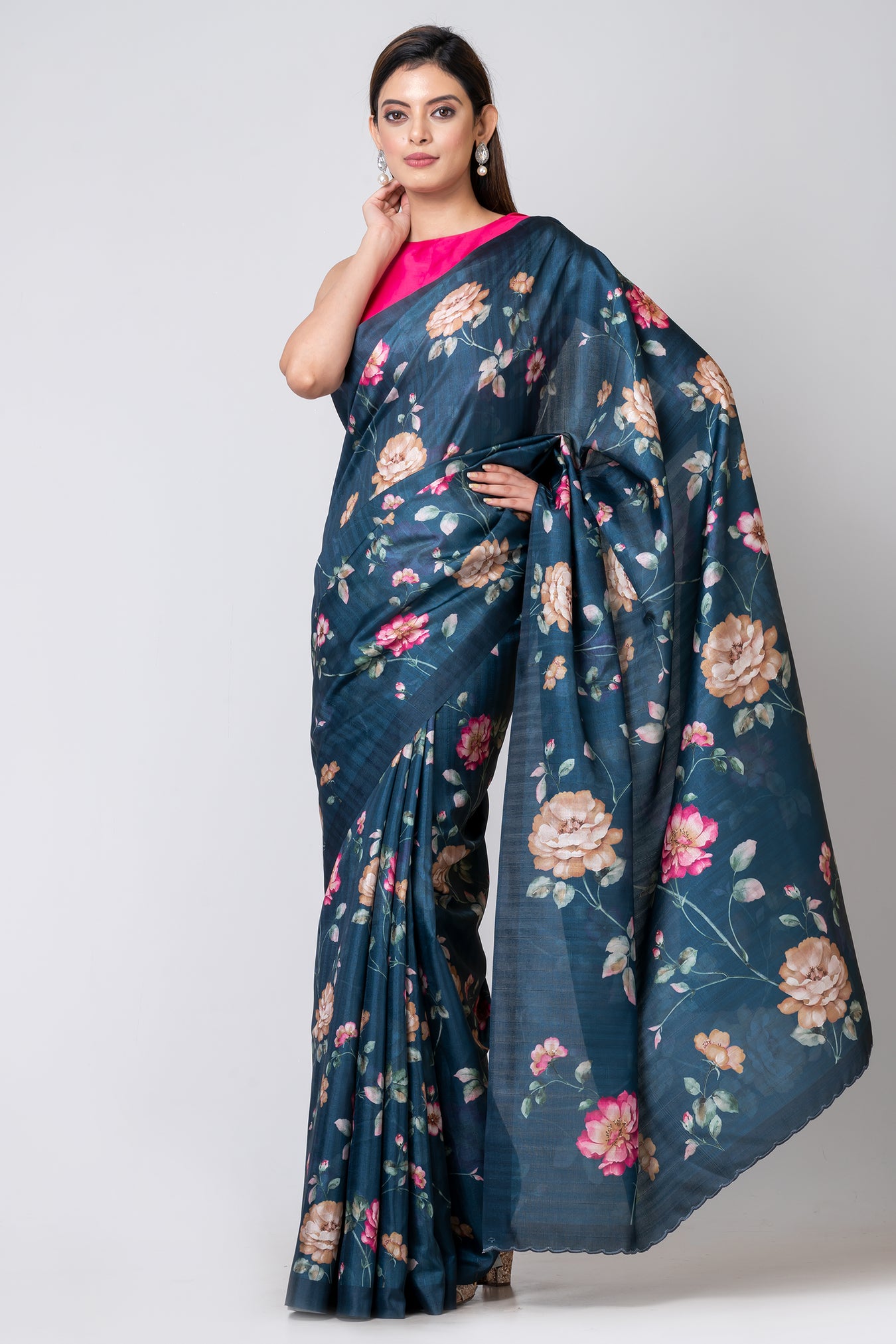 Size: S: 5.50Mtr B: 0.80MtrColour: TeelFabric: Semi tassarPattern and print: The teel half-tussar saree emanates sophistication with its rich hue and exquisite half-tussar fabric. Enhanced by a mesmerizing digital floral design and complemented by a delicate border, it exudes elegance and captivates attention, making it a perfect choice for any occasion.Purity: Natural fabricCare instructions: Dry wash