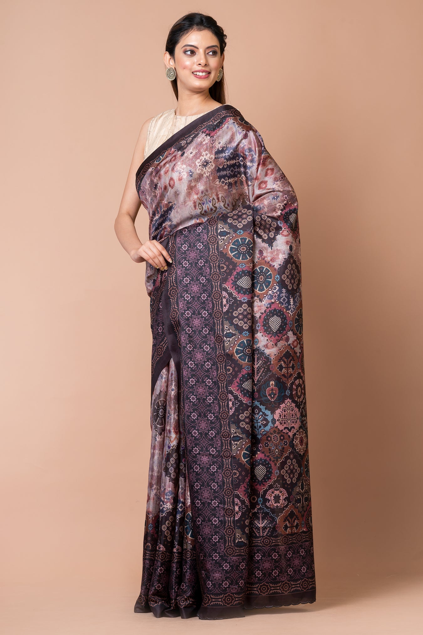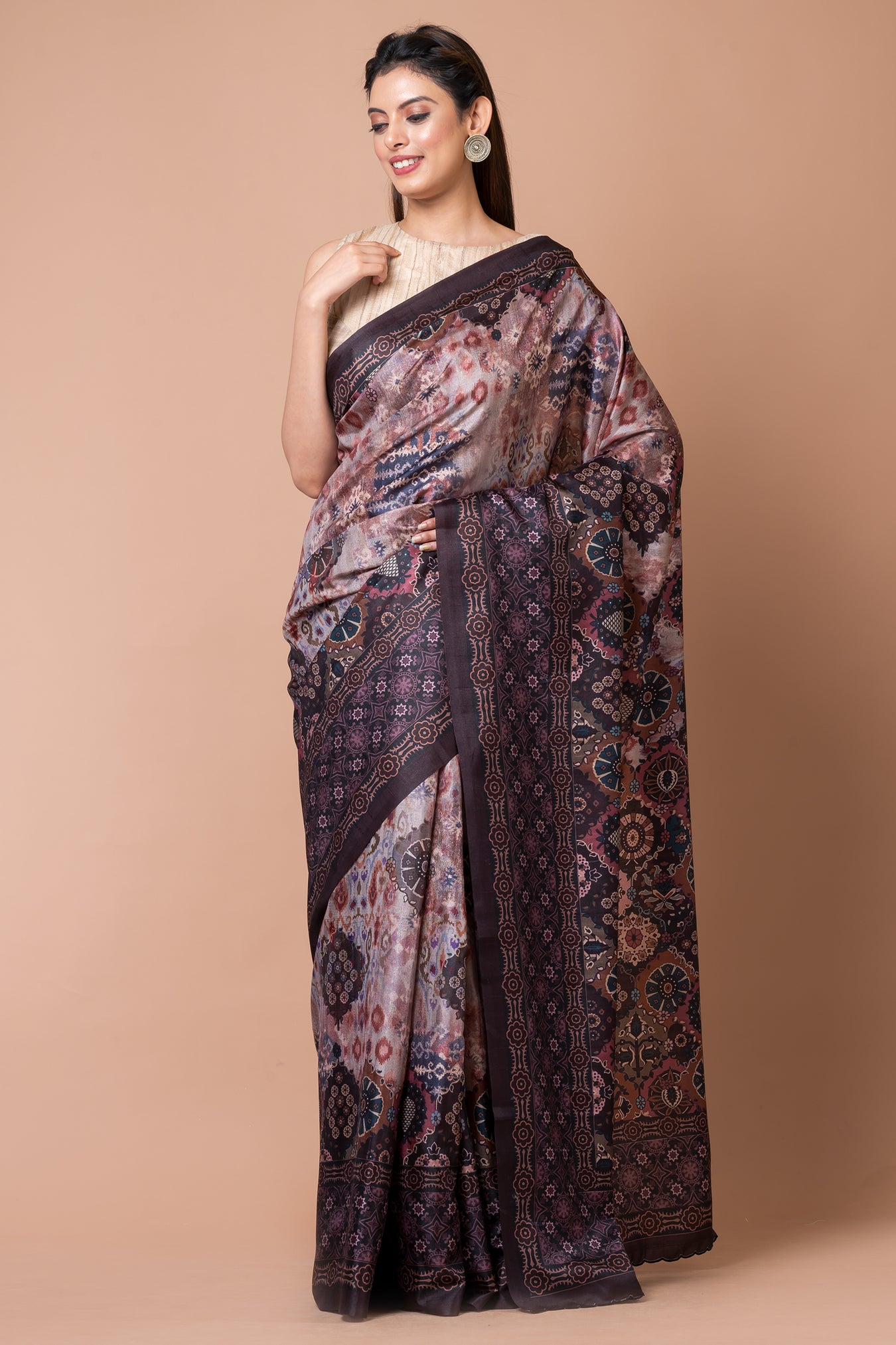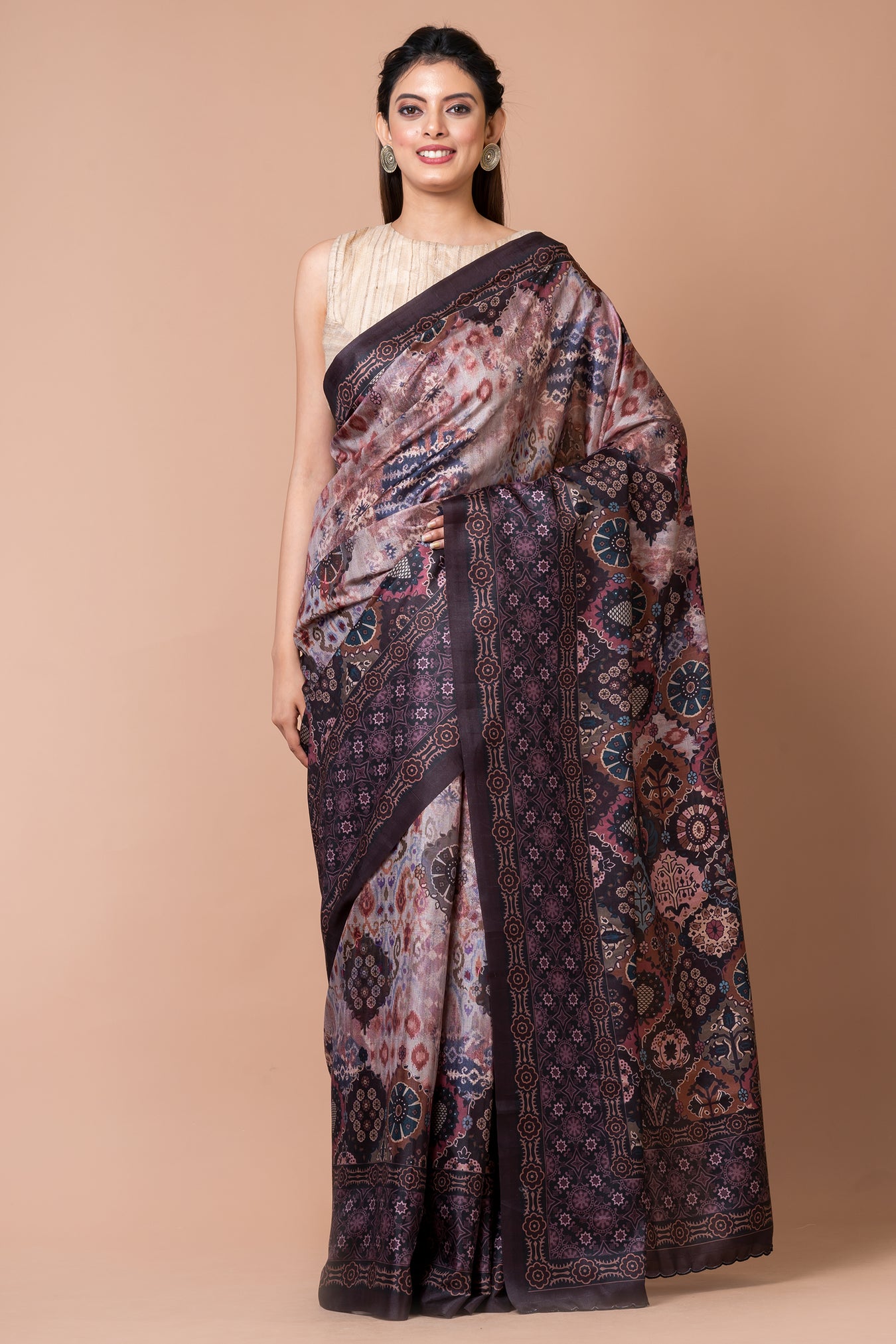 Size: S: 5.50Mtr B: 0.80MtrColour: BrownFabric: Semi tassarPattern and print: ABSTRACT DIGITAL PRINTPurity: Natural fabricCare instructions: Dry wash