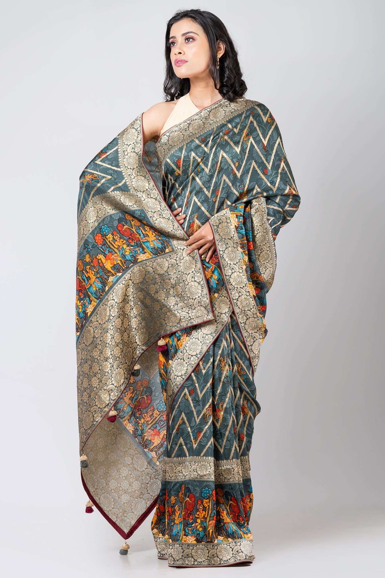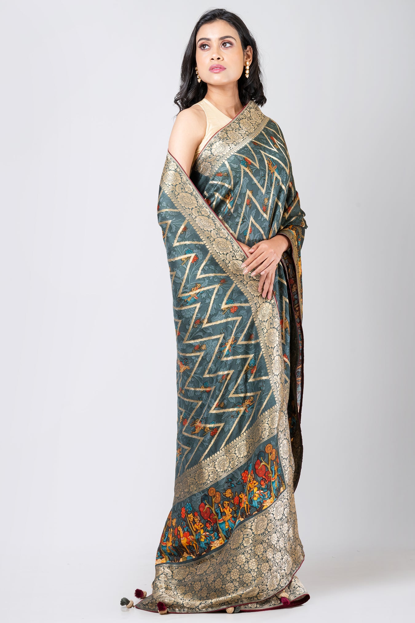 Size: S: 5.50Mtr B: 0.80MtrColour: LIGHT SLATE BLUEFabric: DOLA LEHARIYAPattern and print: The combination of light slate blue color saree, kalamkari border, zari lahria all over work and a heavy jari border really creates a beautiful blend of contemporary and traditional elements in this saree.Silk purity: Pack contains: 1 Saree, 1 BlouseCare instructions: Dry wash