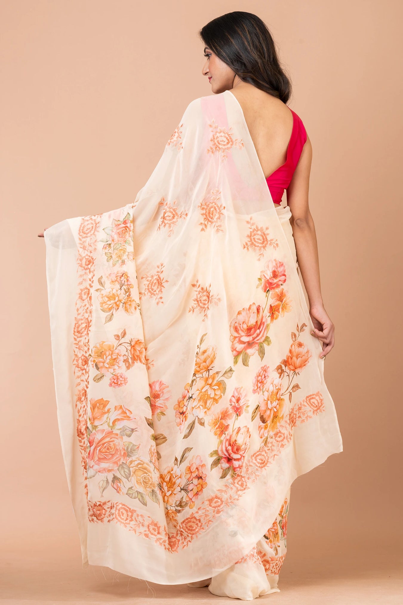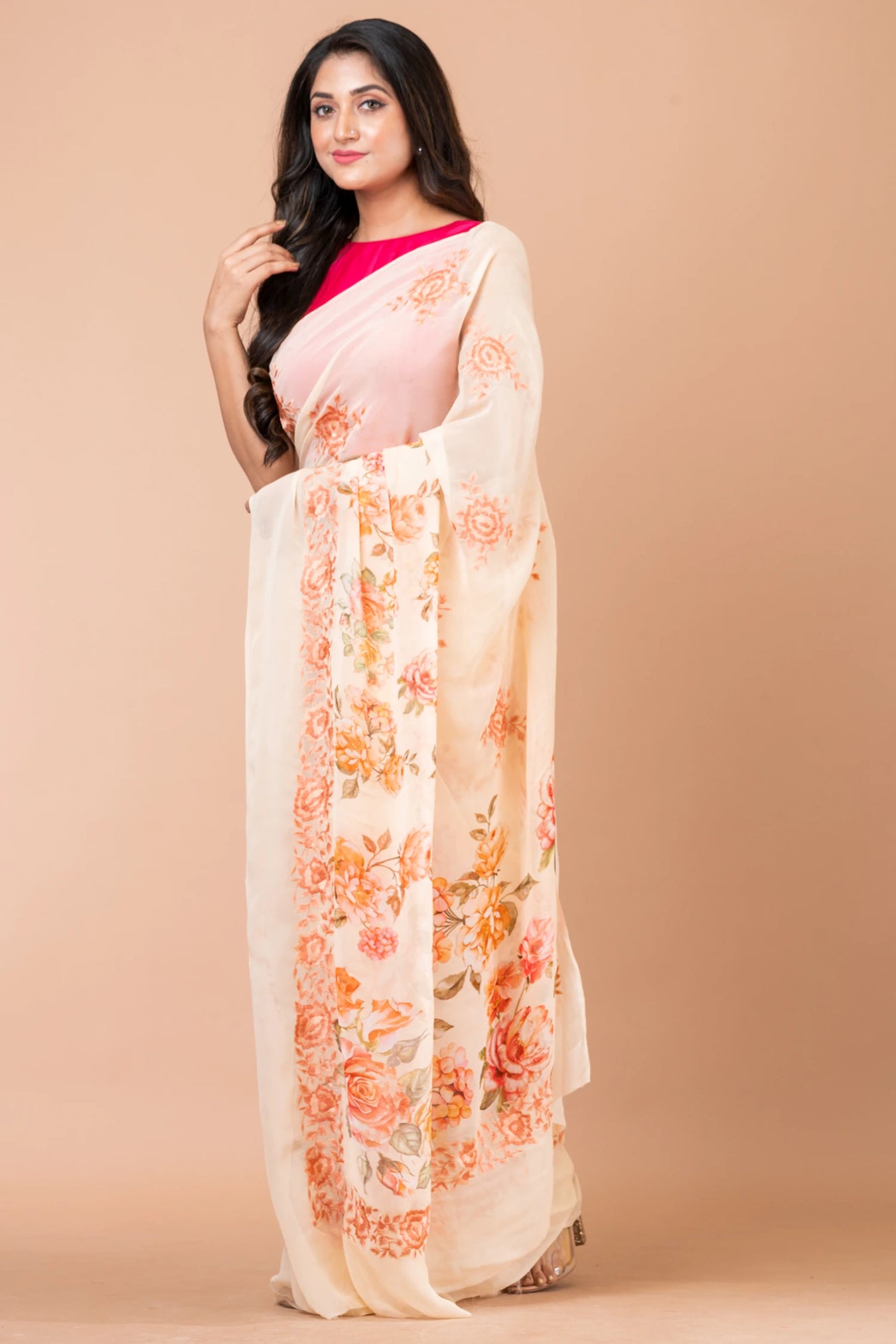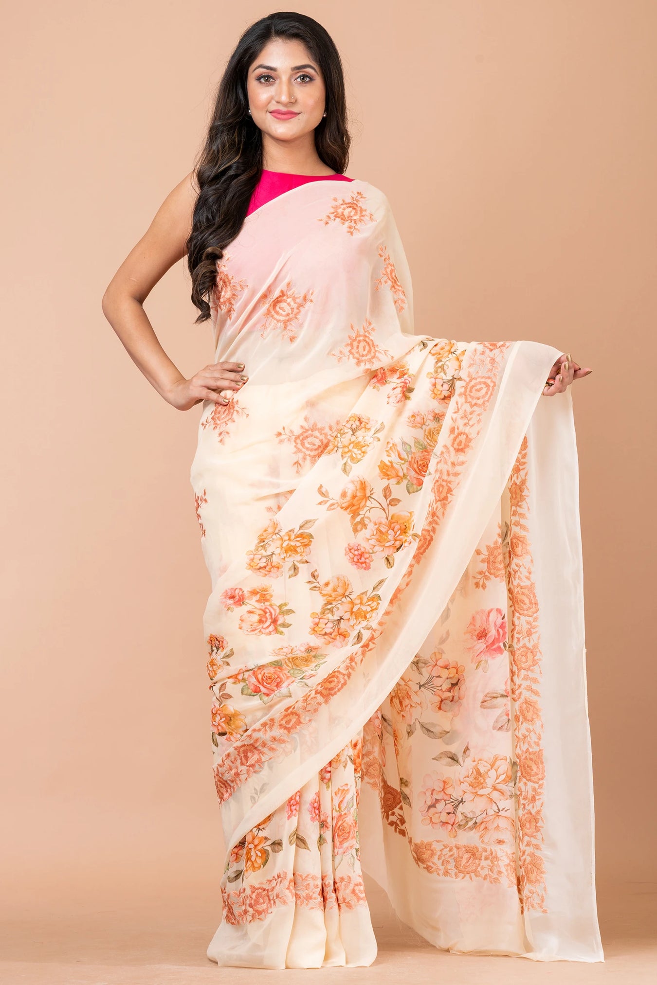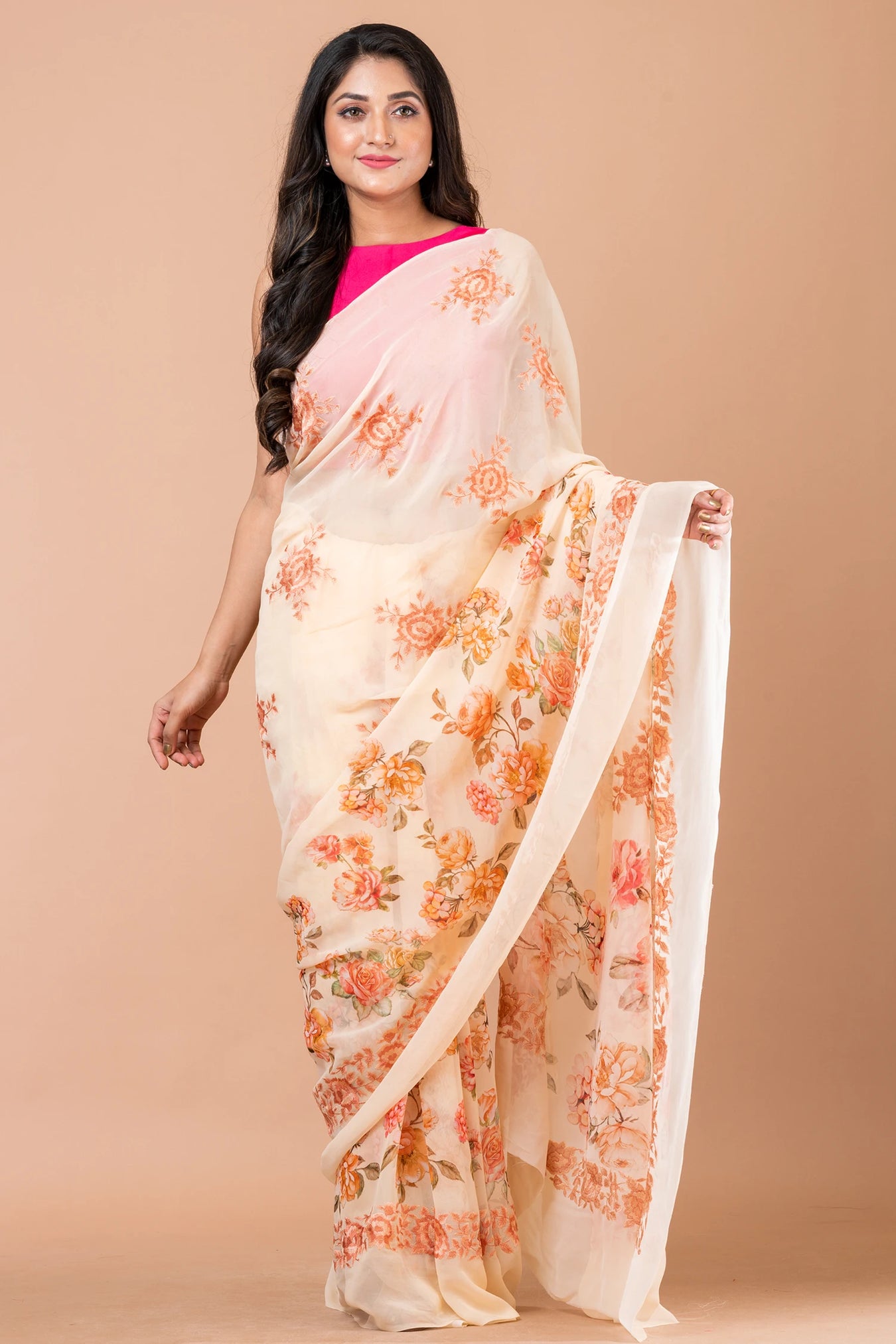 Size: S: 5.50Mtr B: 0.80MtrColour: Pale YellowFabric: GeorgetteAttributes: Selh thread embroidery Pattern and print: Celebrate the vibrant beauty of our watercolor orange rose saree, where the allure of the delicate blooms blends with the warmth of orange hues, creating a captivating and elegant ensemble that embraces the essence of nature's grace. beauty meets craftsmanship with self-thread embroidery delicately adorning the entire fabric. The meticulous embroidery adds a touch of opulence and sophistication, enhancing the saree's allure.Purity: Natural FabricPack contains: 1 Saree, 1 BlouseCare instructions: Dry wash
