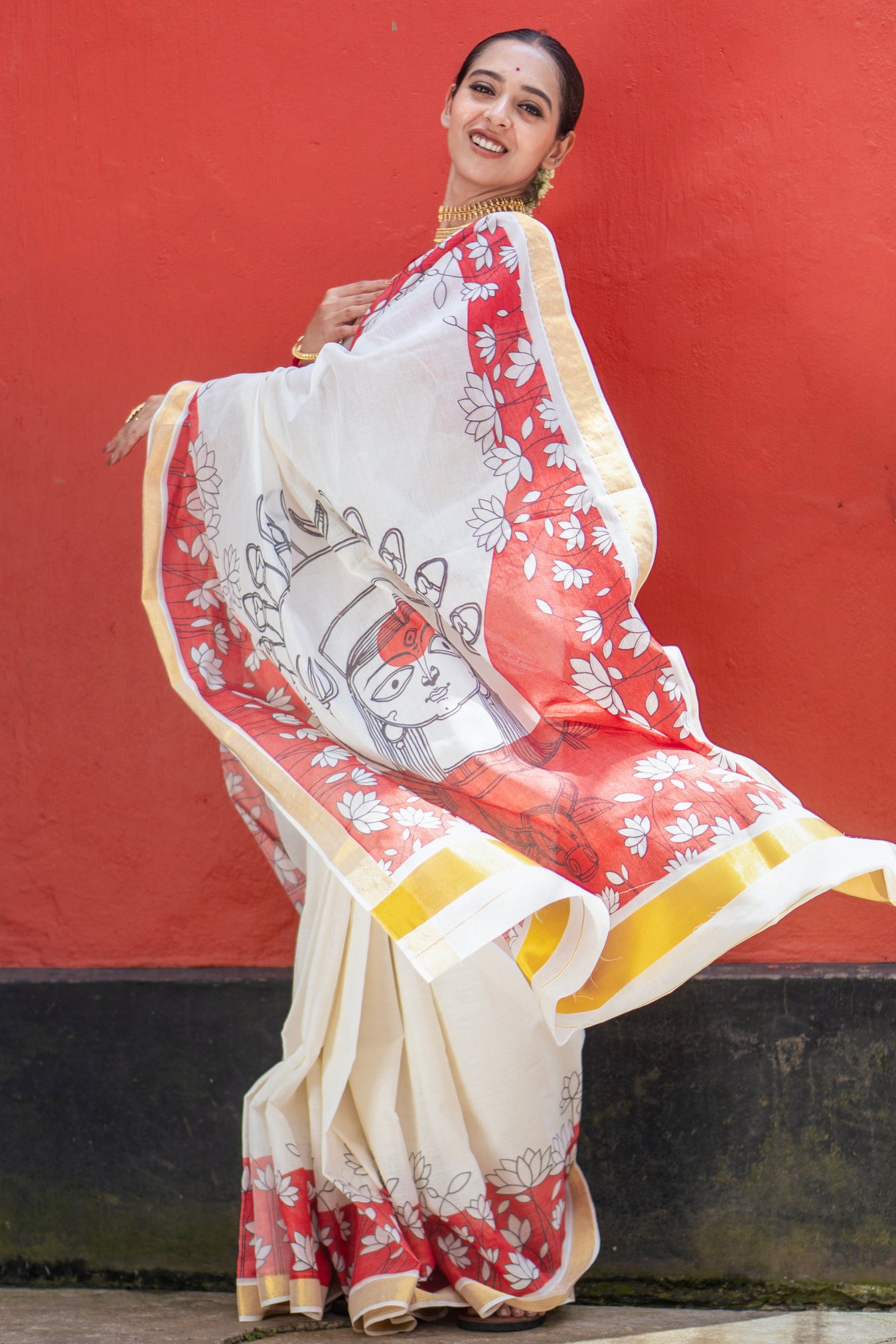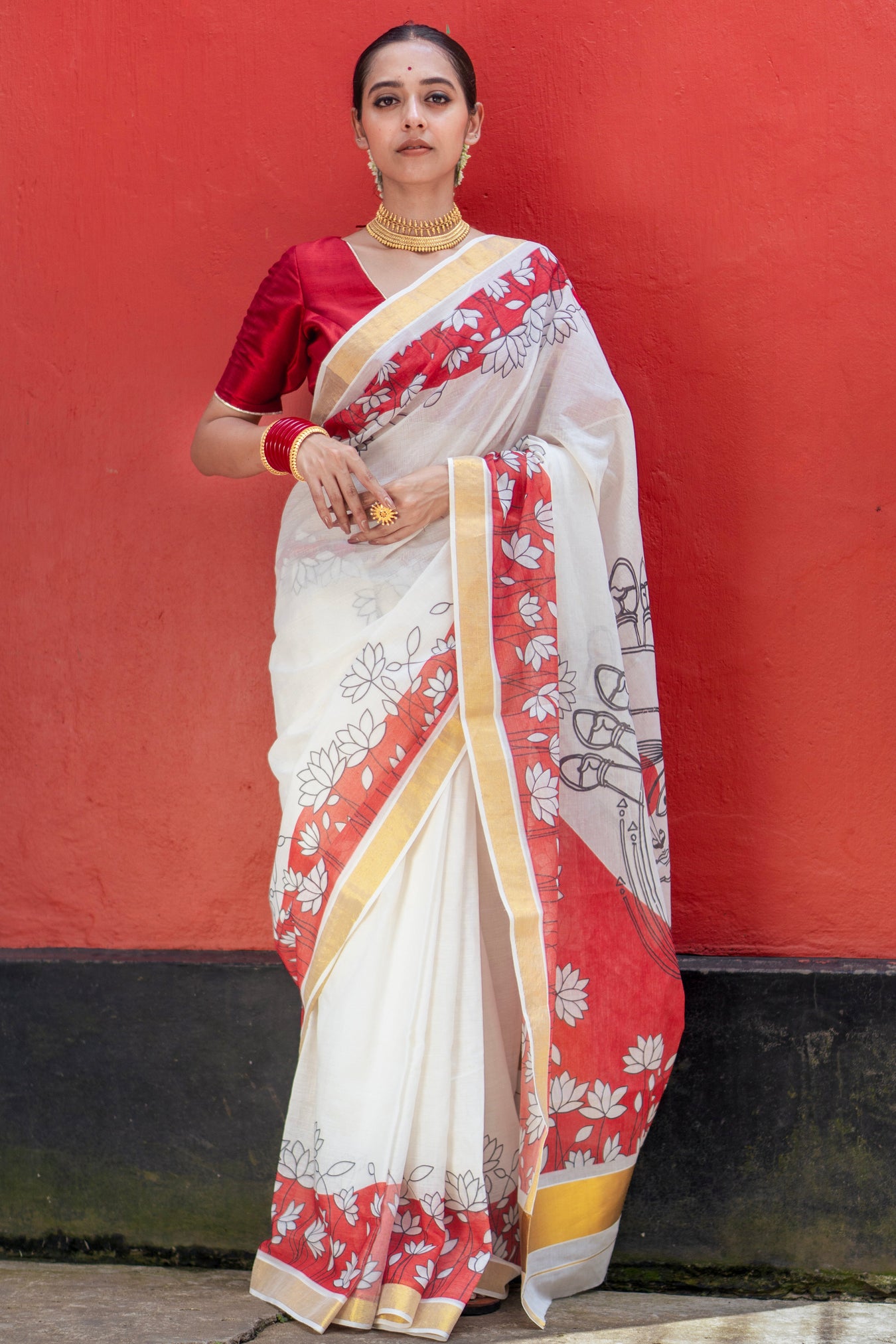 Pattern and print: This saree is a traditional white base handloom piece featuring script-style motifs in a deep red maroon tone across the body and pallu. The print resembles ancient manuscript text and artistic line drawings, giving it a heritage look. The saree is bordered with a slim golden zari edge and highlighted with yellow detailing on the pallu, adding a touch of vibrancy. The overall pattern combines cultural storytelling through script prints with minimalistic elegance, making it perfect for festive and traditional occasions.