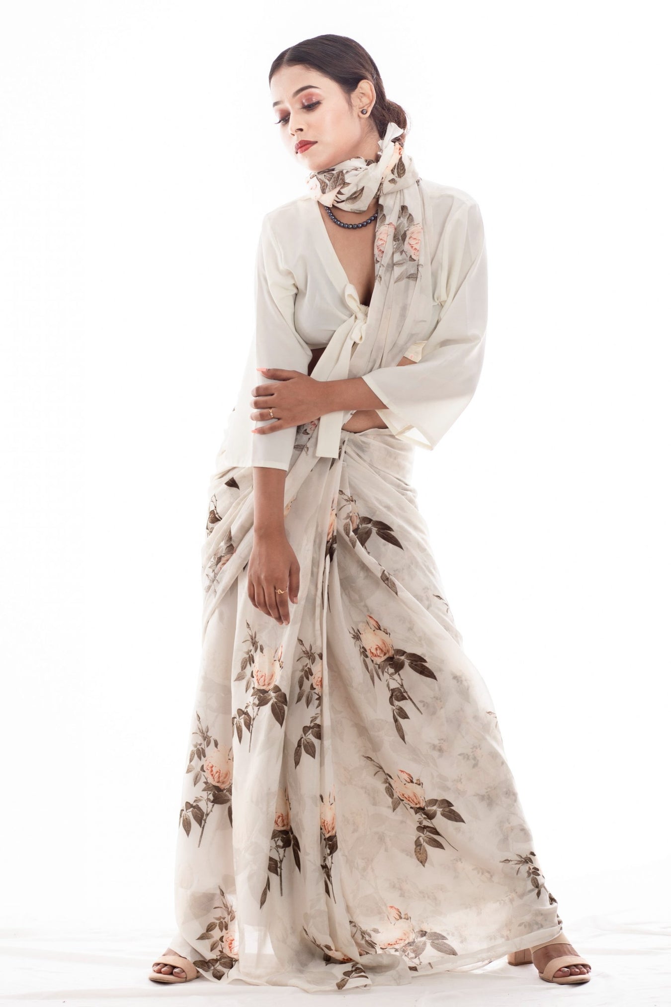 FSize:Â S: 5.50Mtr B: 0.80MtrColour: WhiteFabric: GeorgettePattern and print: Roses all over ivory flowing Georgette saree. Soft, sleek, the saree drapes around the figure and highlights the colorful prints all over, making this piece an epitome of sensual beauty. The saree oozes soft, and sensual feel, which creates a beautiful aura around the wearer.Care instructions:Â Dry wash