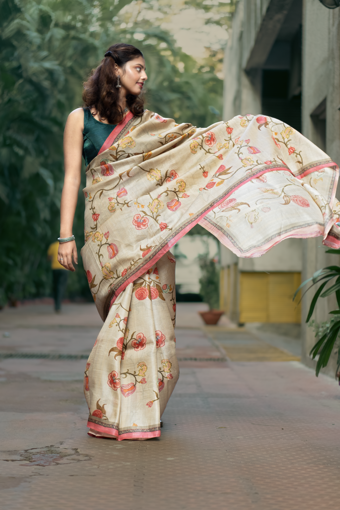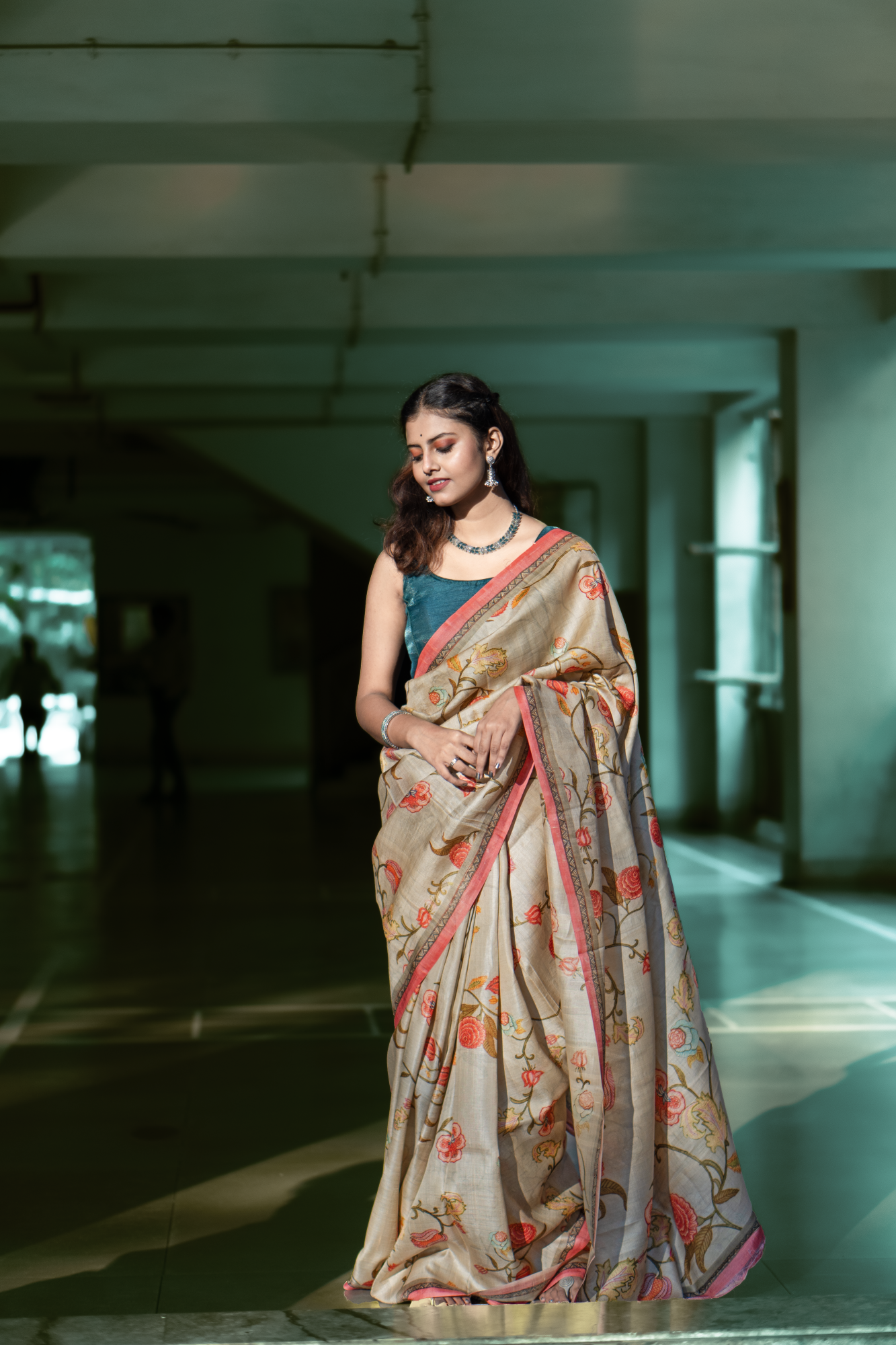 Size: S: 5.50Mtr B: 0.80MtrColour:BEIGEFabric: Tussar Silk Attributes:Pattern and print: Make a bold statement with our beige color saree showcasing a rich red border and captivating all over digital flower print throughout. This eye-catching ensemble effortlessly combines tradition with contemporary flair.Silk Purity: Pure TussarPack contains: 1 Saree, 1 BlouseCare instructions: Dry wash