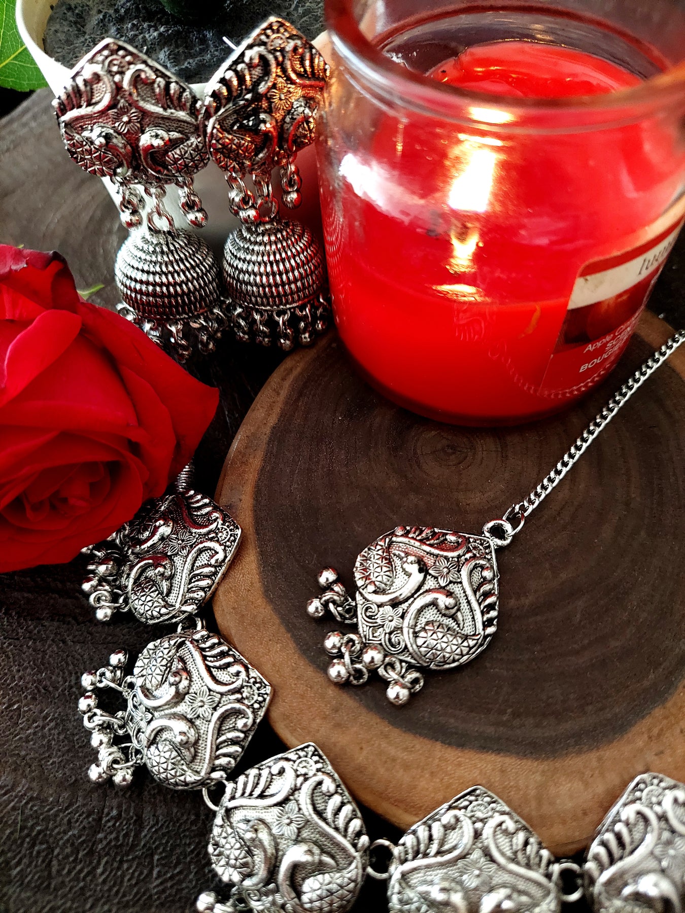 A stunning antique finish setting that enhances feminine beauty and flair. With delicate antique beads, a pair of Drop earrings, and Maang Tika, the neck-piece is ornate and intricate. Wear this piece with whatever you like.