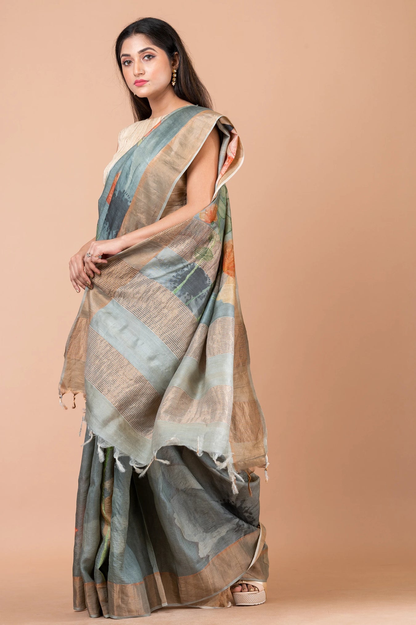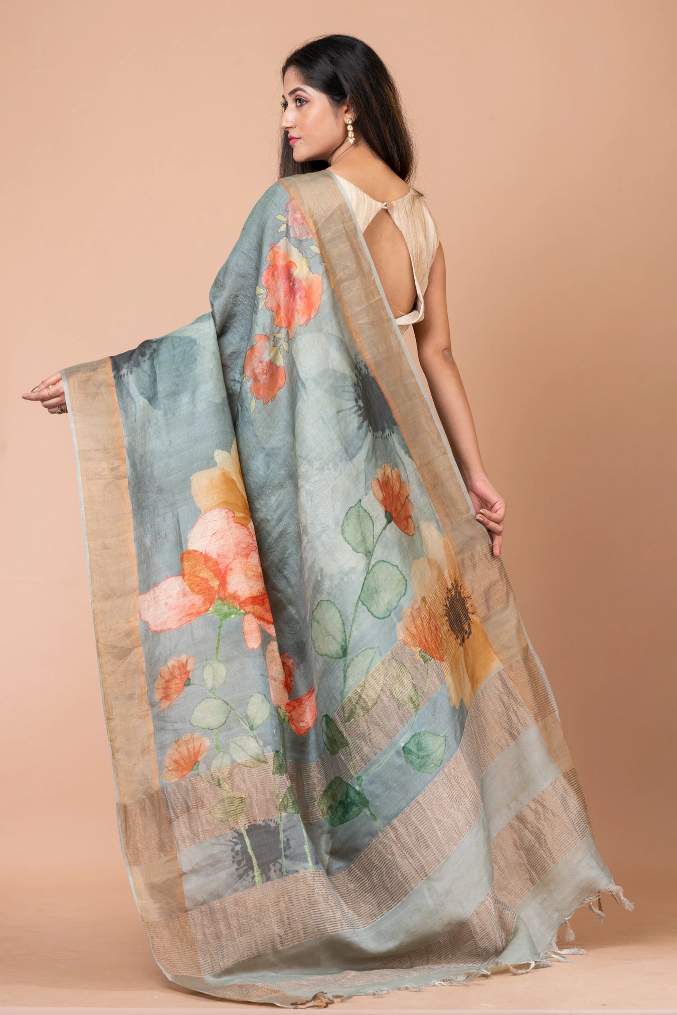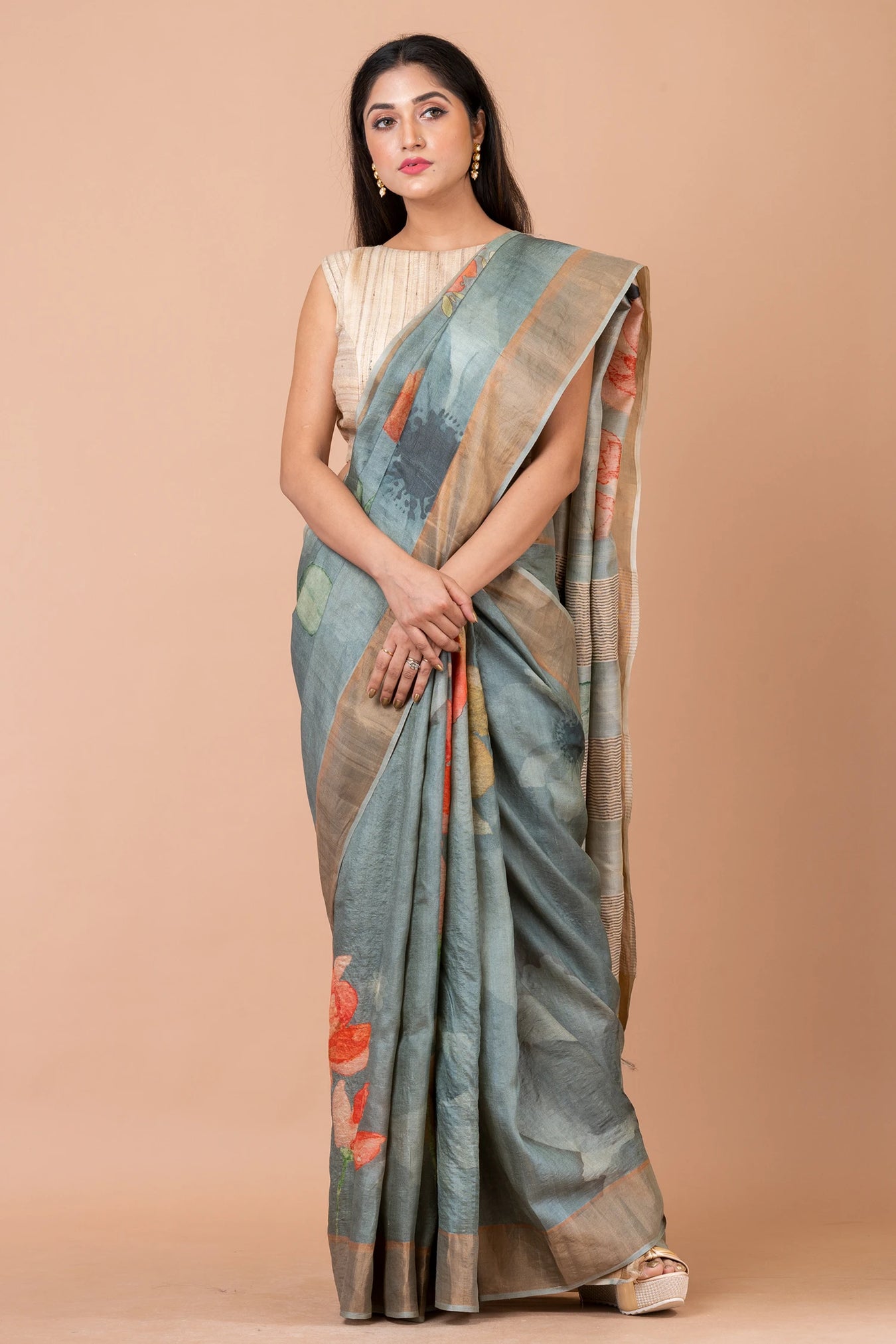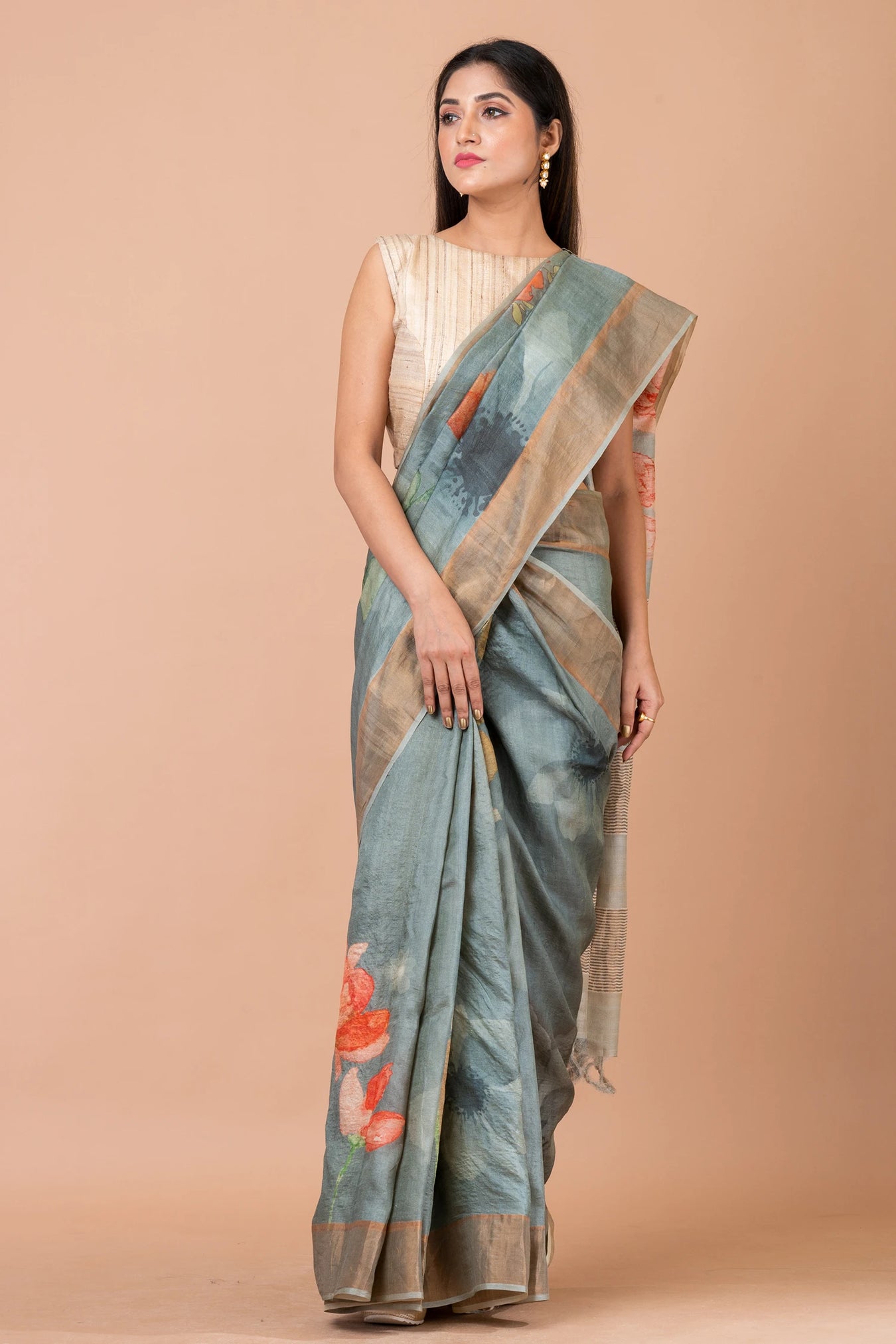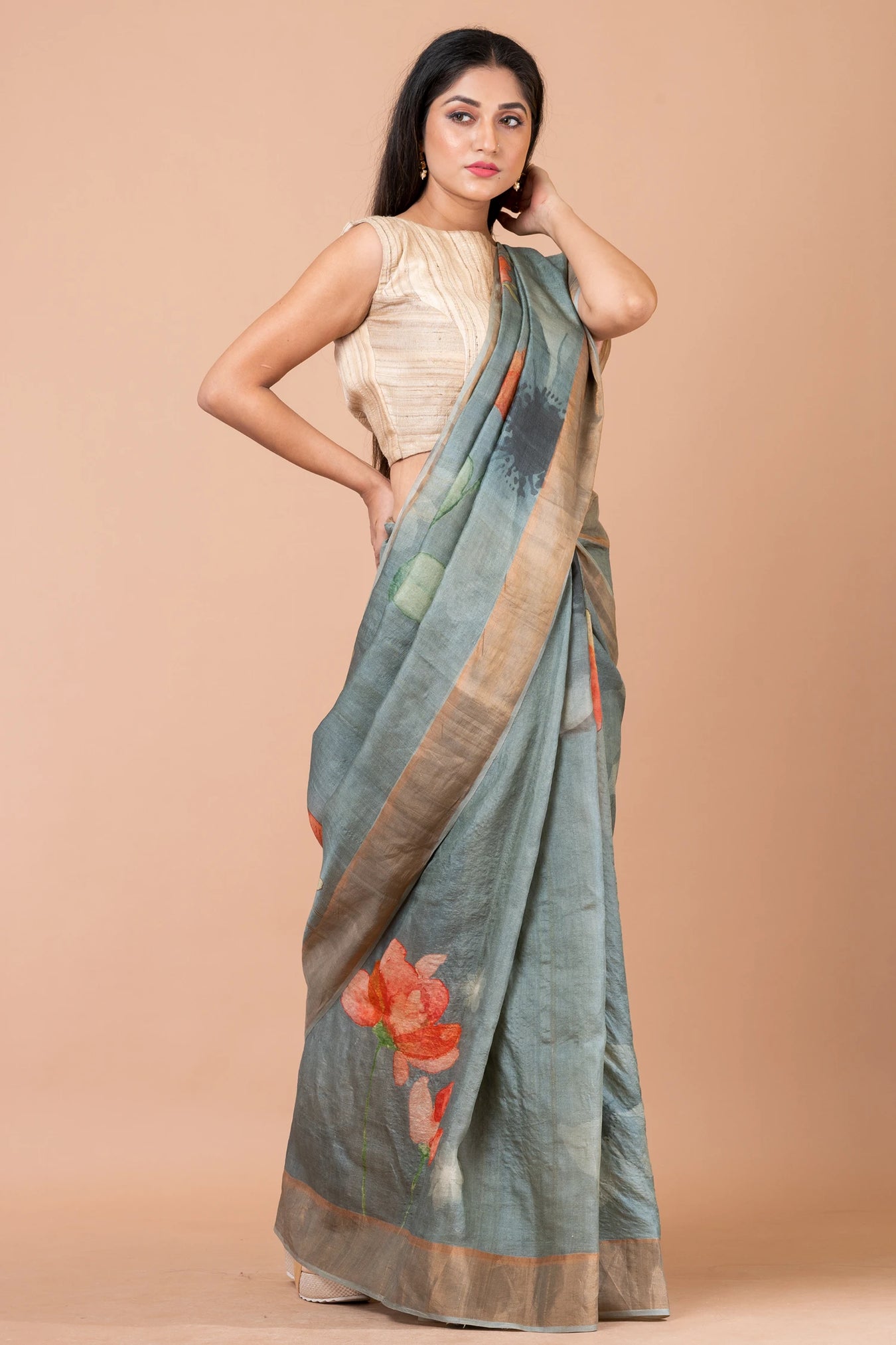 Size: S: 5.50Mtr B: 0.80MtrColour: Steel GreyFabric: Tussar silkPattern and print: Embrace the beauty of nature with big wild watercolor flowers artfully printed on luxurious Tussar silk, accented with a shimmering zari border. Effortlessly exude elegance and charm with this captivating saree, perfect for making a statement at any occasion.Silk purity: Pure Tasar SilkPack contains: 1 Saree, 1 BlouseCare instructions: Dry wash
