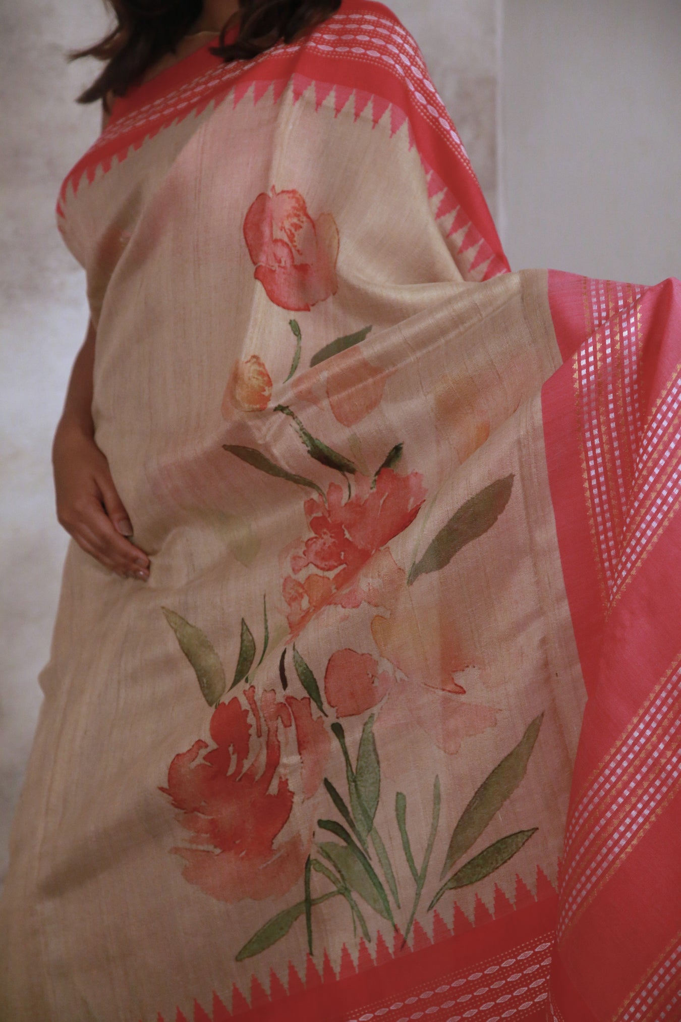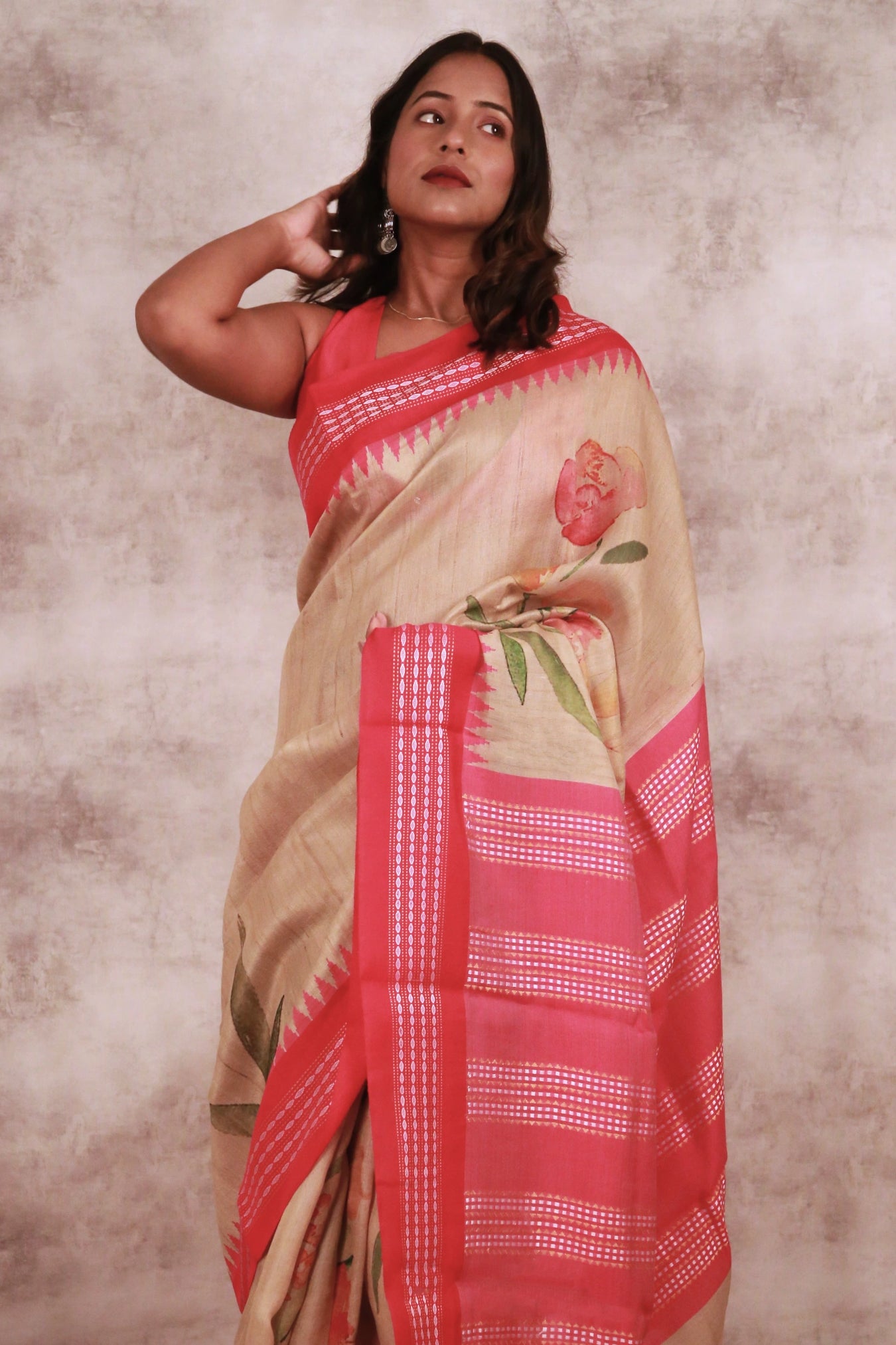 Experience the captivating Soft Tussar Tale saree. Pure Tussar silk, delicate pink border, and soft digital floral print create an elegant charm. Draped in luxury, this exquisite piece blends comfort and style for any occasion.