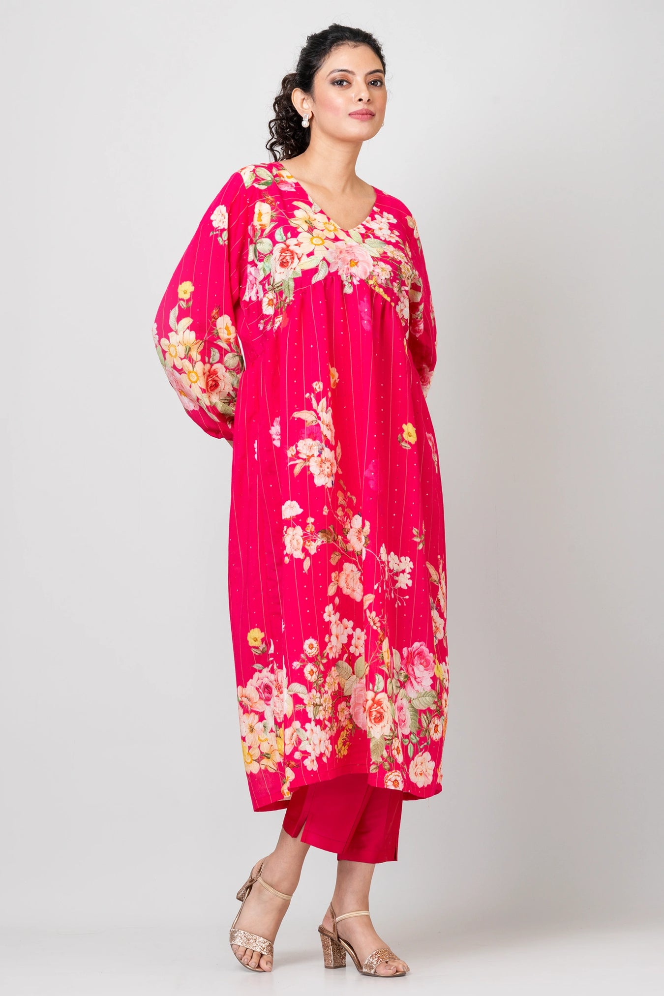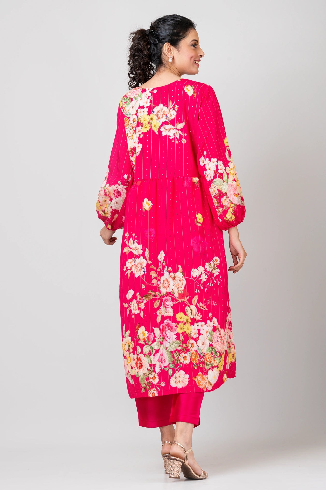 Colour:Â PinkFabric: Sequence Woven Russian crepe, Raw Silk BottomsAttribute:Â Woven sequencePattern and print:Â Celebrate the vivacity of nature with our bright floral print kurta, where the lively colors and patterns illuminate your style with charm and elegance.Purity:Â Natural FabricPack Contains:Â 1 Kurti, 1 PantCare instructions:Â Hand wash