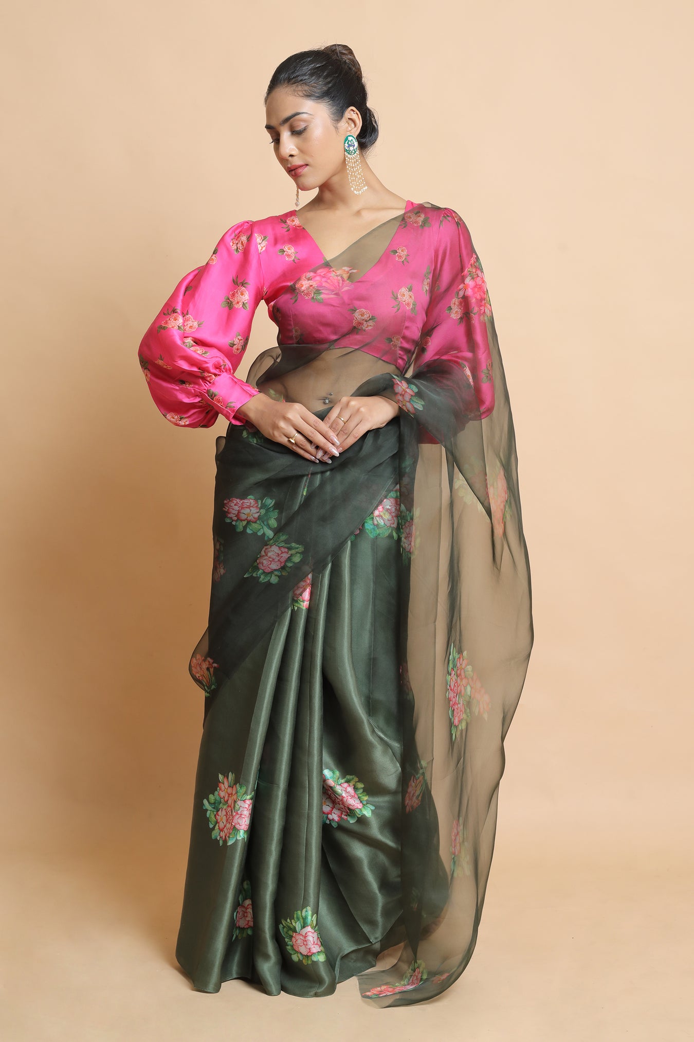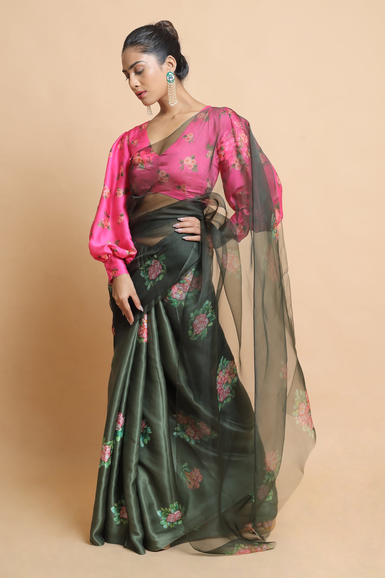 Pattern and print: Indulge in the simplicity and beauty of our half-and-half sari, where the luxurious feel of organza silk meets the smoothness of satin crepe. This saree, in a bottle green shade, is adorned with delicate hand-painted floral digital prints, embodying the essence of pure femininity. The most gorgeous blend of Organza Silk and Satin Crepe with an alluring and seductive Black base with rose prints. Pair it with a beautiful retro blouse to make you look like a million bucks.