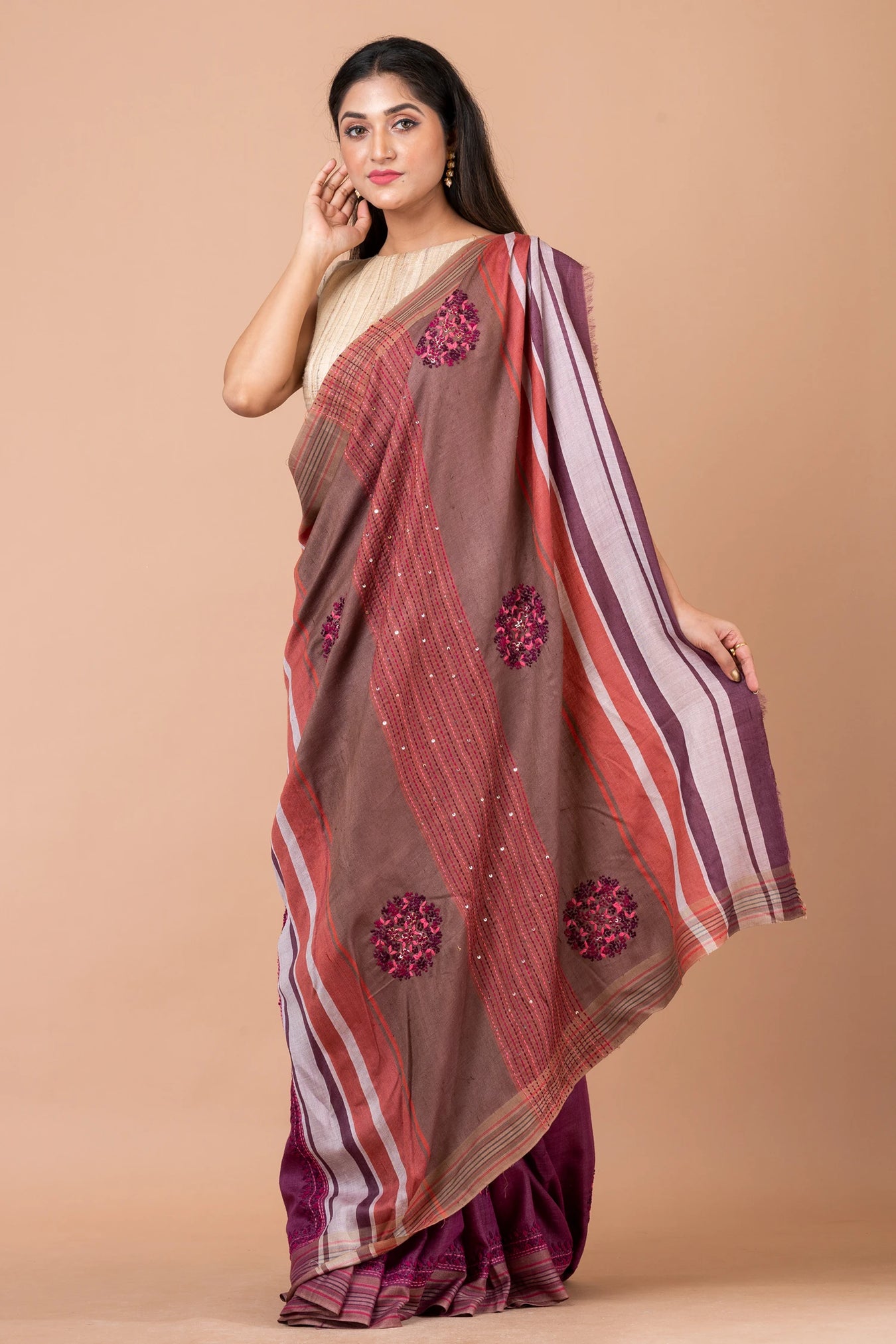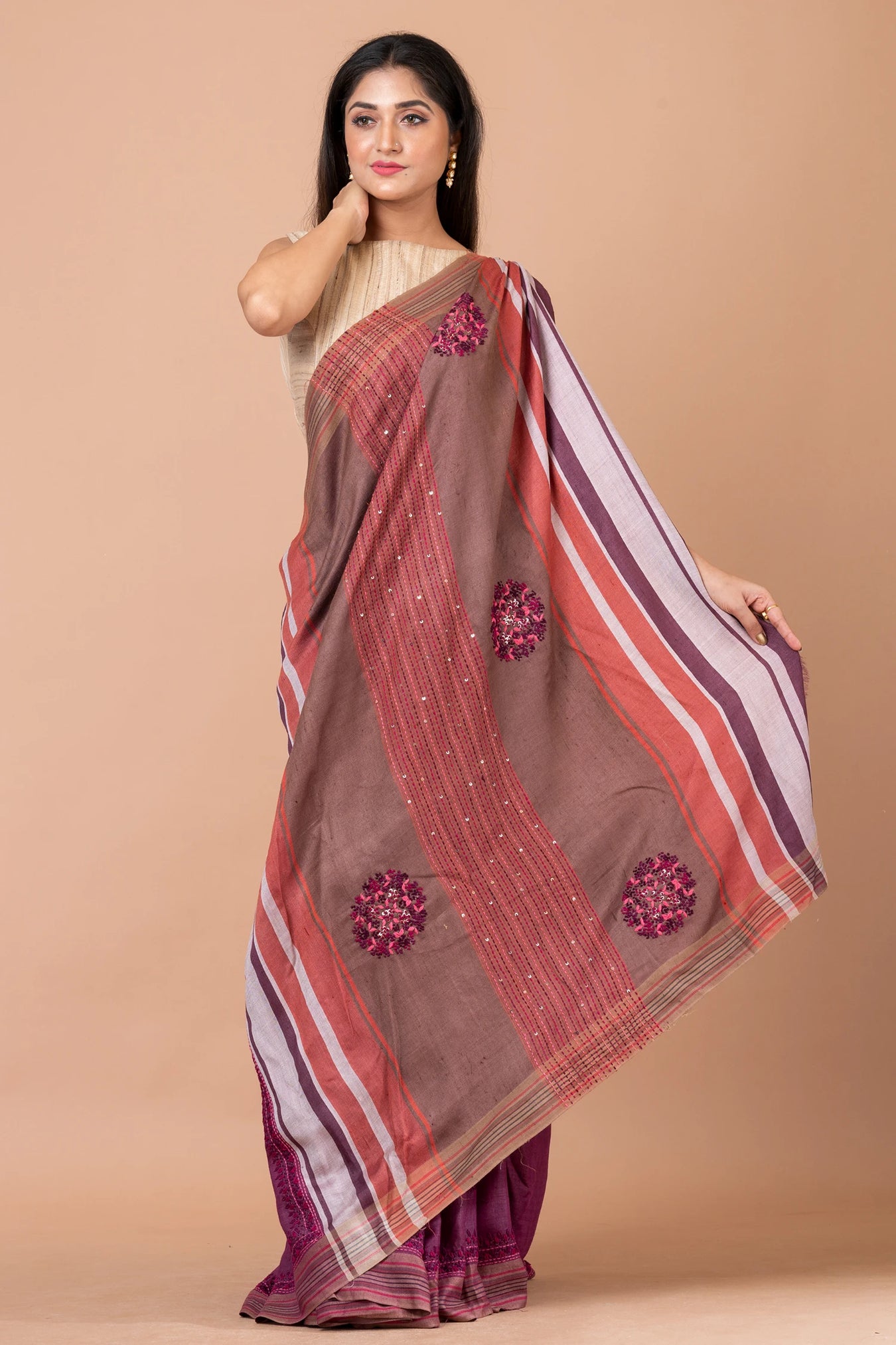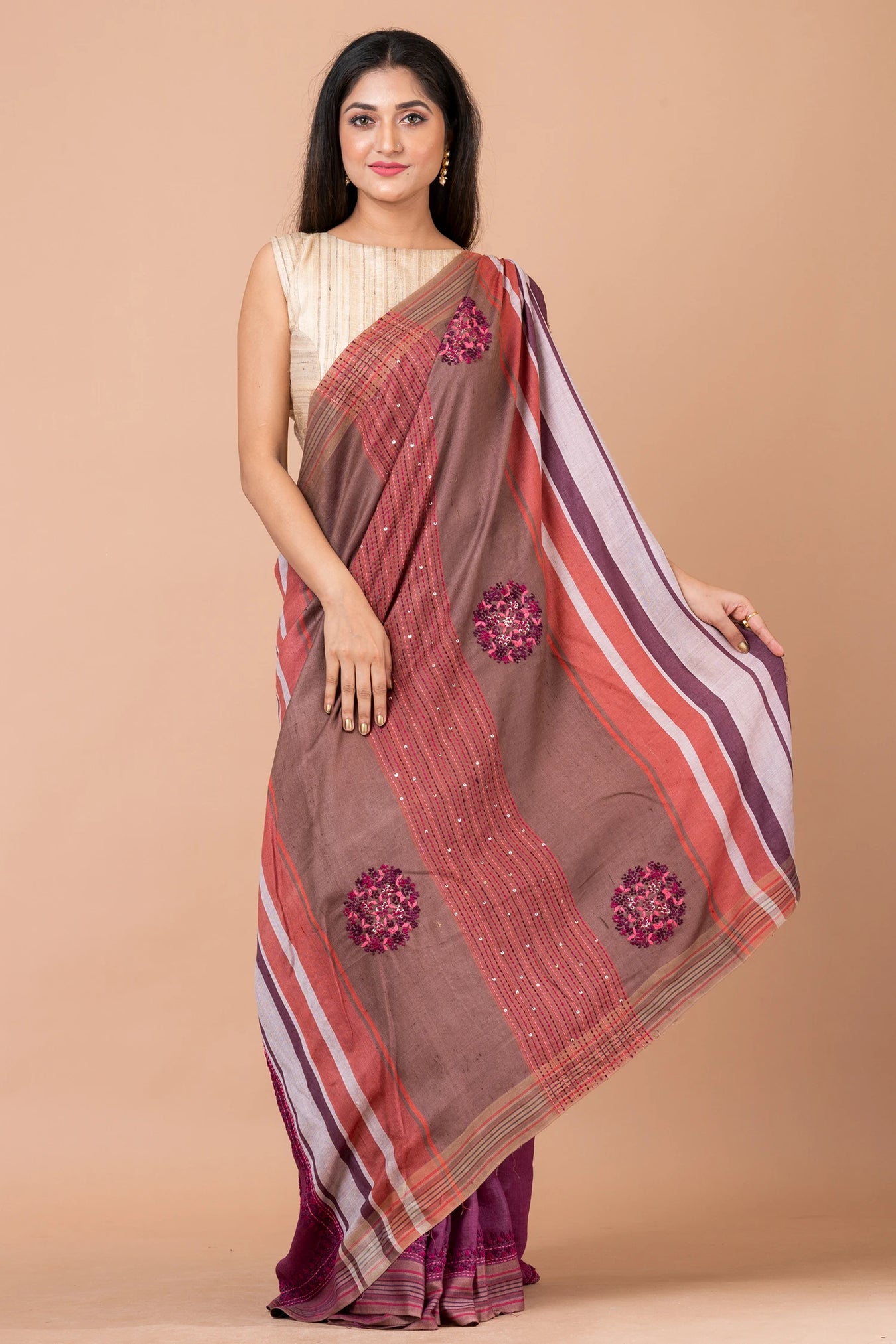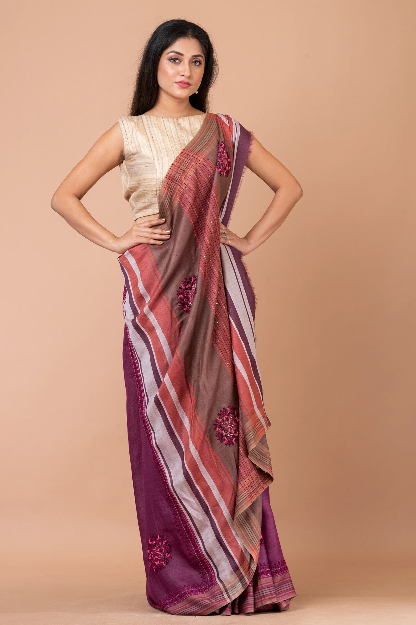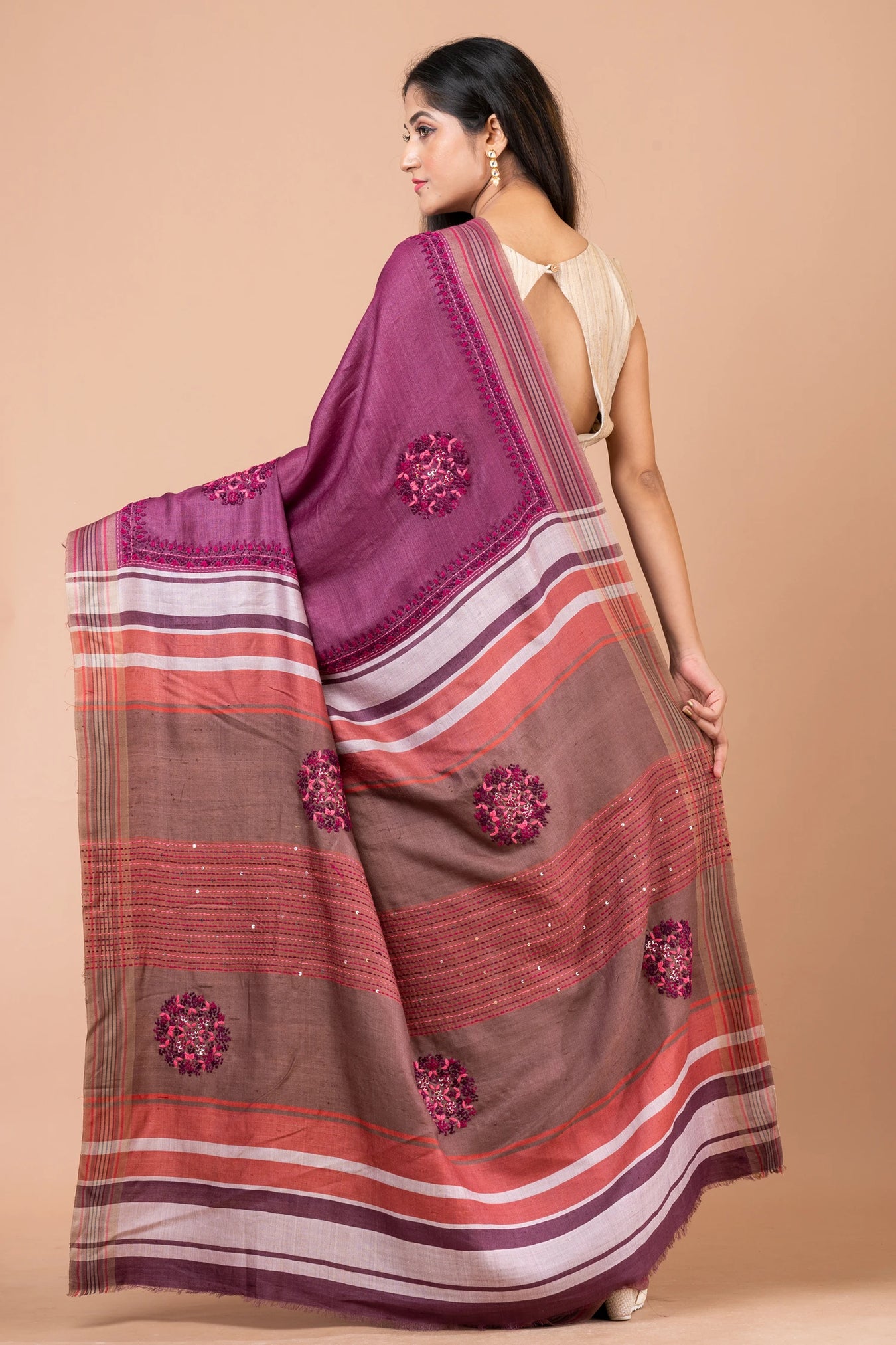 Size: S: 5.50Mtr B: 0.80MtrColour: PurpleFabric: Mulburry Tasar Silk Handloom wovenAttributes: Kantha stitch, woven sequence and hand floral embroideryPattern and print: Elevate your style with our captivating floral embroidery saree, adorned with delicate strips and woven sequins, where artistry meets modern elegance in one enchanting ensemble.Pack contains: 1 Saree, 1 BlouseCare instructions: Dry wash