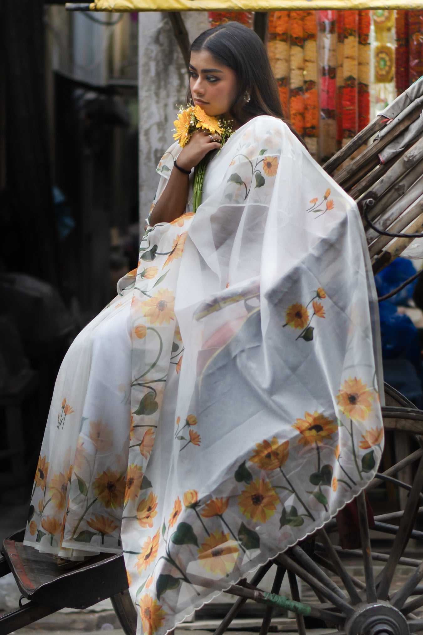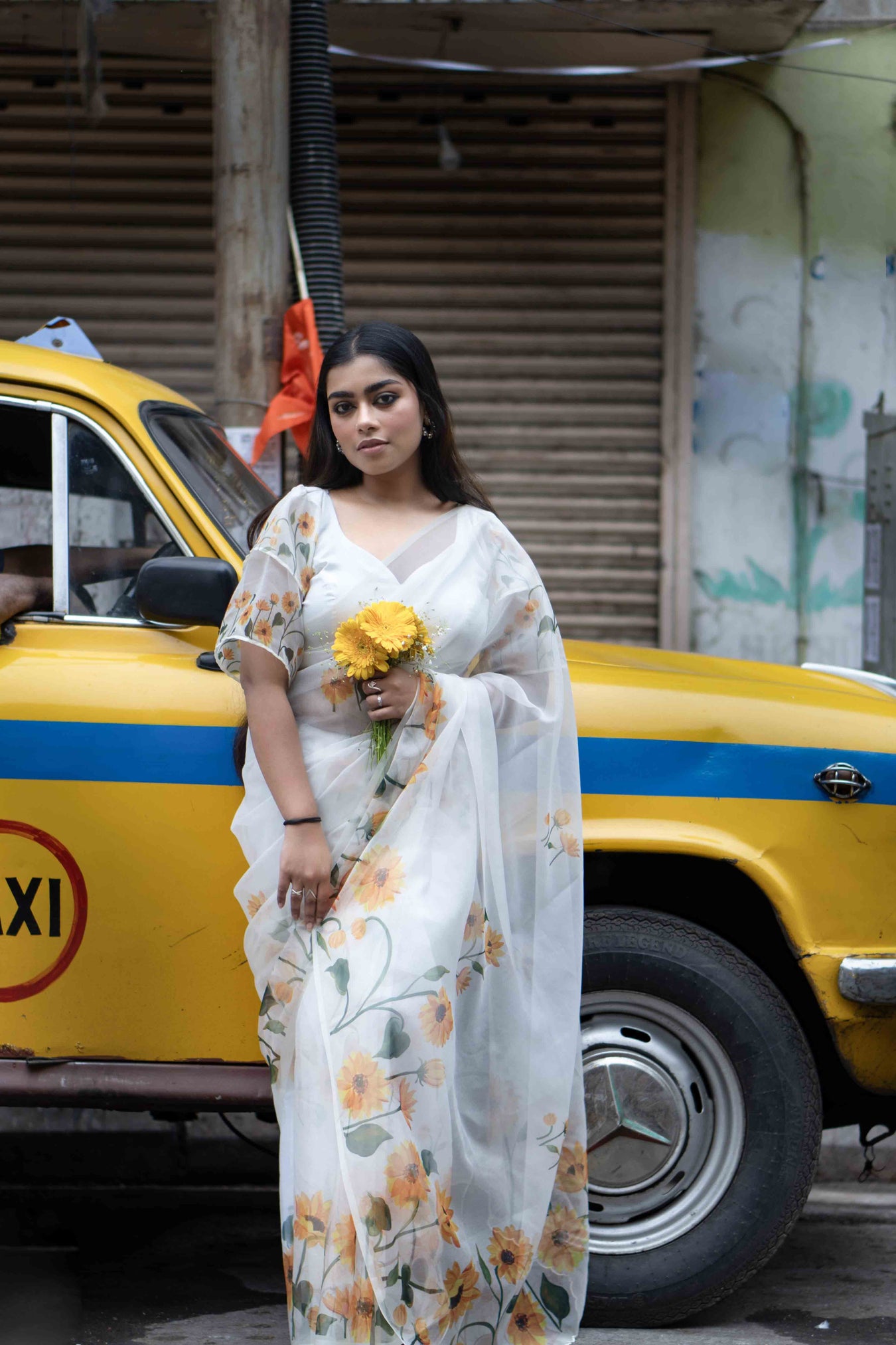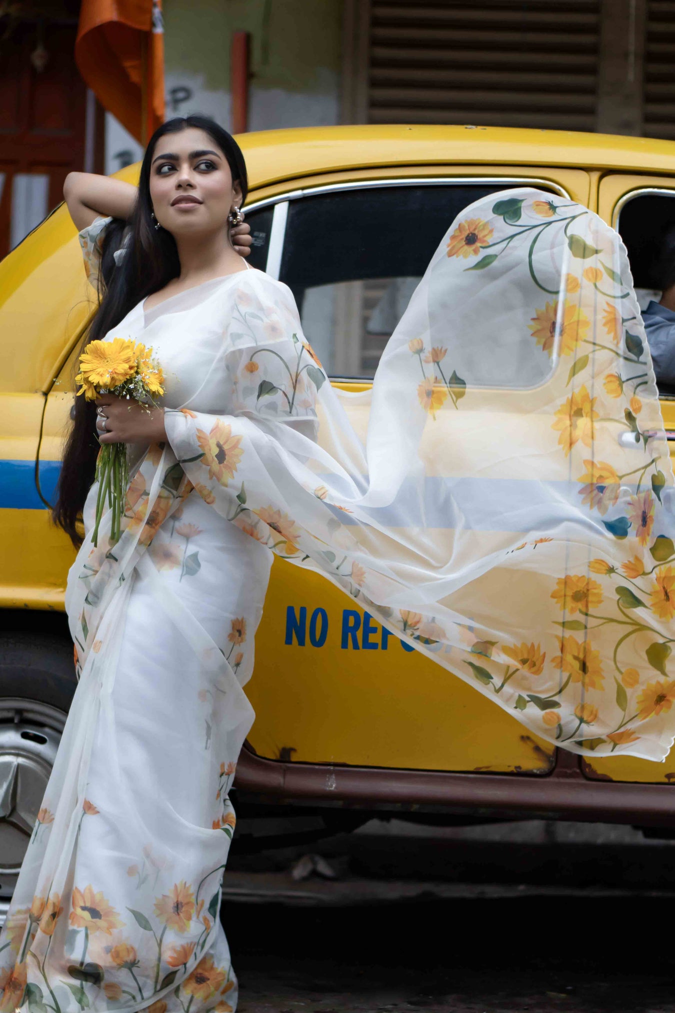 Size: S: 5.50Mtr B: 0.80MtrColour: WHITEFabric: ORGANZAAttributes: Pattern and print: The white organza saree embodies elegance with its delicate and lightweight fabric. The allure is heightened by the striking yellow sunflower design spread across the entire saree, making it an exquisite choice for any special occasion. Pack contains: 1 Saree, 1 BlouseCare instructions: Dry wash