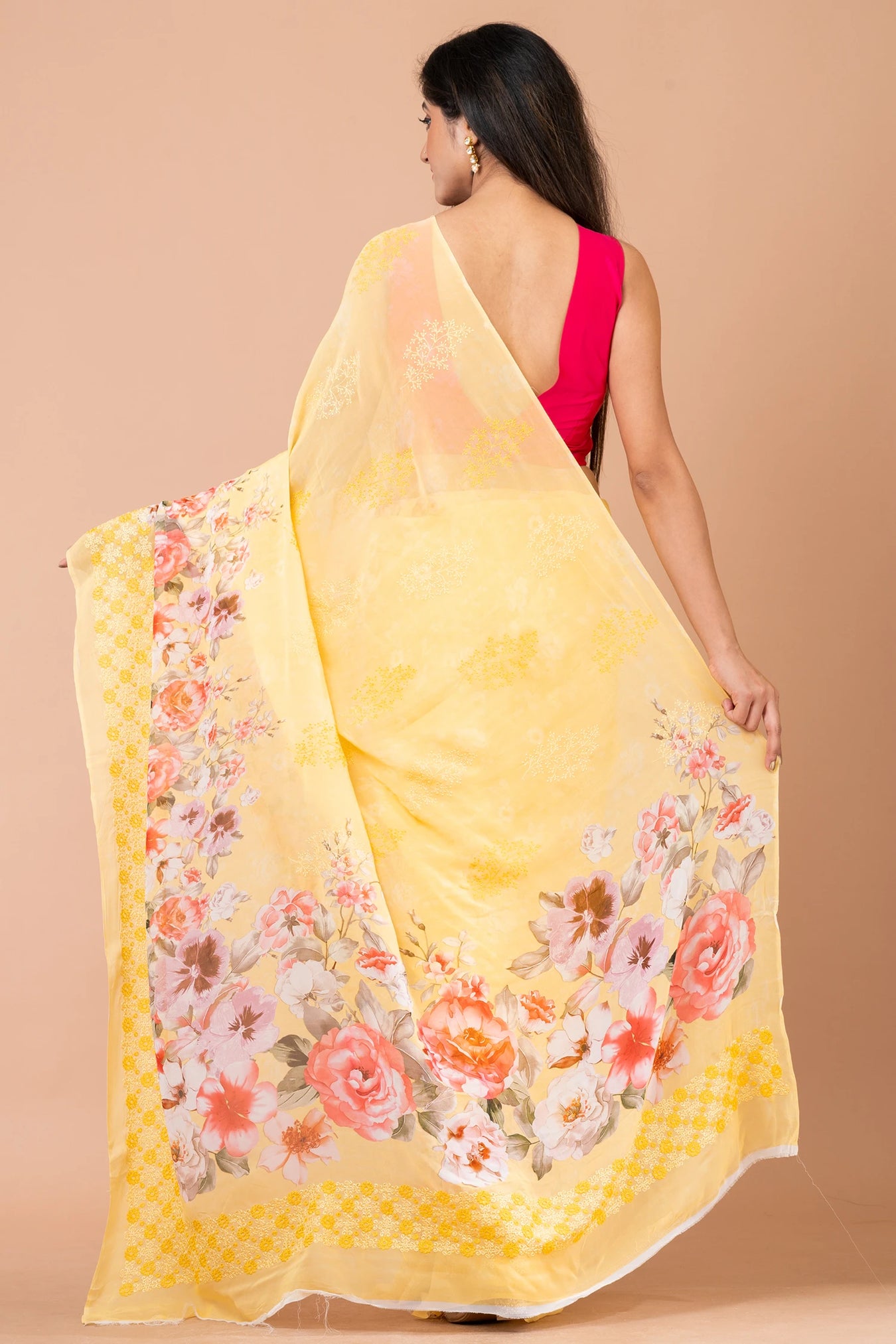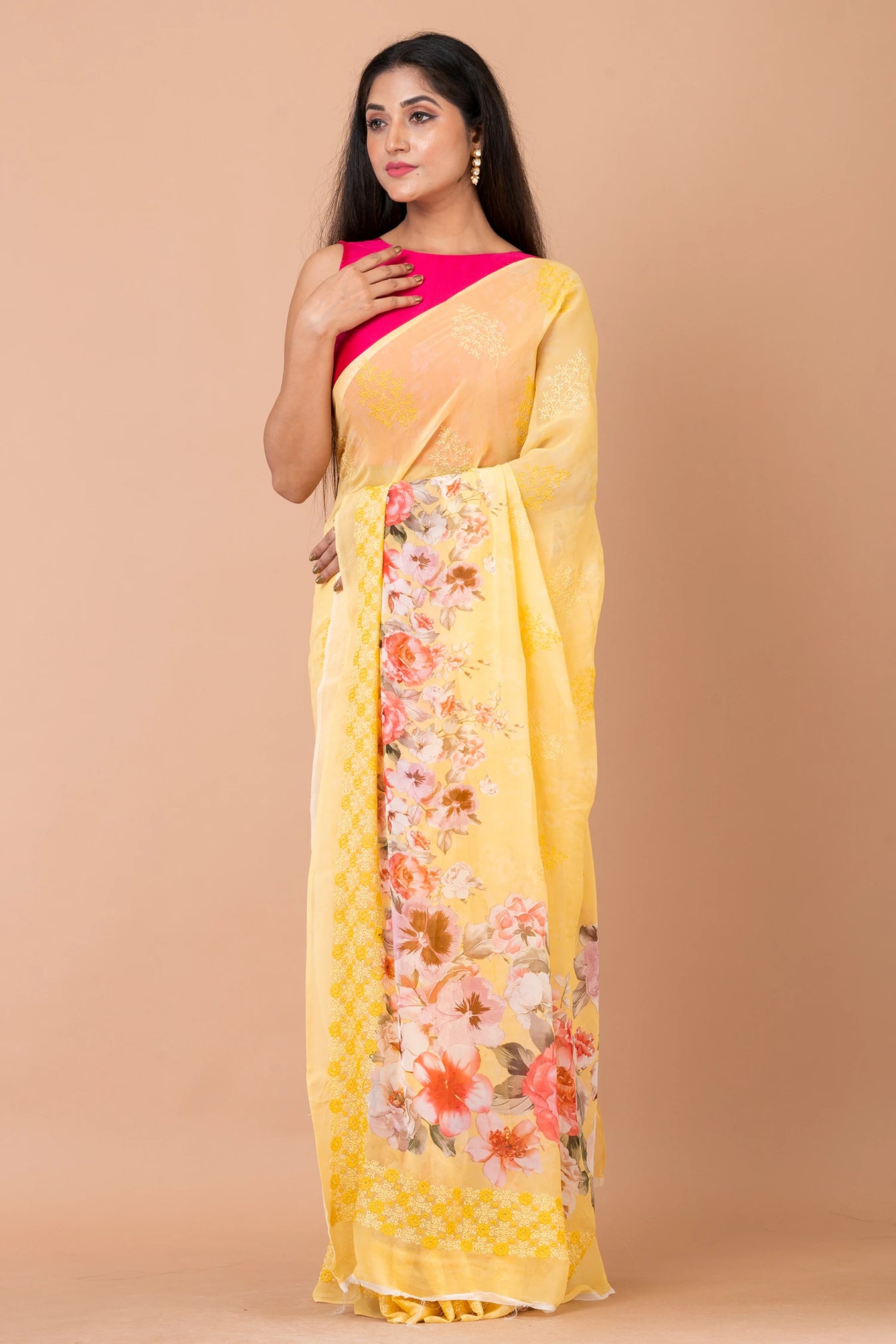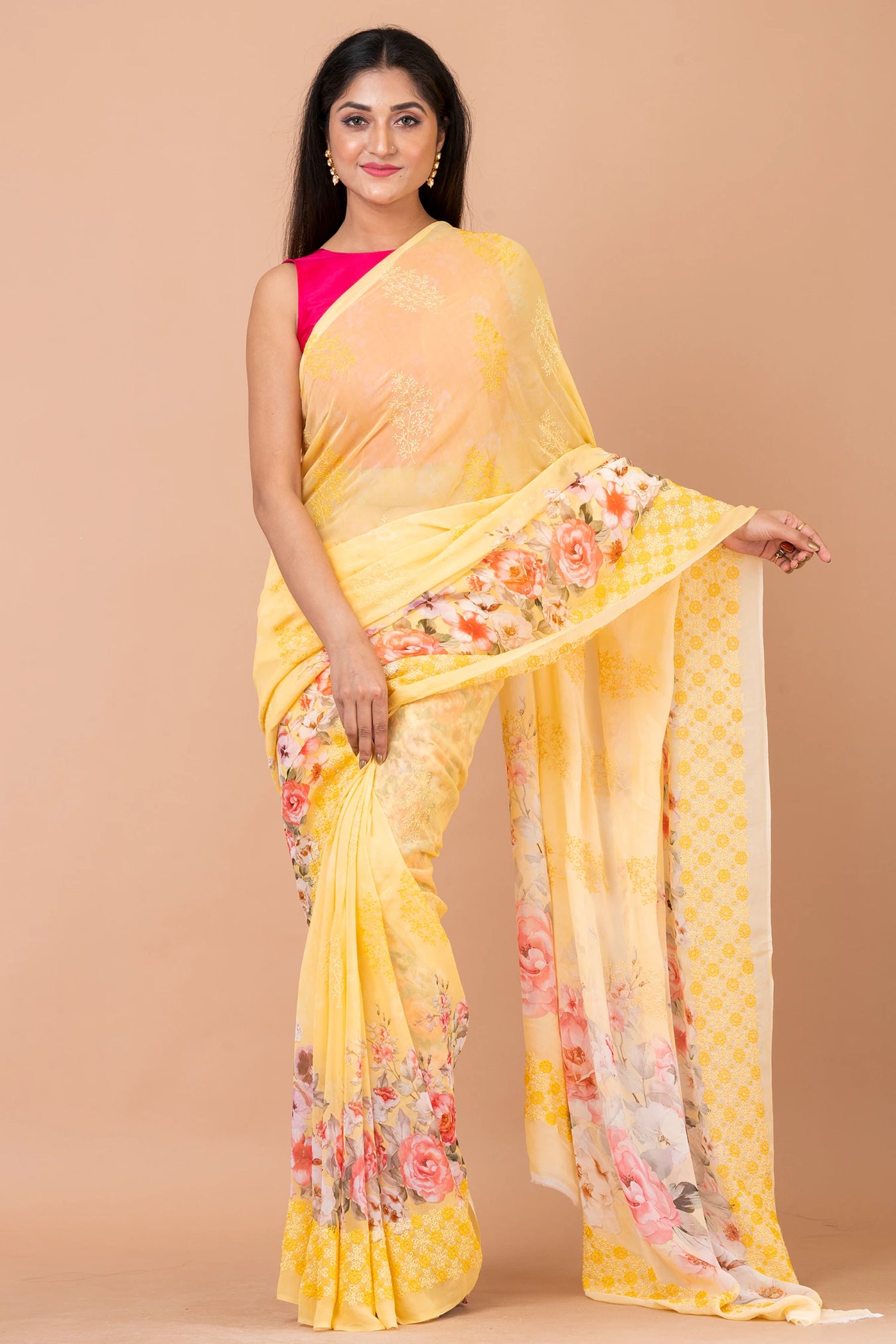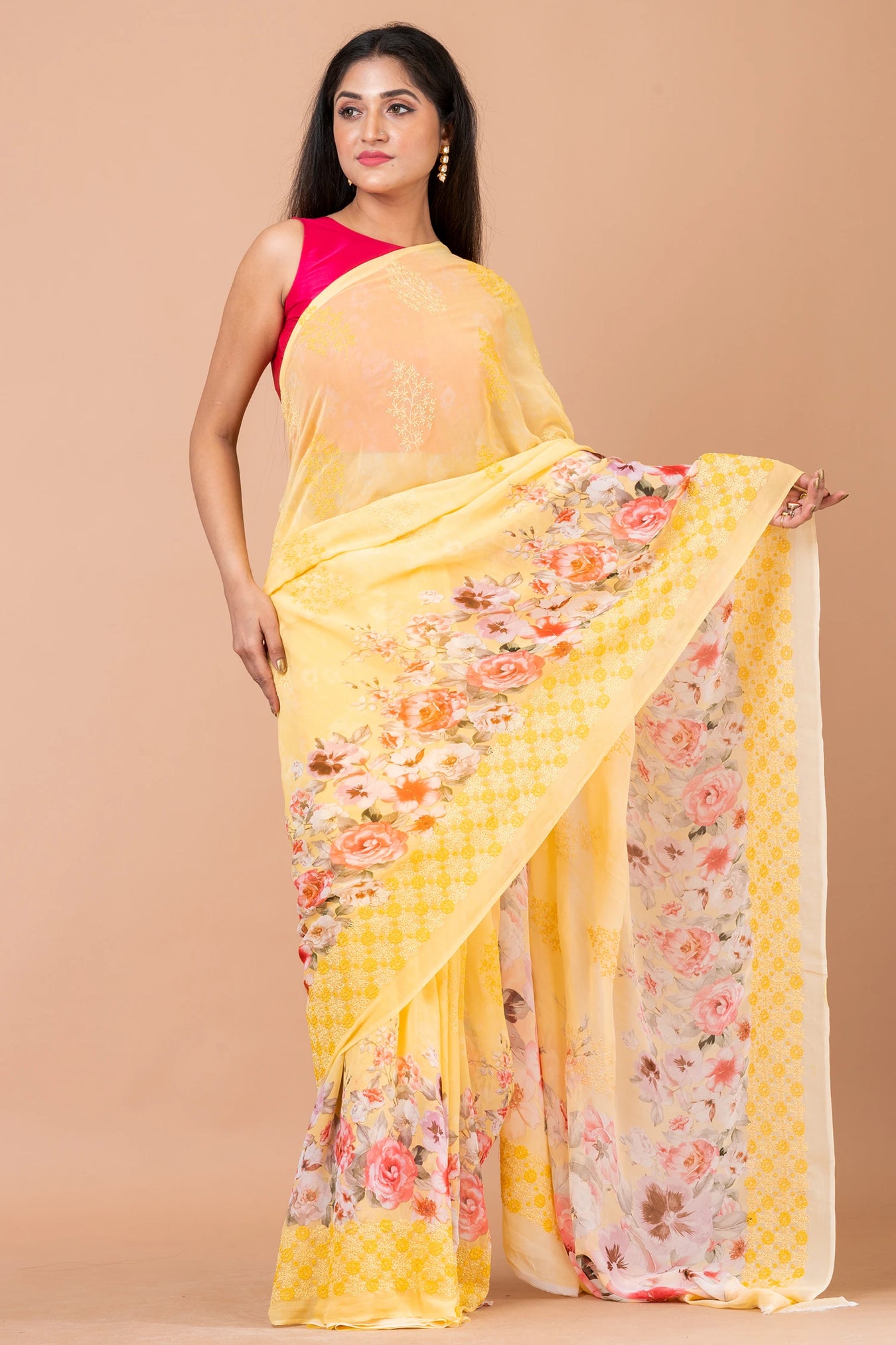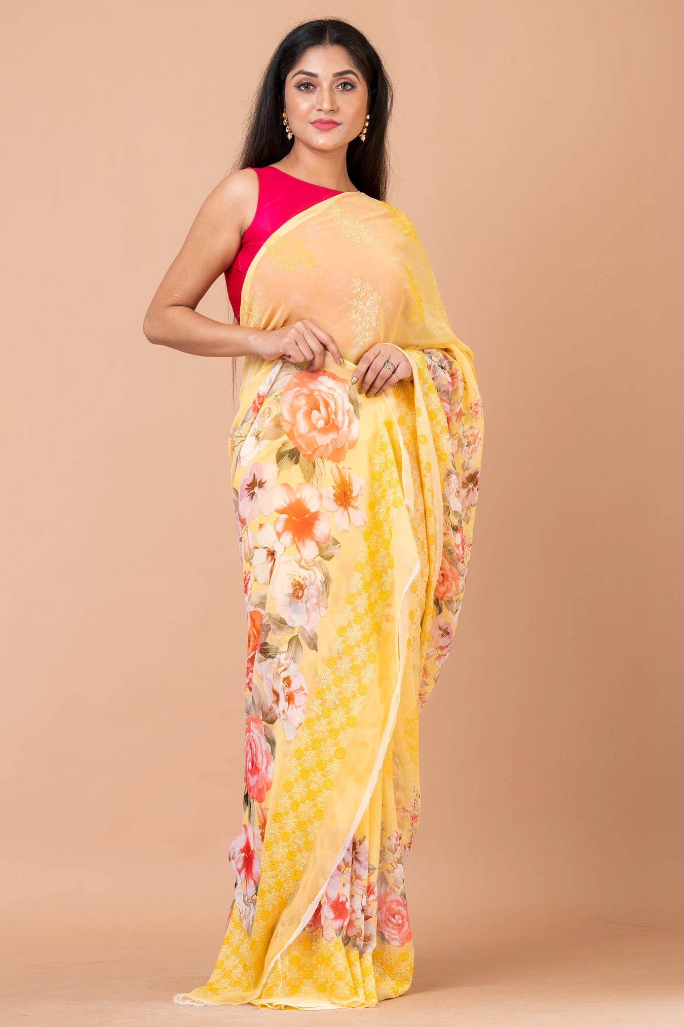 Size:Â S: 5.50Mtr B: 0.80MtrColour:Â YellowFabric: GeorgetteAttributes: Self thread embroideryPattern and print:Â Wrap yourself in the elegance of our saree featuring a bouquet of roses and other flowers for a super wide border, where the charm of floral motifs meets opulence, creating a captivating and luxurious ensemble that celebrates the beauty of nature's blooms. beauty meets craftsmanship with self-thread embroidery delicately adorning the entire fabric. The meticulous self thread embroidery all over the body adds a touch of opulence and sophistication, enhancing the saree's allure.Purity:Â Natural FabricPack contains:Â 1 Saree, 1 BlouseCare instructions:Â Dry wash