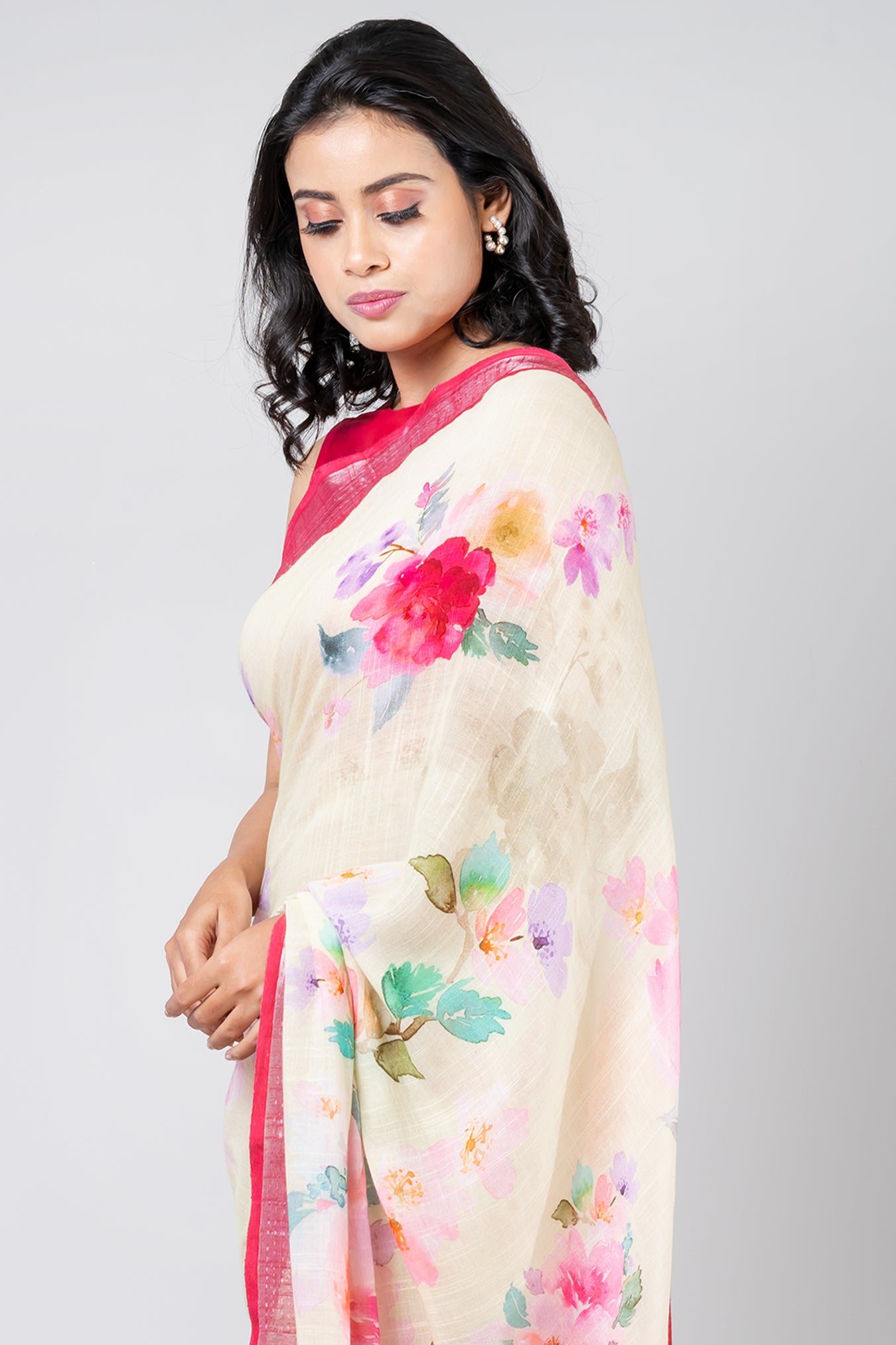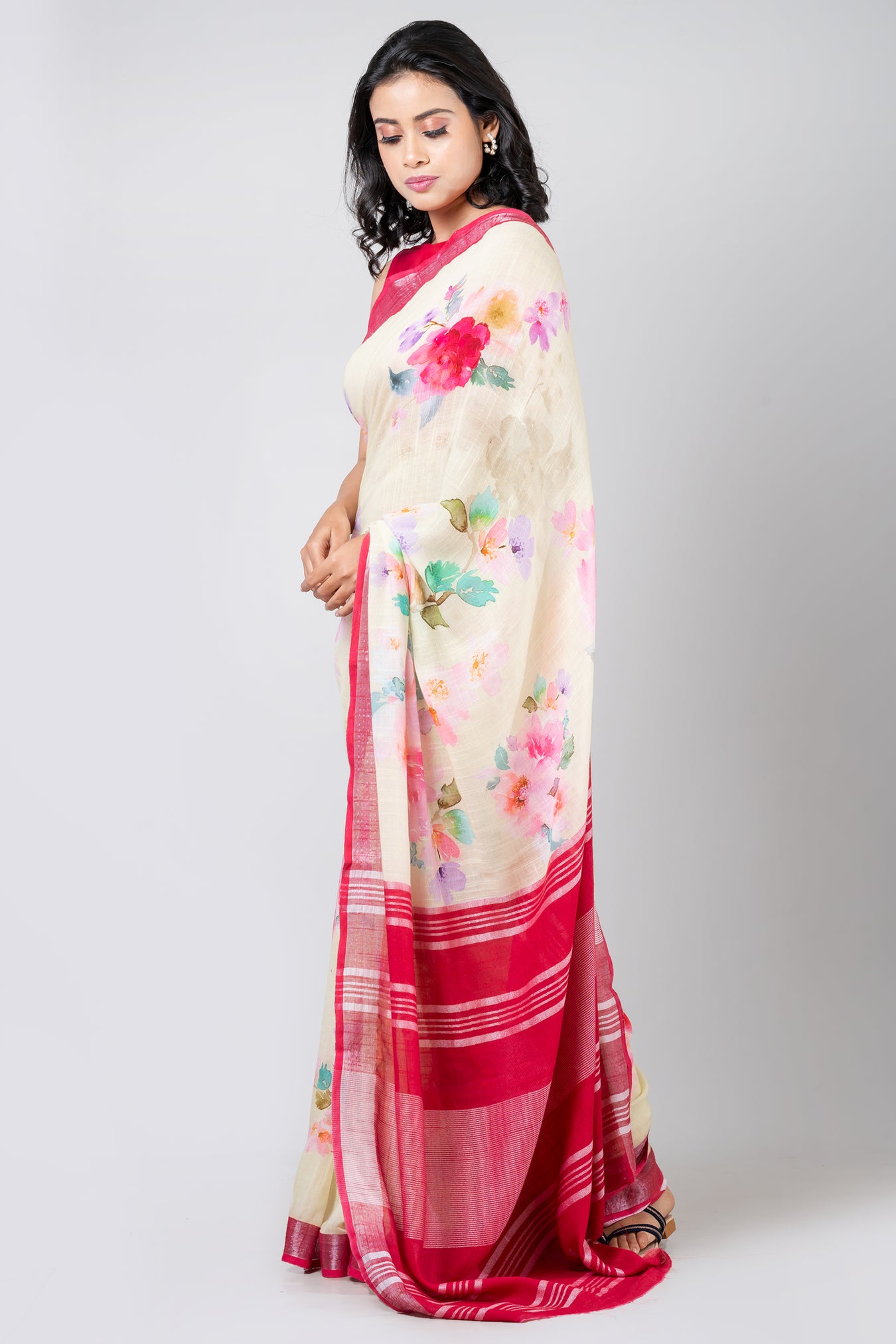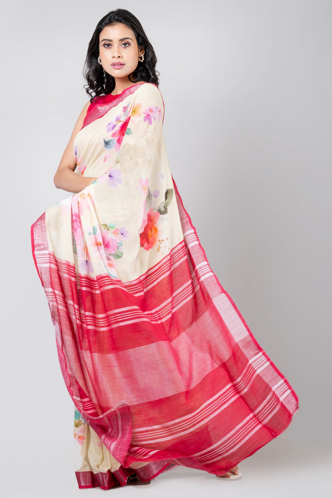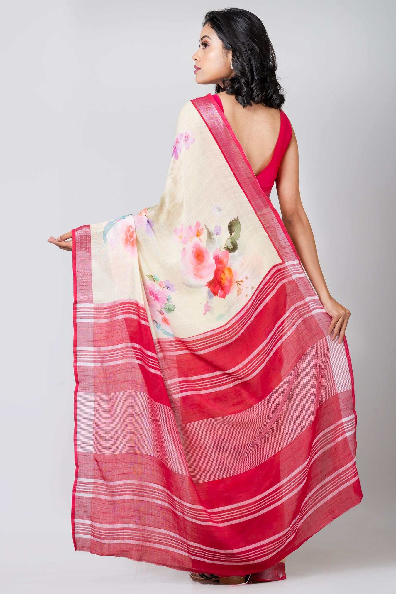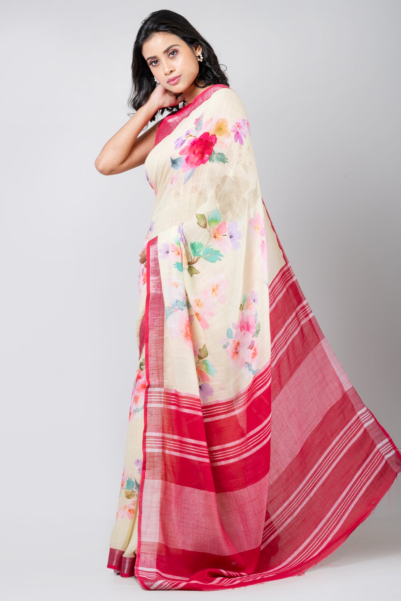 Size: S: 5.50Mtr B: 0.80MtrColor: LIGHT YELLOWFabric: LINENPattern and print: the light yellow saree with a bold red border and floral print offers a delightful contrast, blending elegance with a touch of vibrancy. It's a charming choice for those seeking a refreshing yet classic look.Pack contains: 1 Saree, 1 BlouseCare instructions: Dry wash