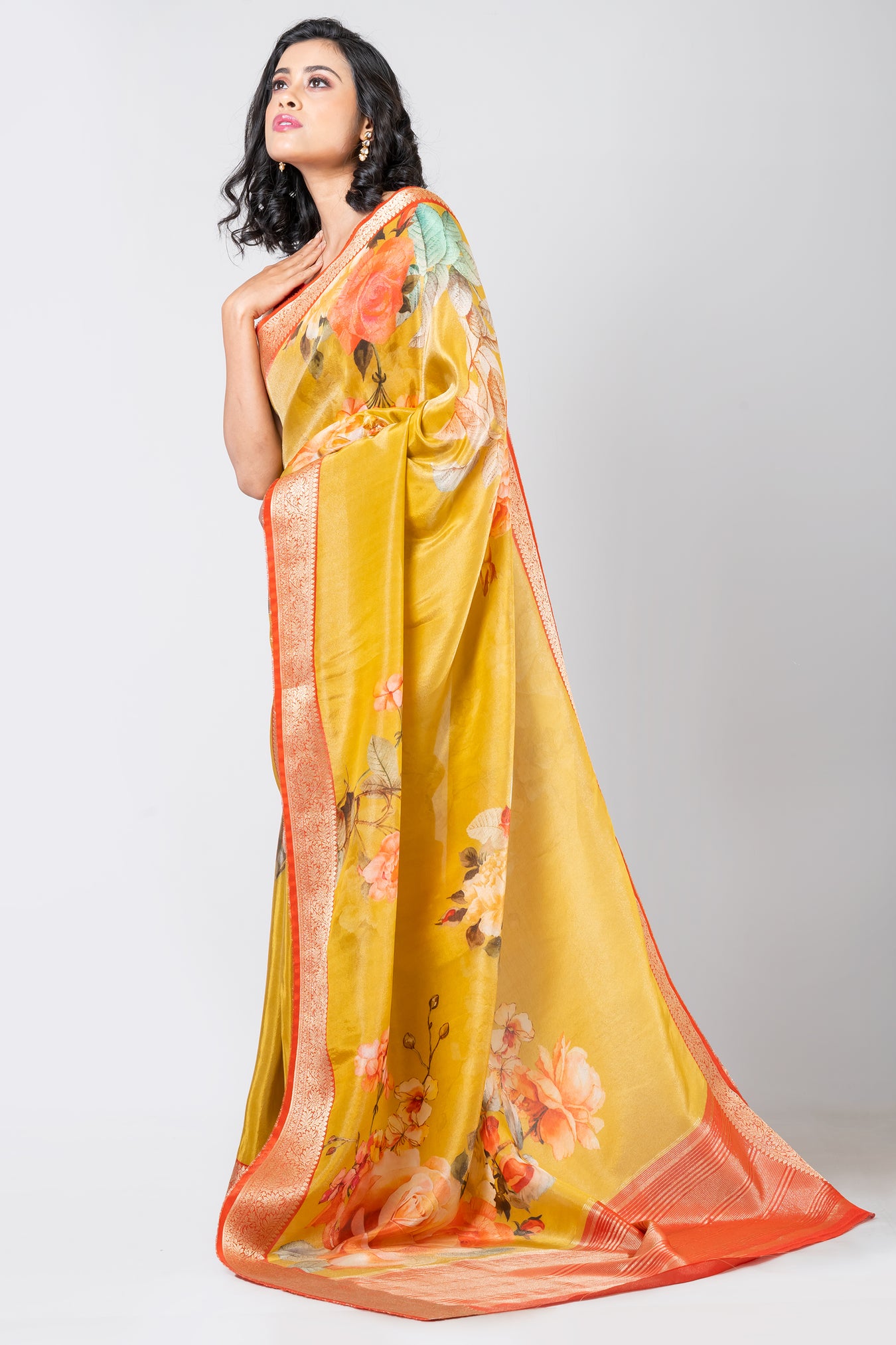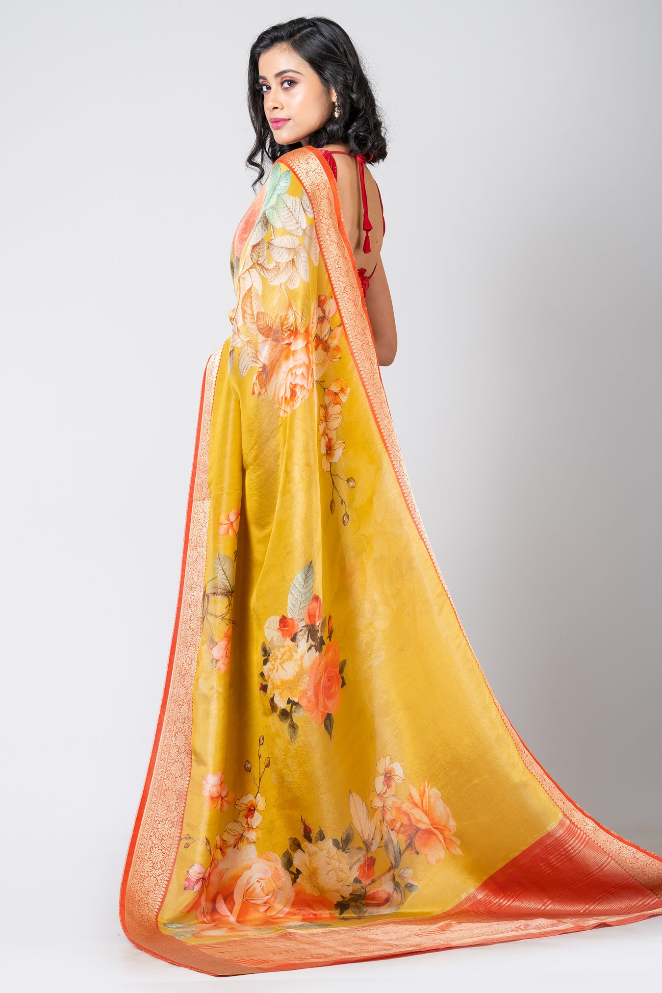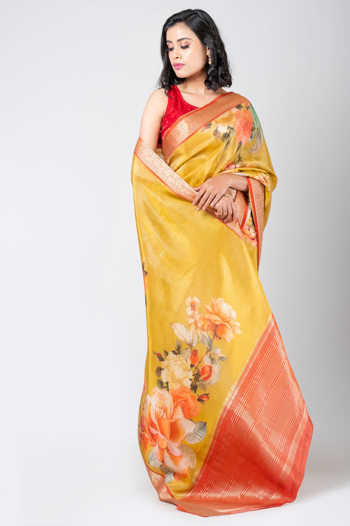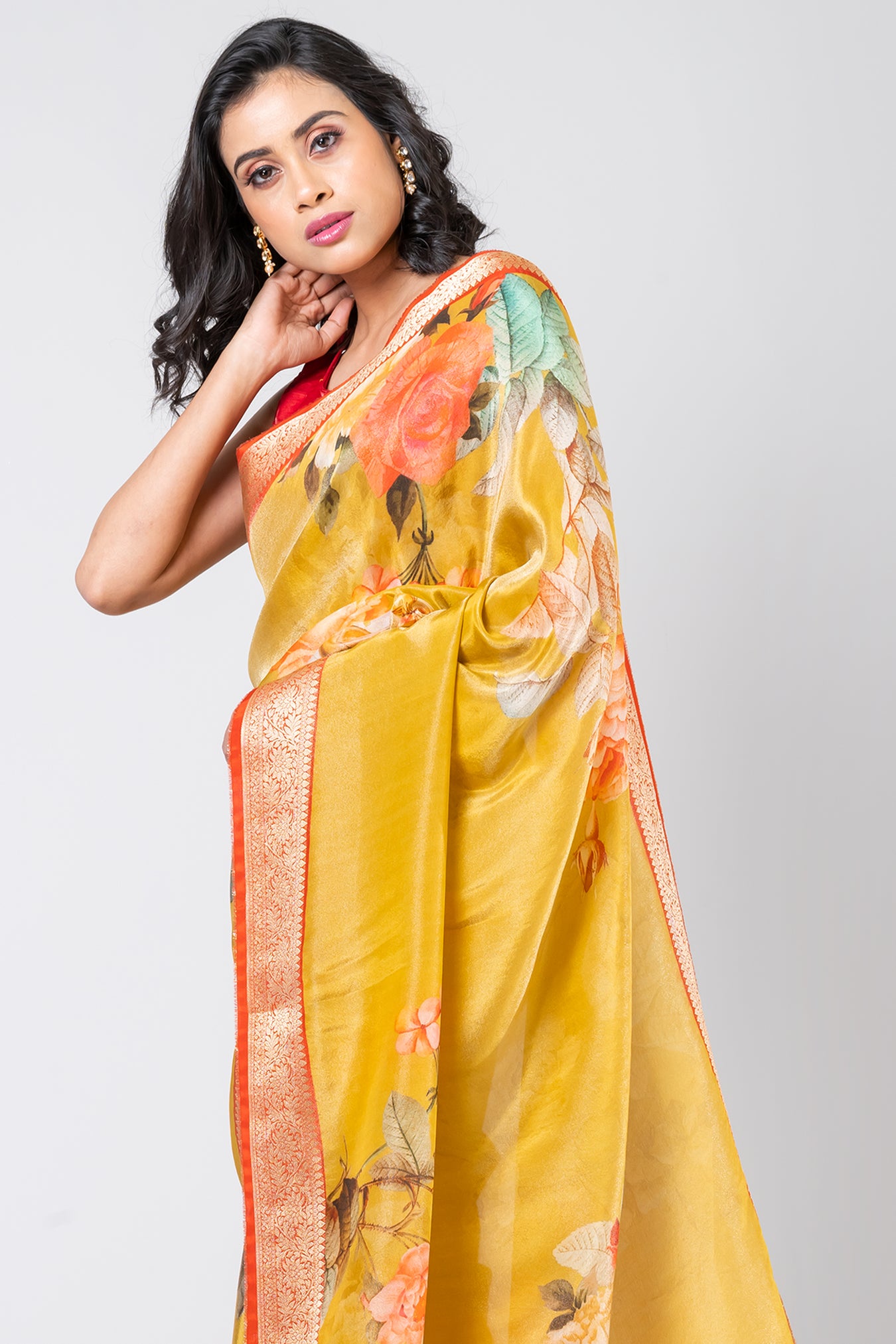 Size: S: 5.50Mtr B: 0.80MtrColour: YELLOWFabric: ORGANZA TISSUE ZARIPattern and print: The yellow organza tissue zari saree epitomizes sophistication with its understated color and graceful zari border. Enhanced with intricate flower designs, it exudes vibrancy and effortlessly captivates attention wherever you go.Silk purity: Pack contains: 1 Saree, 1 BlouseCare instructions: Dry wash