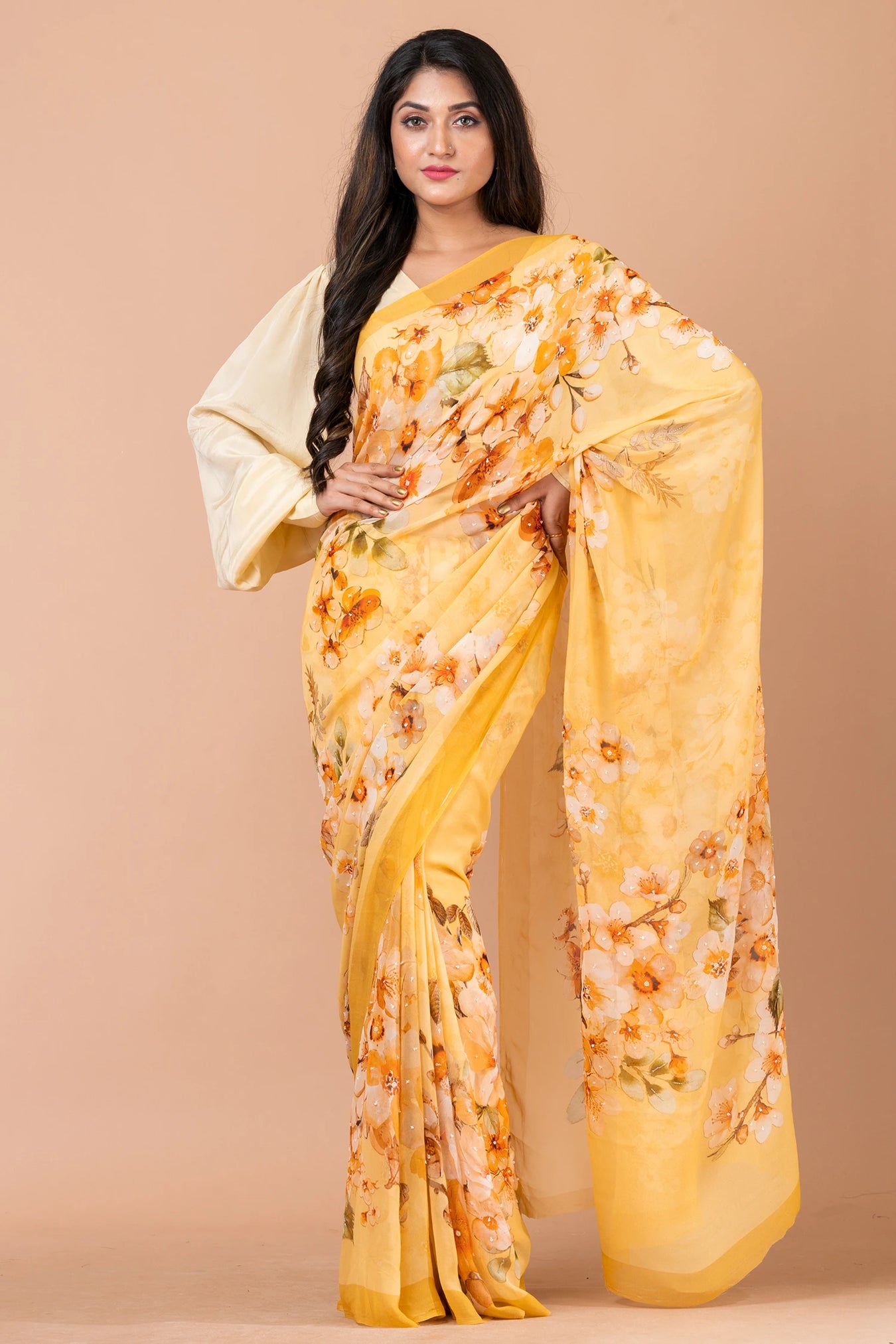 Size: S: 5.50Mtr B: 0.80MtrColour: YellowFabric: GeorgetteAttributes: Highlighting sequence emblishment Pattern and print: Embrace the ethereal charm of our cherry blossom saree with exquisite embellishments, where delicate blooms meet artful adornments, creating a captivating and enchanting ensemble that celebrates the beauty of nature and style.Purity: Natural FabricPack contains: 1 Saree, 1 BlouseCare instructions: Dry wash
