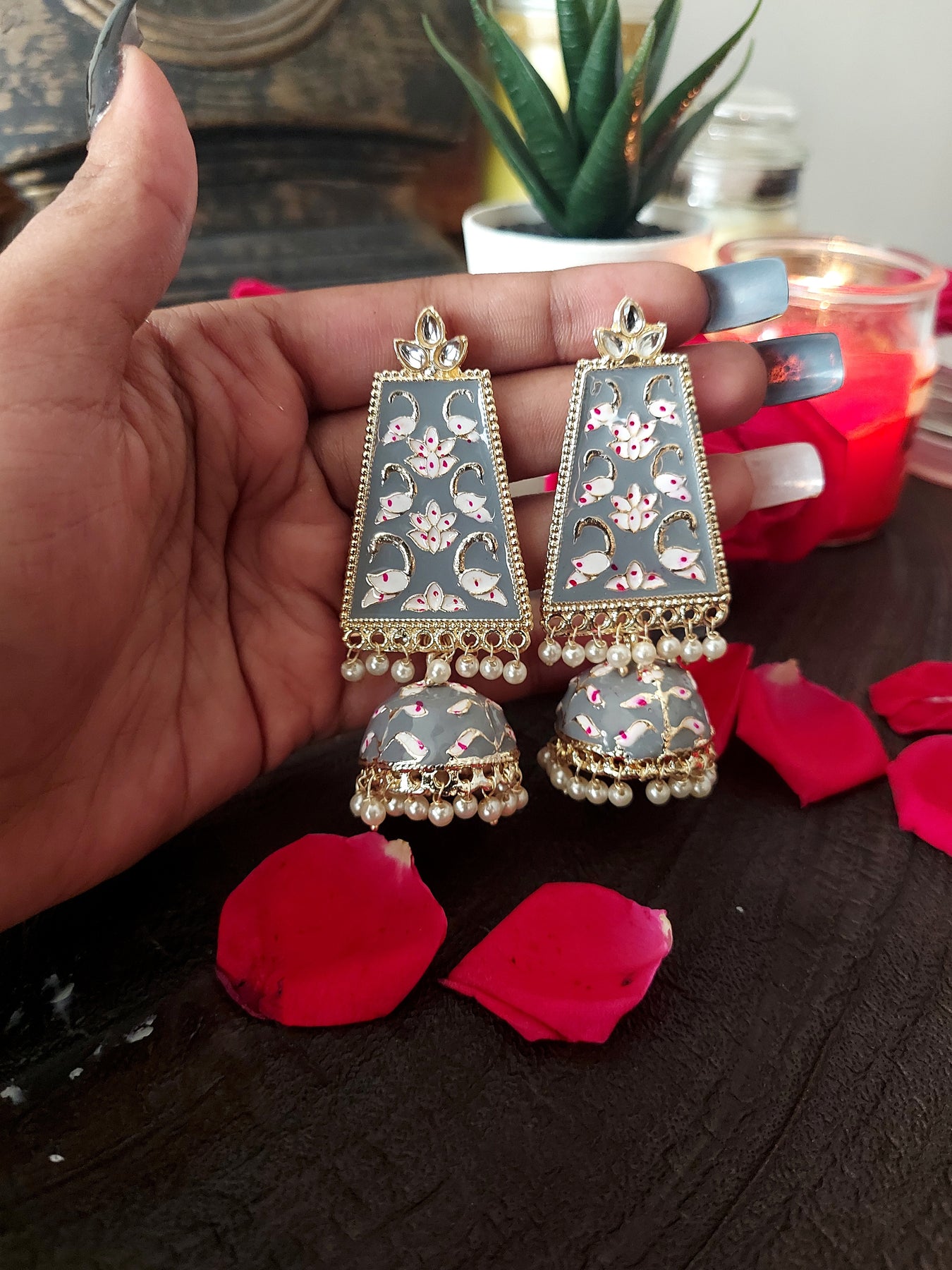 Silver finish modern style jhumka, complimented with white beads and intricate work, in a shade of teal blue.