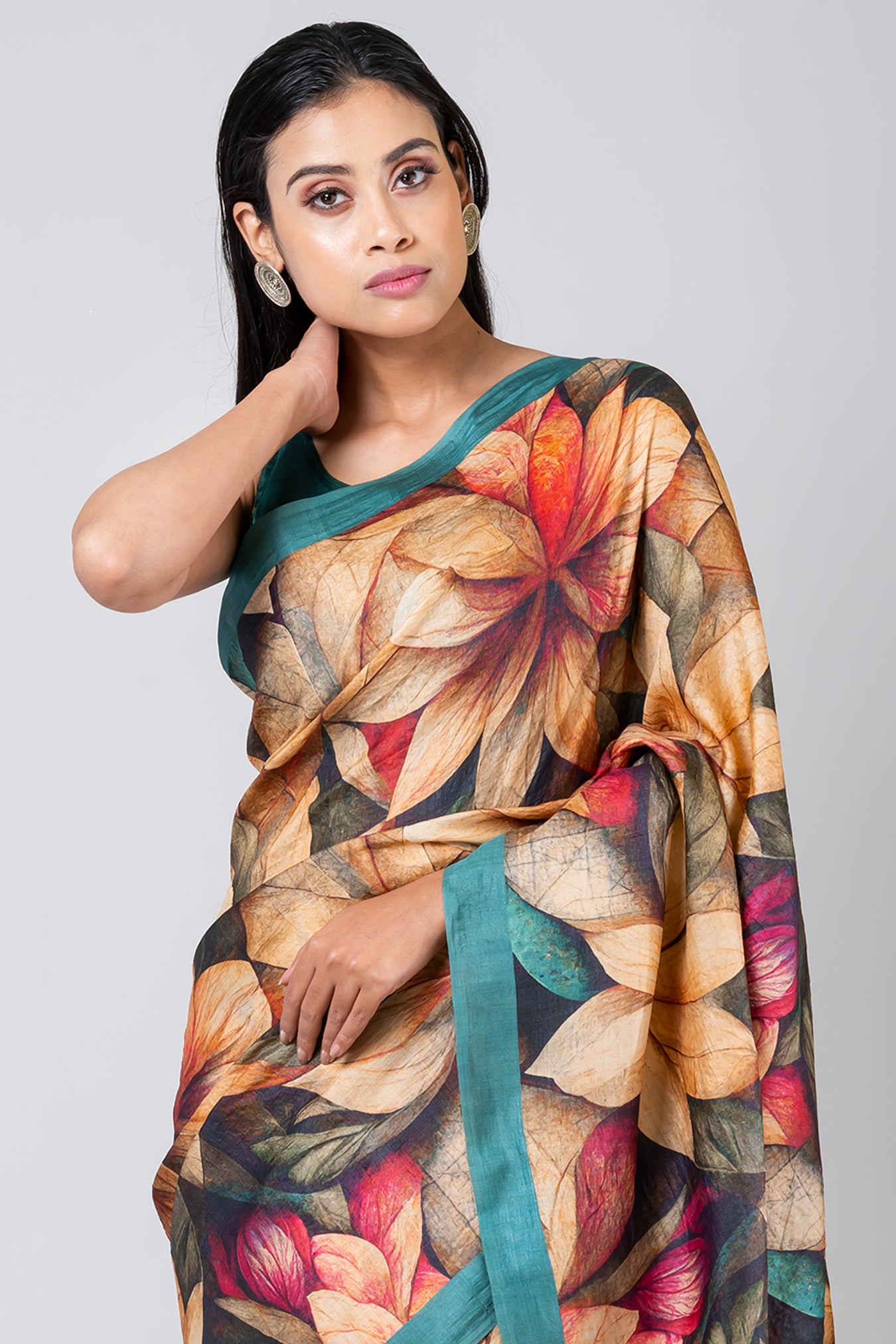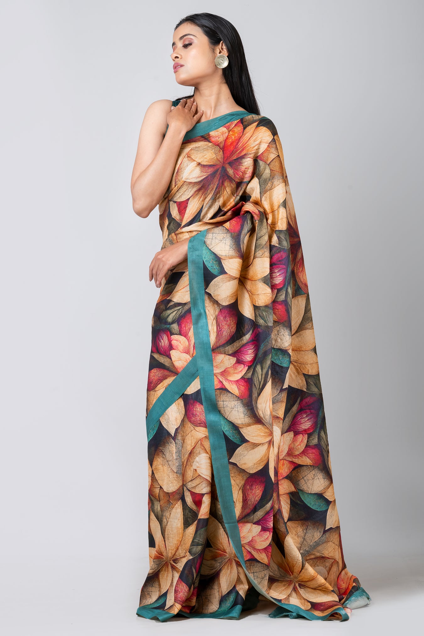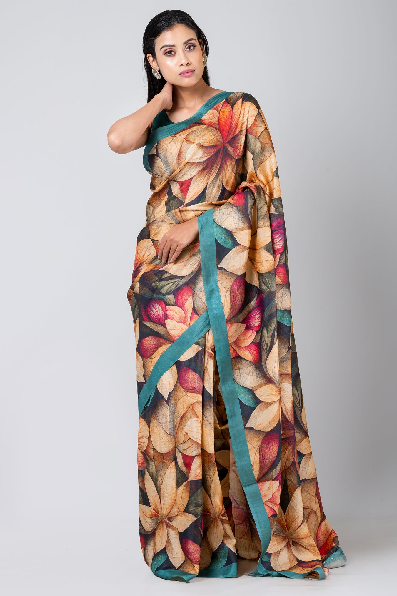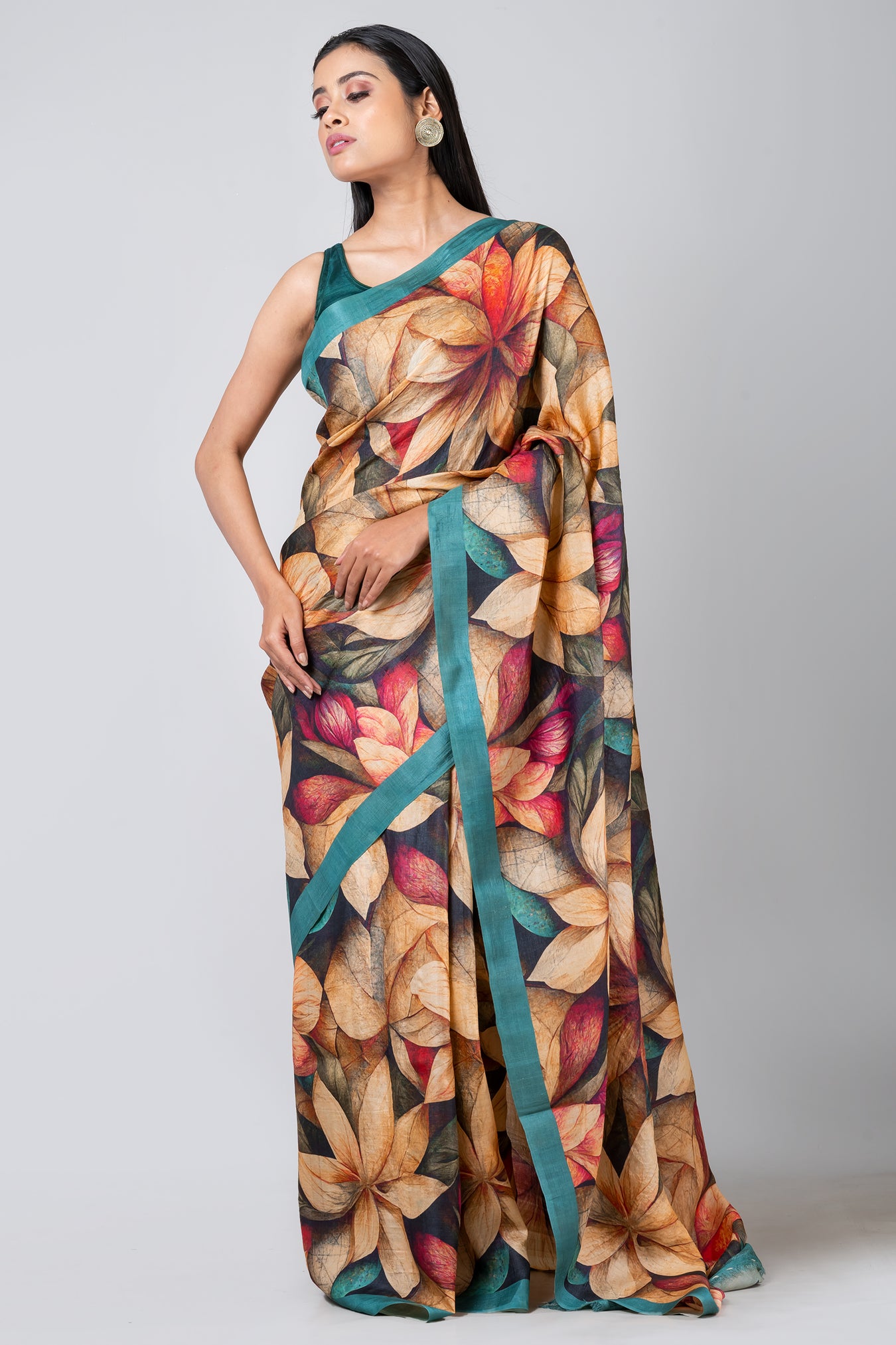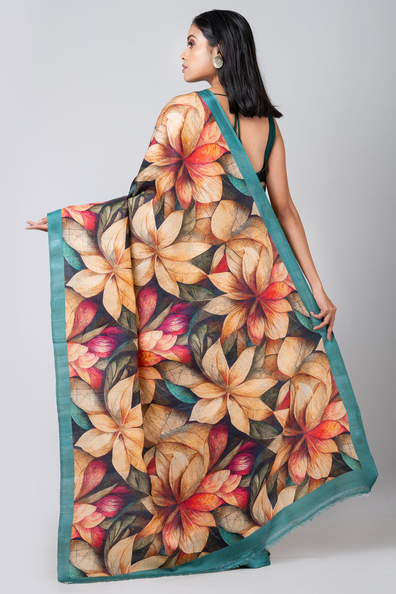 Size: S: 5.50Mtr B: 0.80MtrColour: TEALFabric: TUSSARPattern and print: The Teal color saree with a green border, embellished with large digital flowers in yellow, red, and green, indeed makes for a vibrant and bold fashion statement. This beautiful blend of colors adds elegance and freshness to any occasion, making it a stunning choice for those who want to stand out with style and grace.Silk purity: Pack contains: 1 Saree, 1 BlouseCare instructions: Dry wash