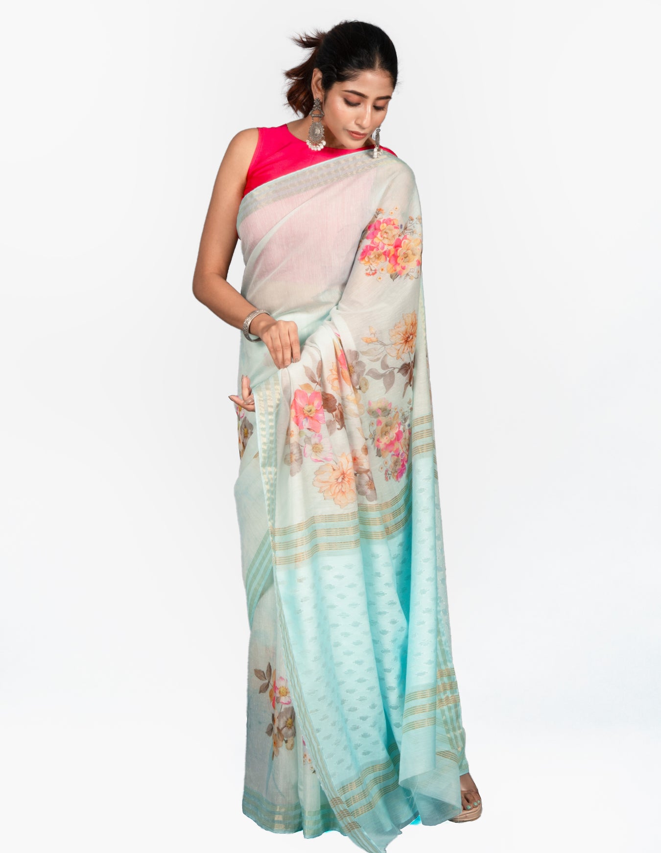 Fabric: KOTA JAMDANIPattern and print: This elegant saree is a breath of fresh air, with a gentle, seafoam green hue that is both calming and chic. The fabric is adorned with delicate, watercolor-style florals in shades of peach and pink, creating a soft, dreamlike pattern that flows across the body. The lower half of the saree and the pallu feature a subtle striped pattern with a light texture, adding depth to the overall design. Paired with a vibrant, fuschia blouse, this saree is a perfect blend of modern style and classic grace. It's an ideal choice for a daytime event, a festive celebration, or any occasion where you want to radiate a serene and sophisticated charm.