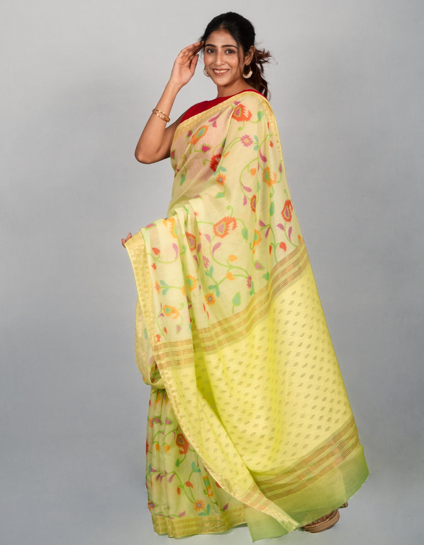 Fabric: KOTA JAMDANIPattern and print: This beautiful saree has a soft, pale yellow-green base that's reminiscent of new leaves in springtime. It's delicately adorned with a flowing vine motif, where vibrant flowers in shades of peach, orange, and red seem to dance across the fabric. The design is simple yet elegant, with a subtle border that features horizontal stripes and a touch of gold. Paired with a bold, contrasting hot pink blouse, this saree creates a fresh and cheerful look. Its lightweight feel and simple pattern make it a perfect choice for casual outings, daytime events, or any occasion where you want to feel both comfortable and stylish.