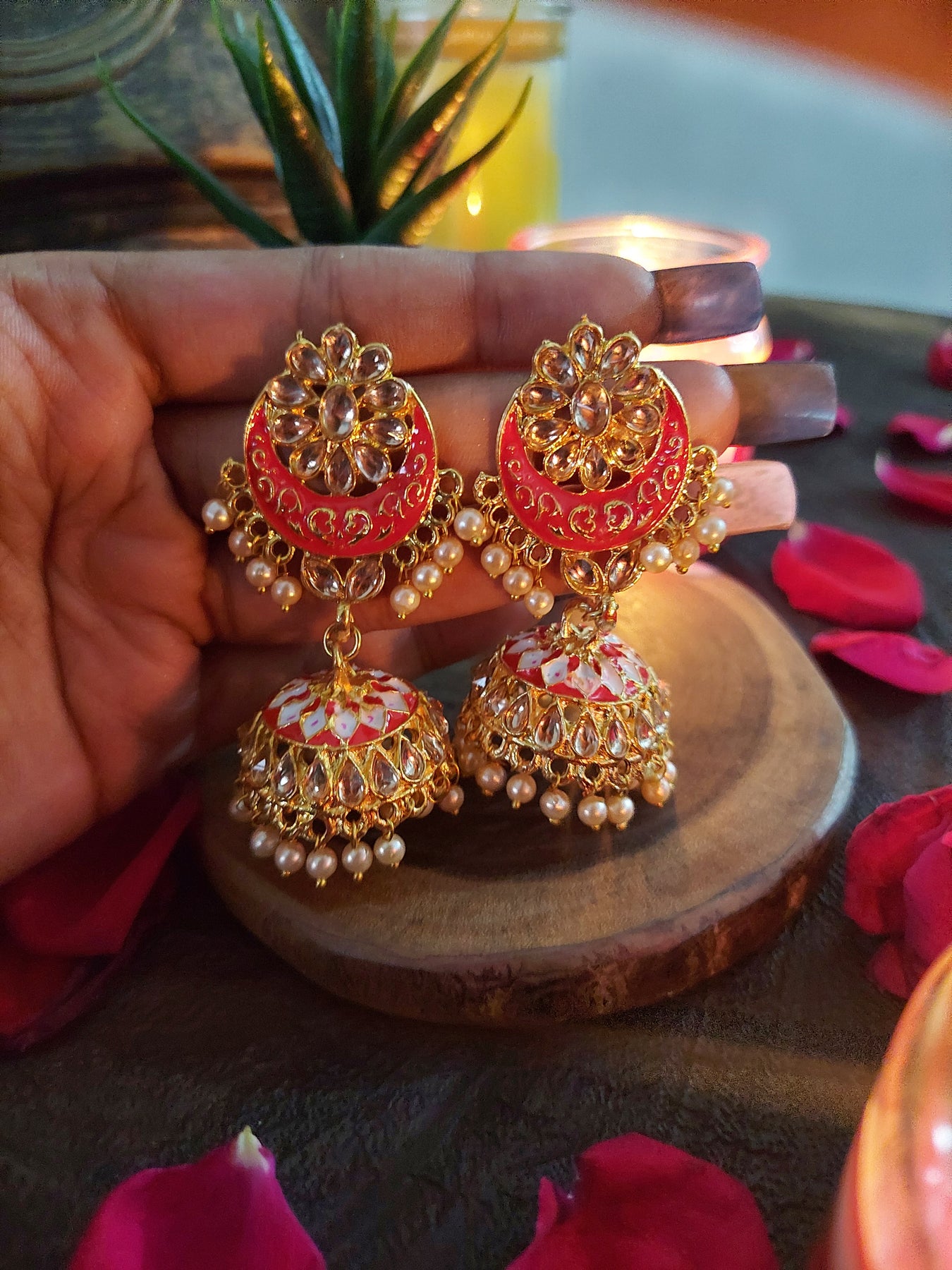 Traditional, stylish pastel pink colored jhumka, with white drop beads and gold finish. Pair it with any kind of Indian outfit of your choice and bring out the delicacy, and beauty of this jewel.