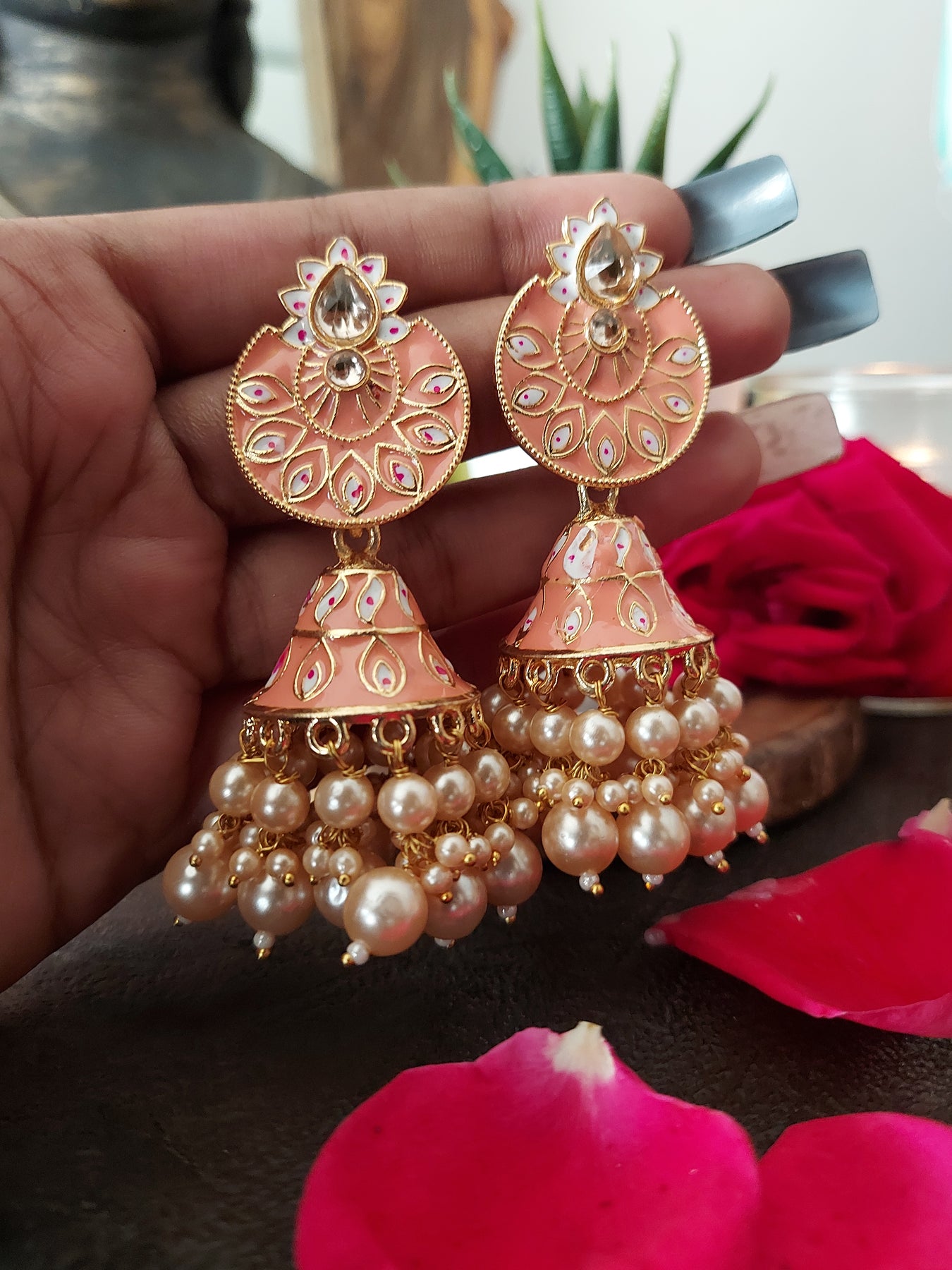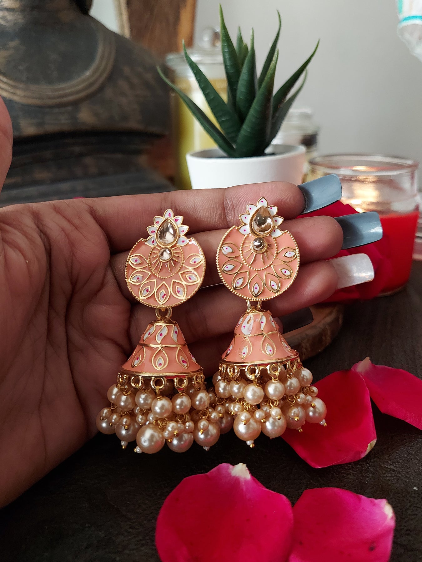 Traditional, stylish pastel pink colored jhumka, with white drop beads. Pair it with any kind of Indian outfit of your choice and bring out the delicacy, and beauty of this jewel.