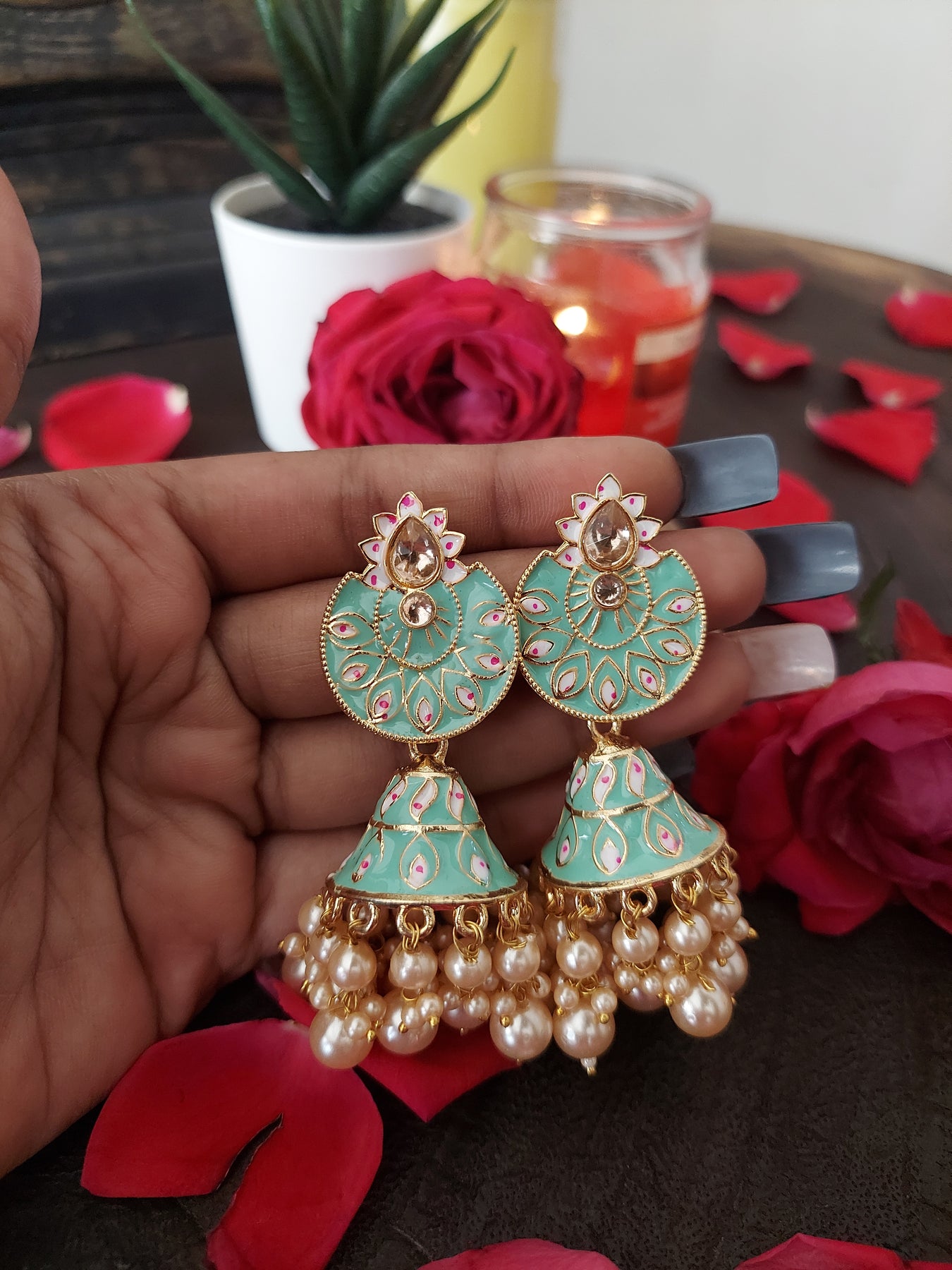 Traditional, stylish pastel colored jhumka, with white drop beads. Pair it with any kind of Indian outfit of your choice and bring out the delicacy, and beauty of this jewel.