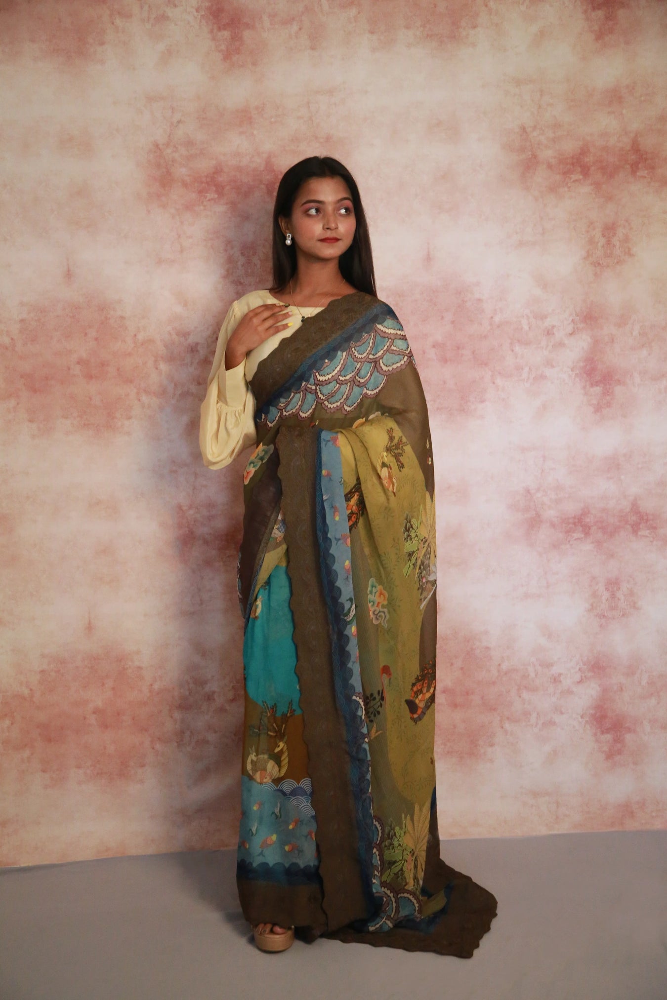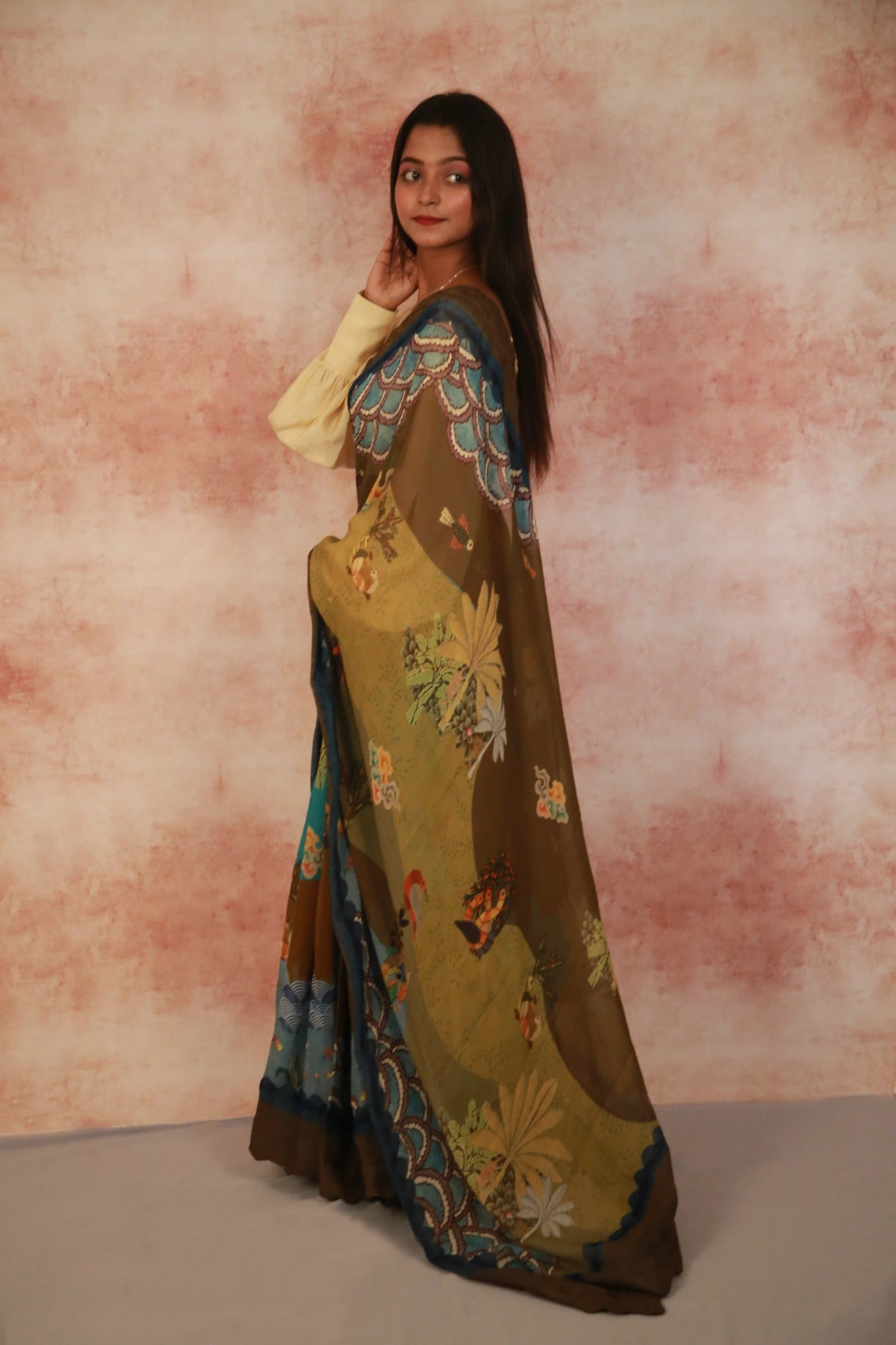 Size:Â S: 5.50Mtr B: 0.80MtrColour: MulticolourFabric: GeorgetteAttributes:Â Pattern and print: Introducing our exquisite Tropical Print Georgette Saree, enhanced with a captivating self-embroidery border that highlights the vibrant tropical print adorning the fabric. The soft and lightweight georgette material drapes effortlessly, ensuring you exude elegance with every step.Purity:Pack contains:Â 1 Saree, 1 BlouseCare instructions: Cold hand wash