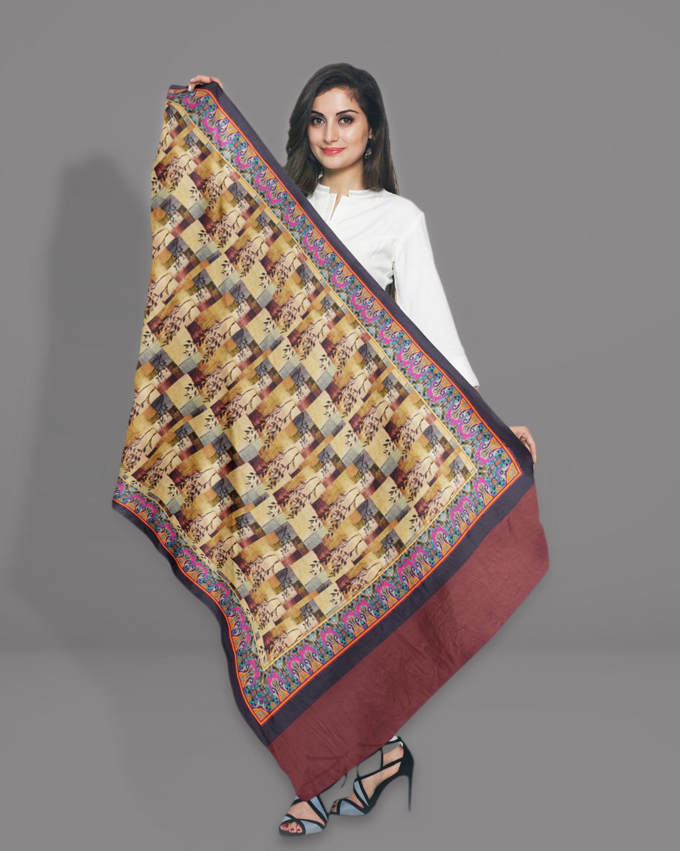 Traditional digital prints adorn the duppatta, which are complemented by a broad detailed ethnic motif printed border. The Duppatta's design value is increased by its earthy toned foundation decorated with rich pastel colored traditional designs that are accentuated. Detailed motifs decorate the Duppatta's whole body. In response to shifting fashion trends, the motifs have been updated. With elaborate, detailed, intricate, contemporary designs, the piece can be dressed in a traditional and Indo-traditional manner, giving value to the depth of the art and tradition. It's a one-of-a-kind item that combines style and tradition.