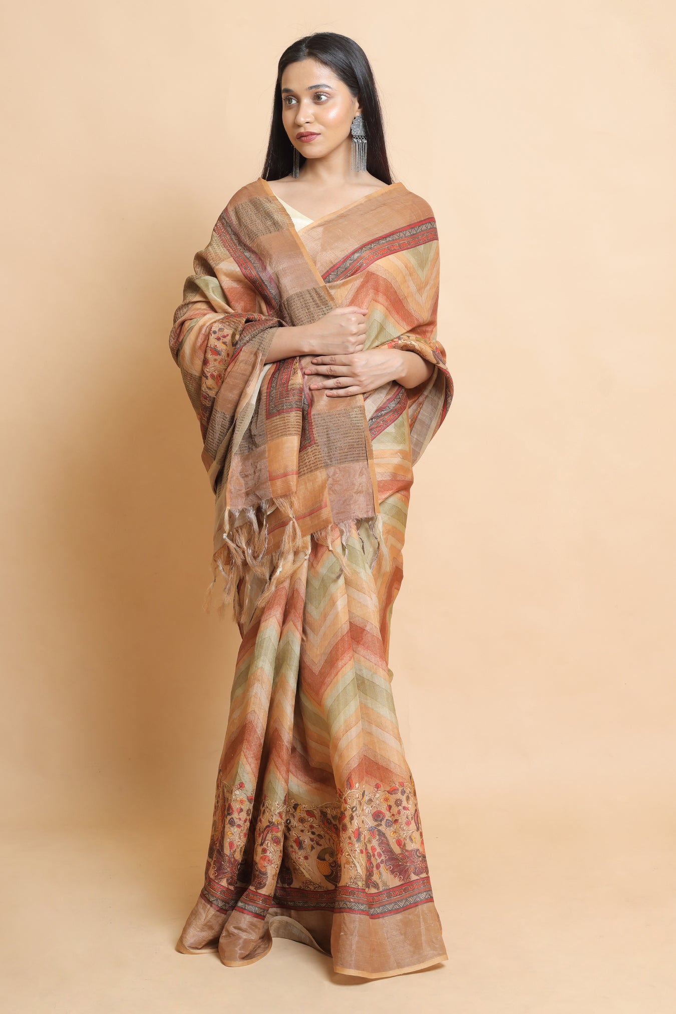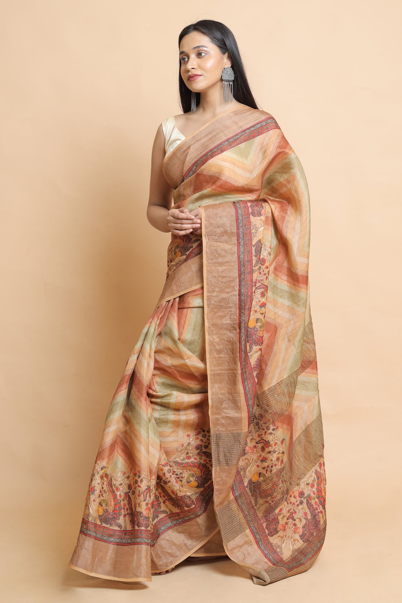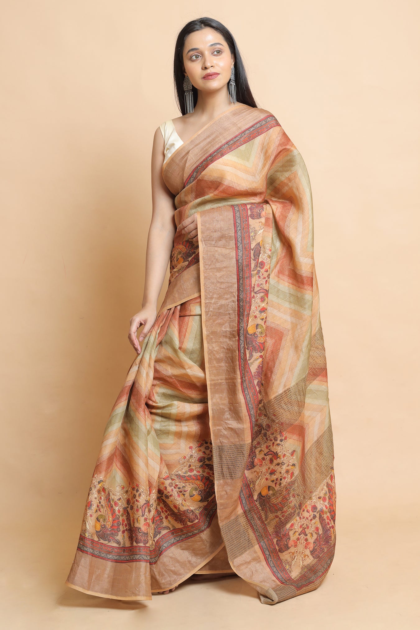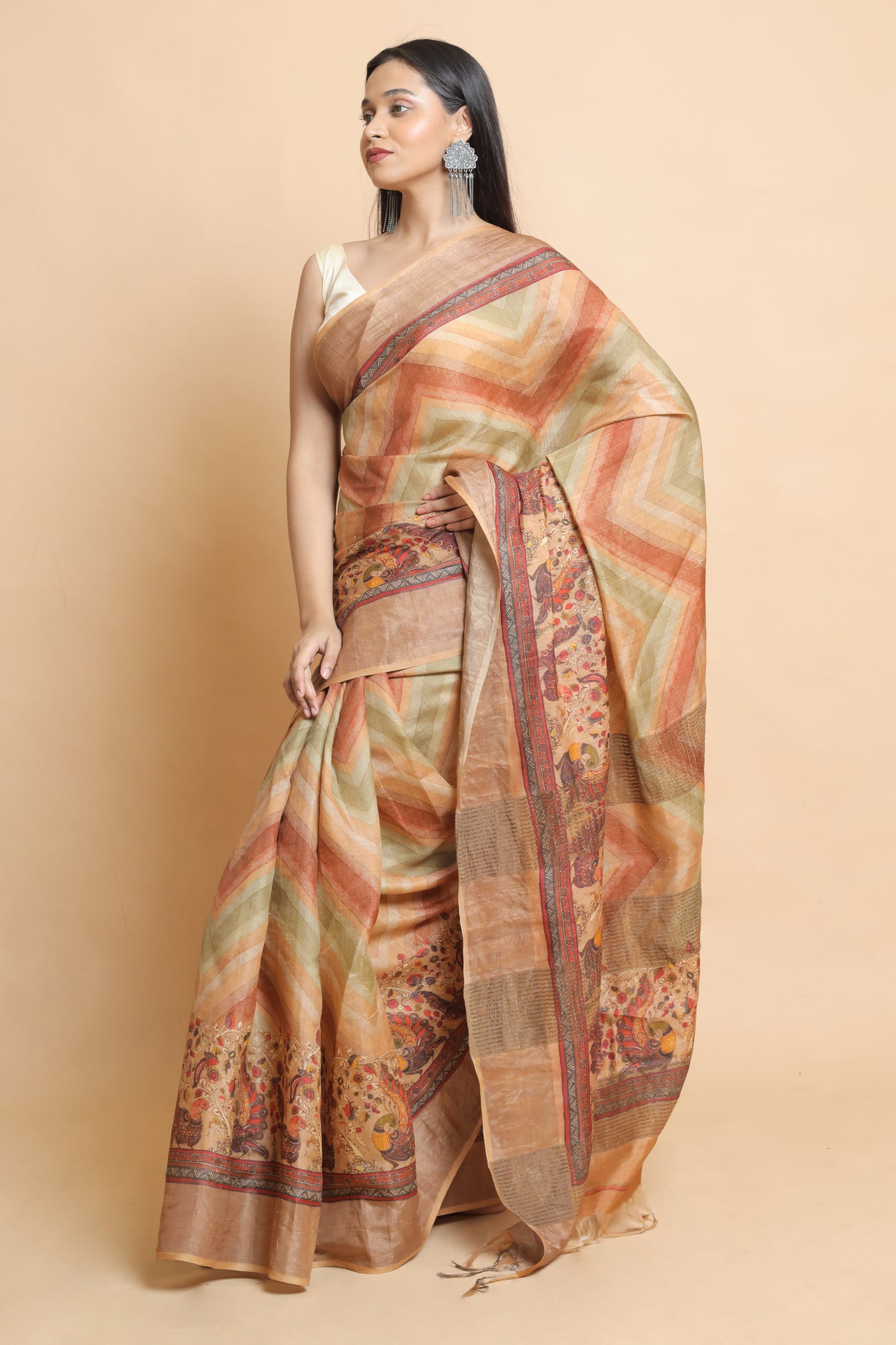 Size: 5.50Mtr Colour: BeigeFabric: TUSSAR Pattern and print: Drape yourself in elegance with our Tussar silk saree, delicately falling over feminine curves with a soft vintage appeal. Vibrant digitally colorful lines traverse the saree's entirety, while traditional kalamkari motifs grace its borders. Defined by soft earthy tones and contrasting border motifs, this saree is a testament to timeless beauty and craftsmanship. Embrace its regal charm and flaunt your feminine grace with pride.