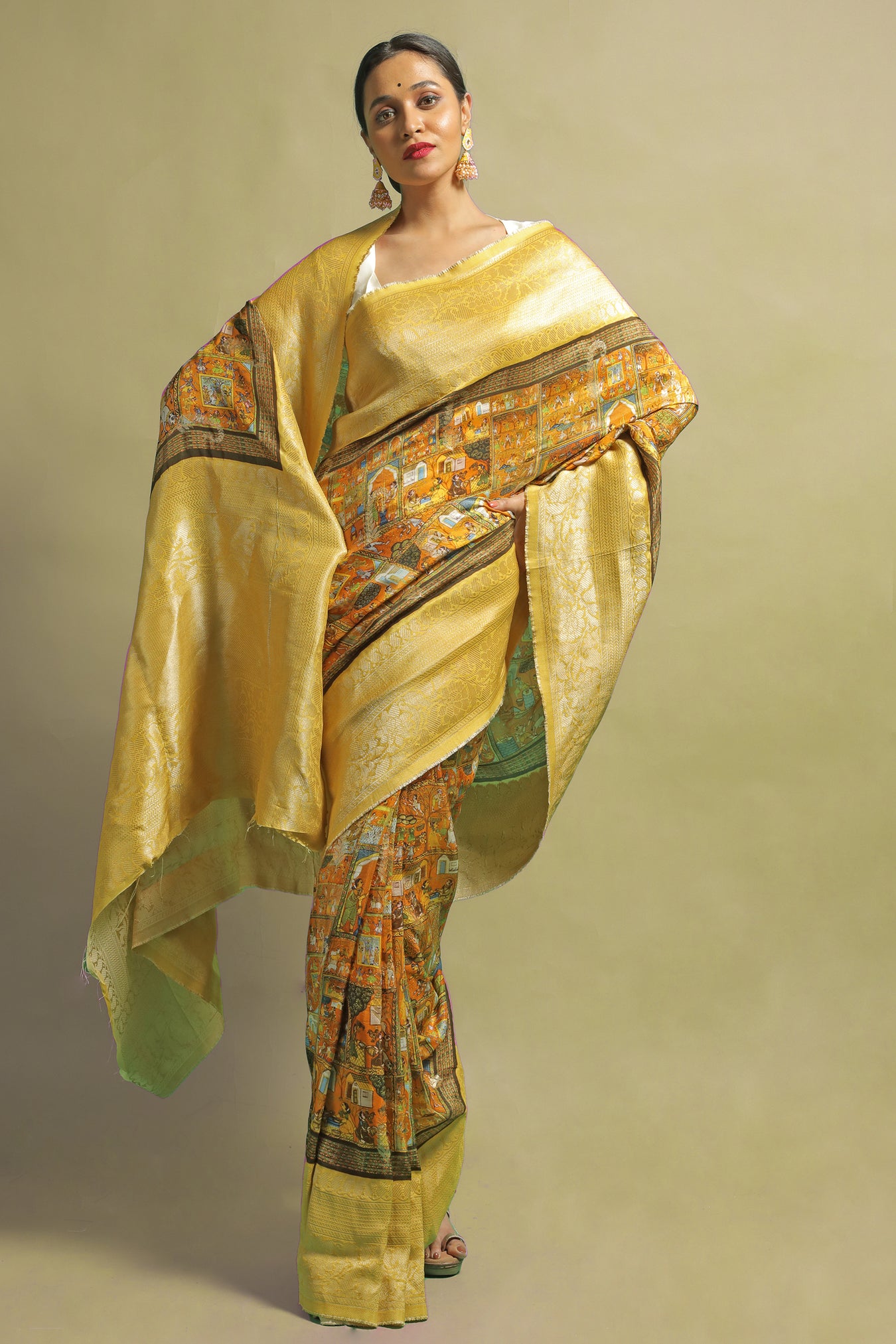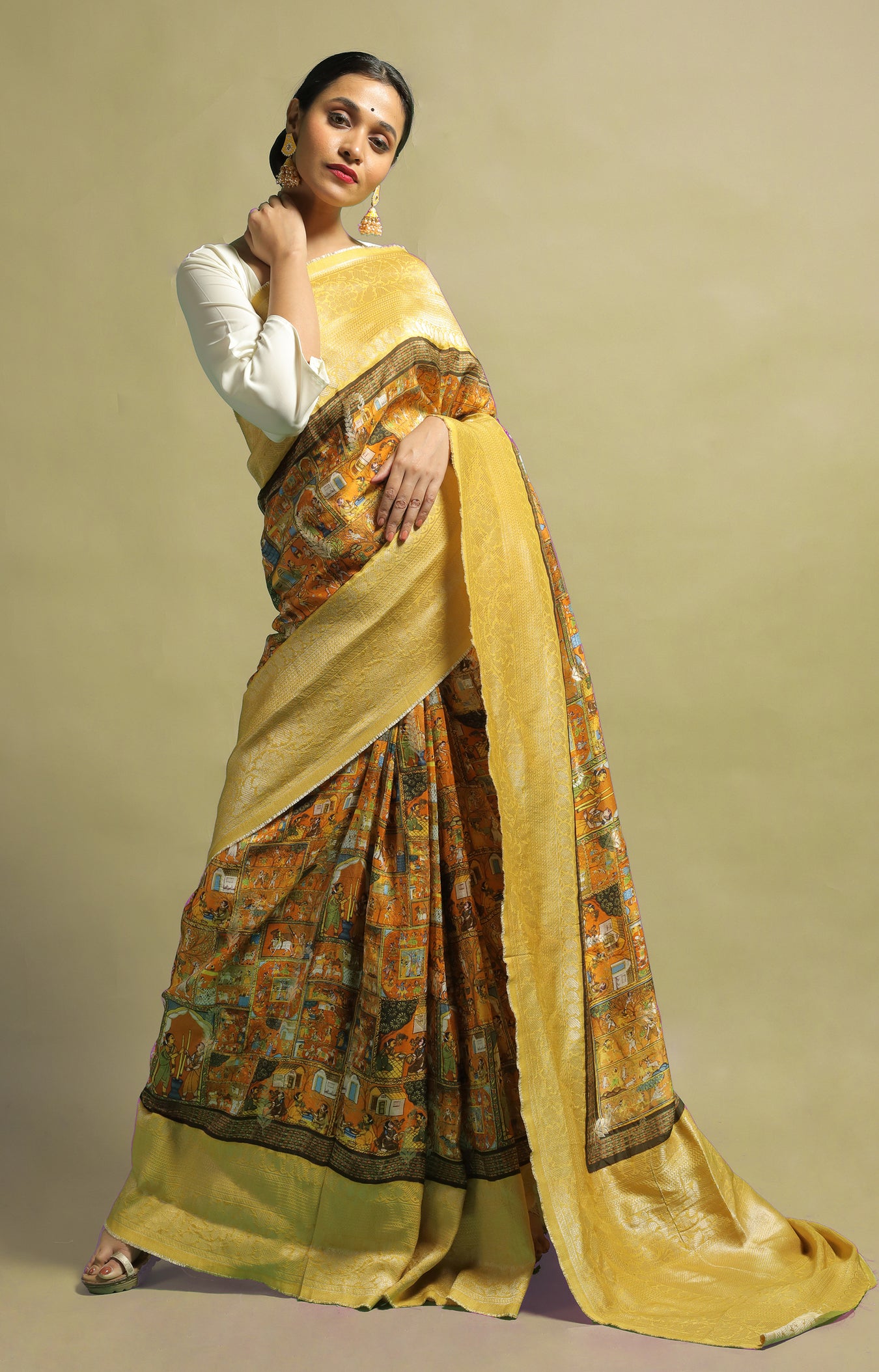 Colour: YellowFabric: KHADDI ZARI SILKPattern and print: The Khaddi silk saree falls beautifully and delicately across feminine curves. The saree's zari border gives it a lovely magnificent and royal aspect. The entire saree is adorned with traditional Patachitra motifs digitally assembled in a collage-like fashion, making it an epitome of lifelong creativity and ancestral beauty. The Yellow toned ground, classic patachitra designs, and flamboyant zari border set this saree apart. Drape and flaunt this one-of-a-kind item to bring out the strong, royal, bold beauty, and elegance of feminine beauty.Care instructions:Â Dry wash