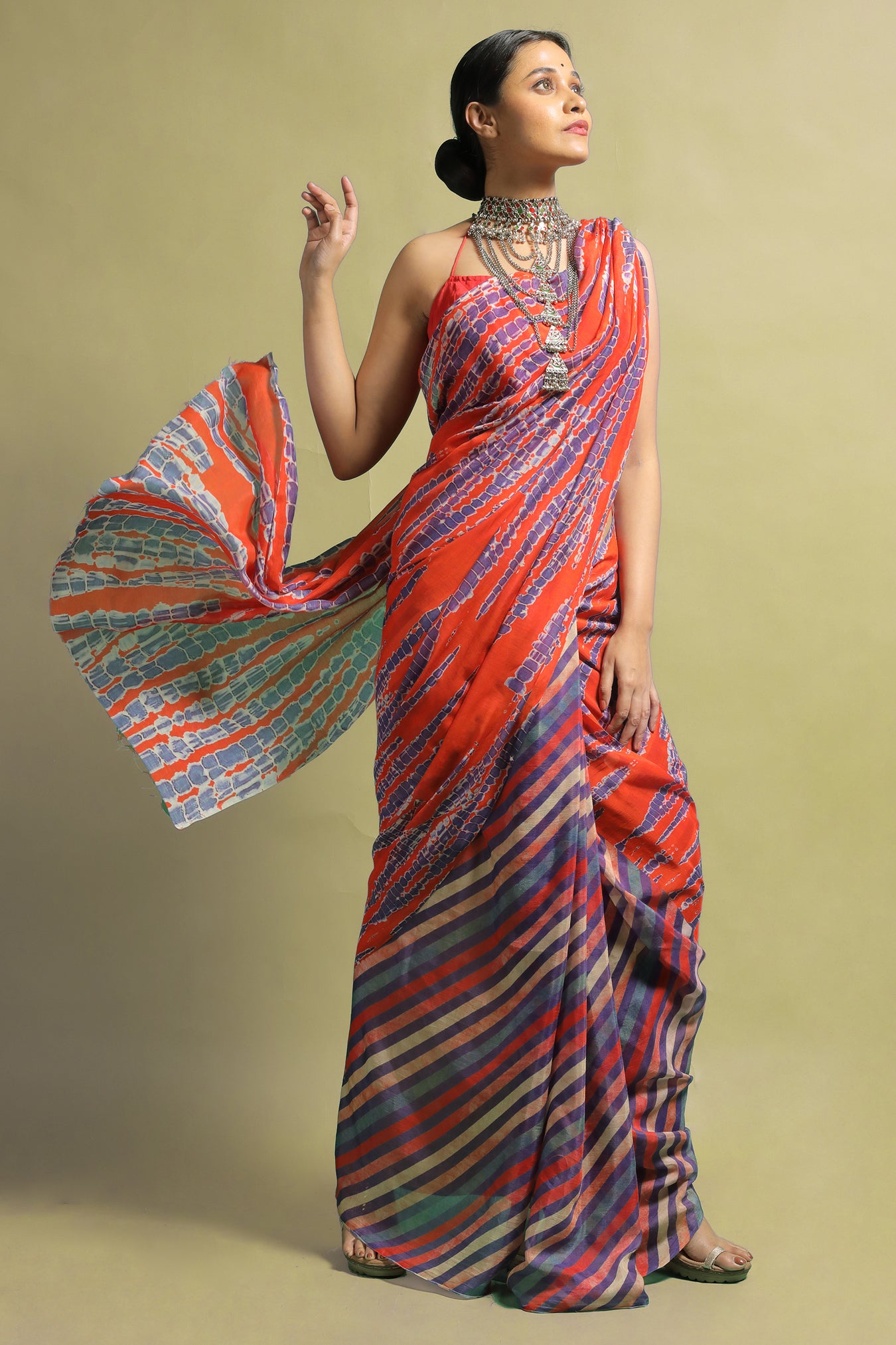 Pattern and print: Envelop yourself in the vibrant charm of our red Chanderi saree. Adorned with a mesmerizing digital print featuring a blend of Hafe and Hafe Bandhani and Leheriya designs, this saree embodies traditional elegance with a contemporary twist. Let the rich hues and intricate patterns of this saree make a statement at any occasion.Care instructions: Dry wash