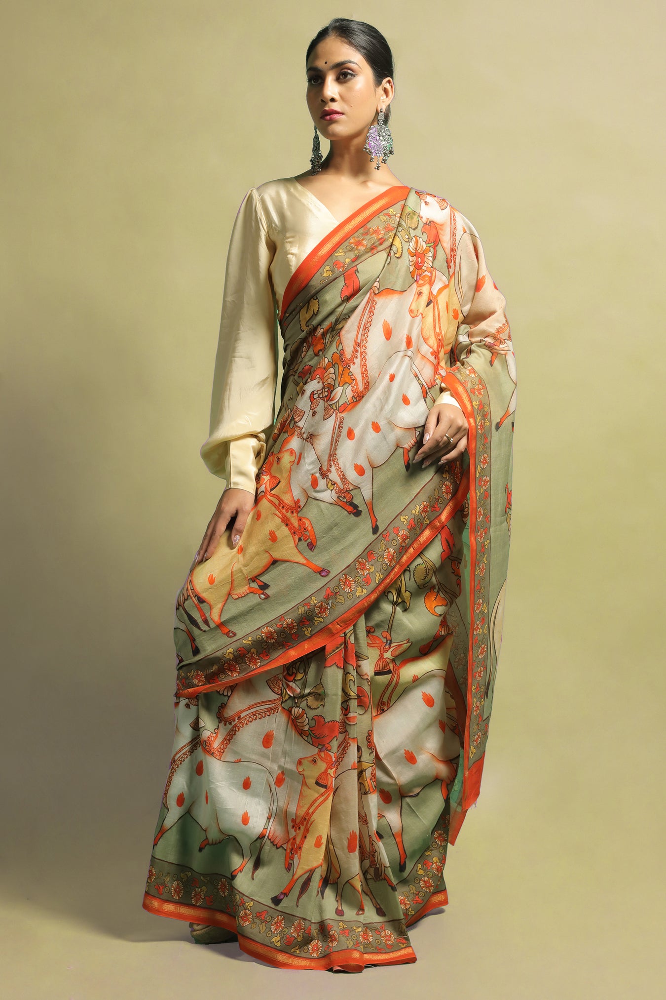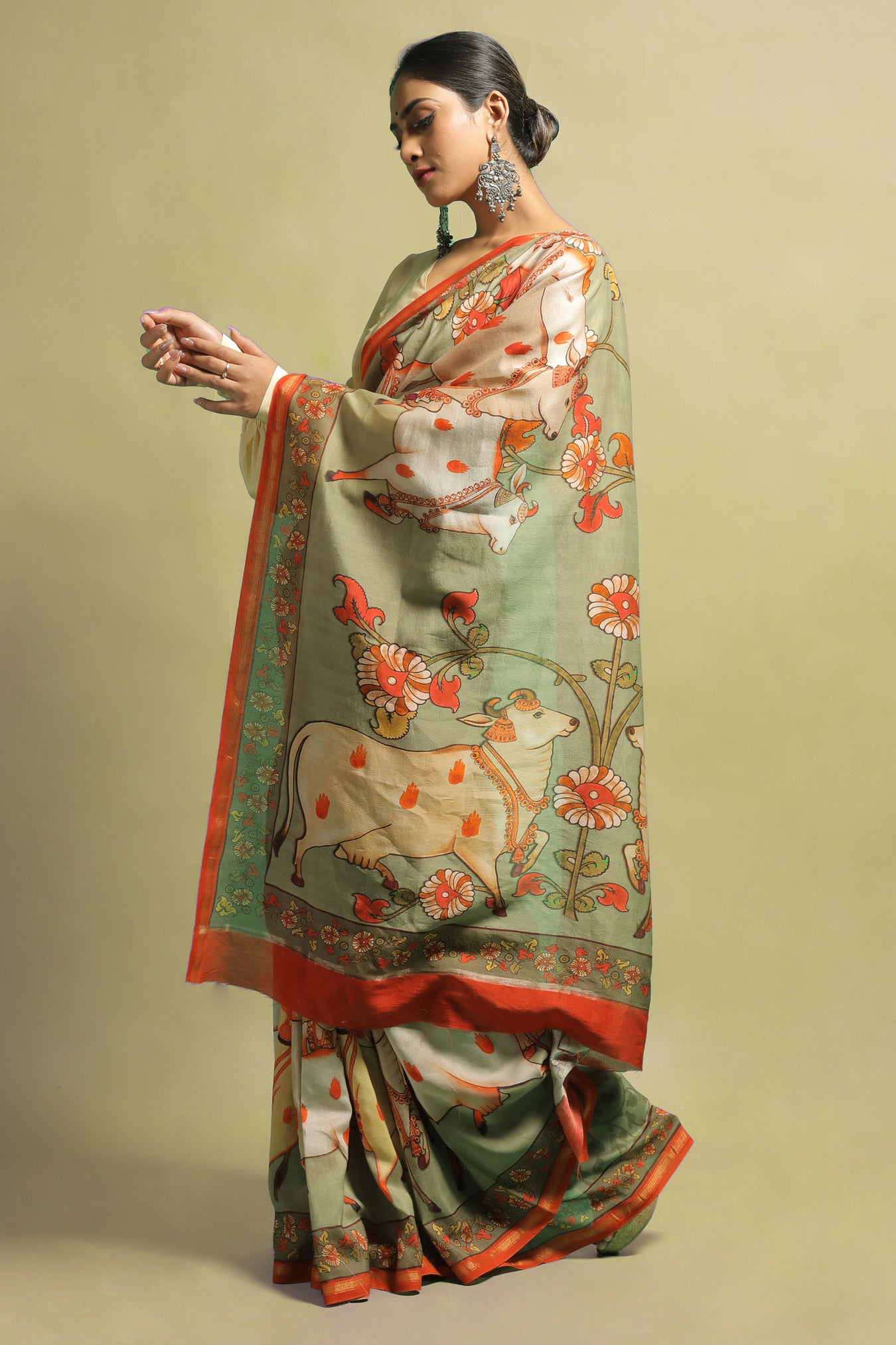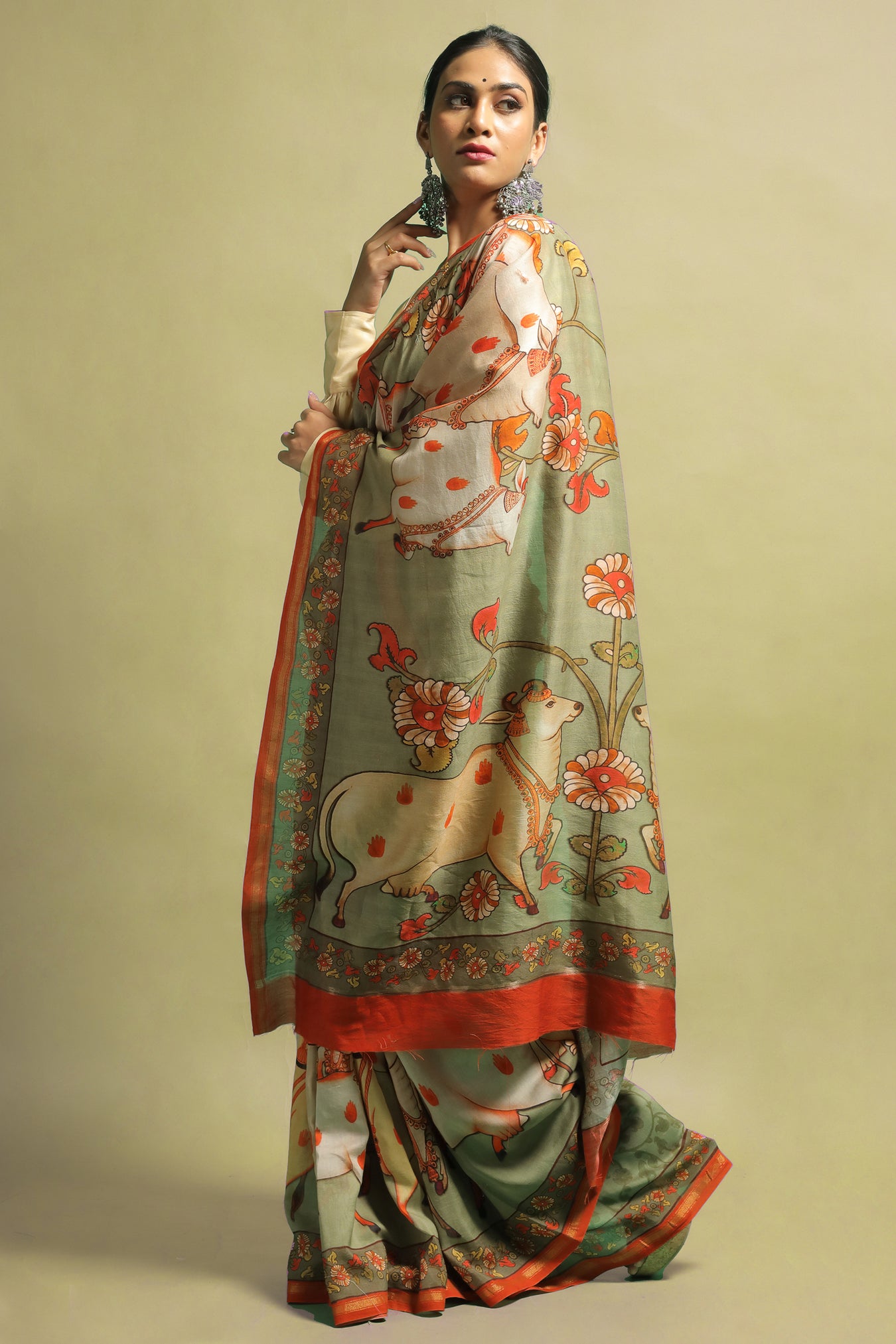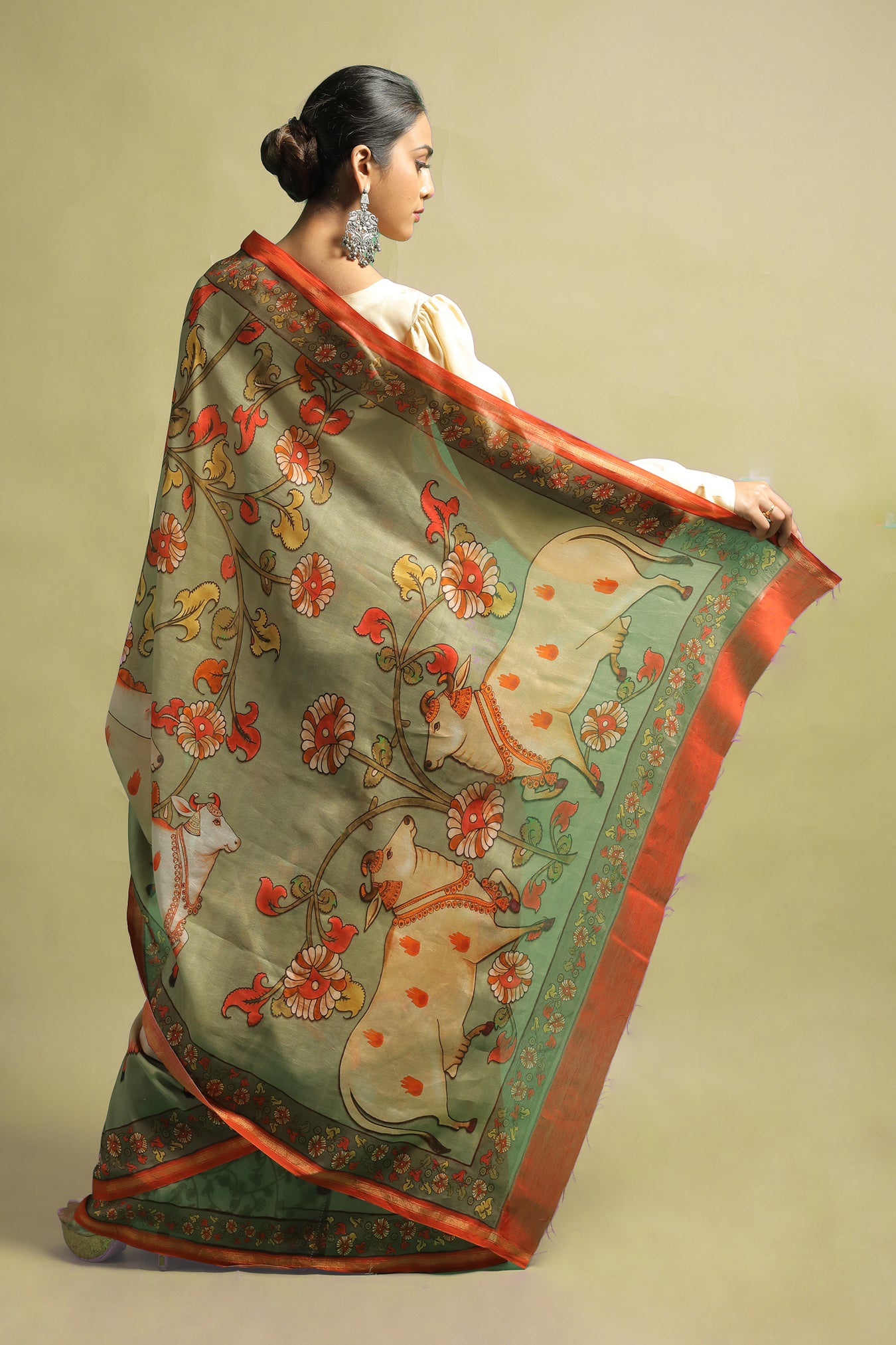 Tussar Silk fabric decorated with an intricate scenery of grazing cows and beautiful fresh floral motifs.