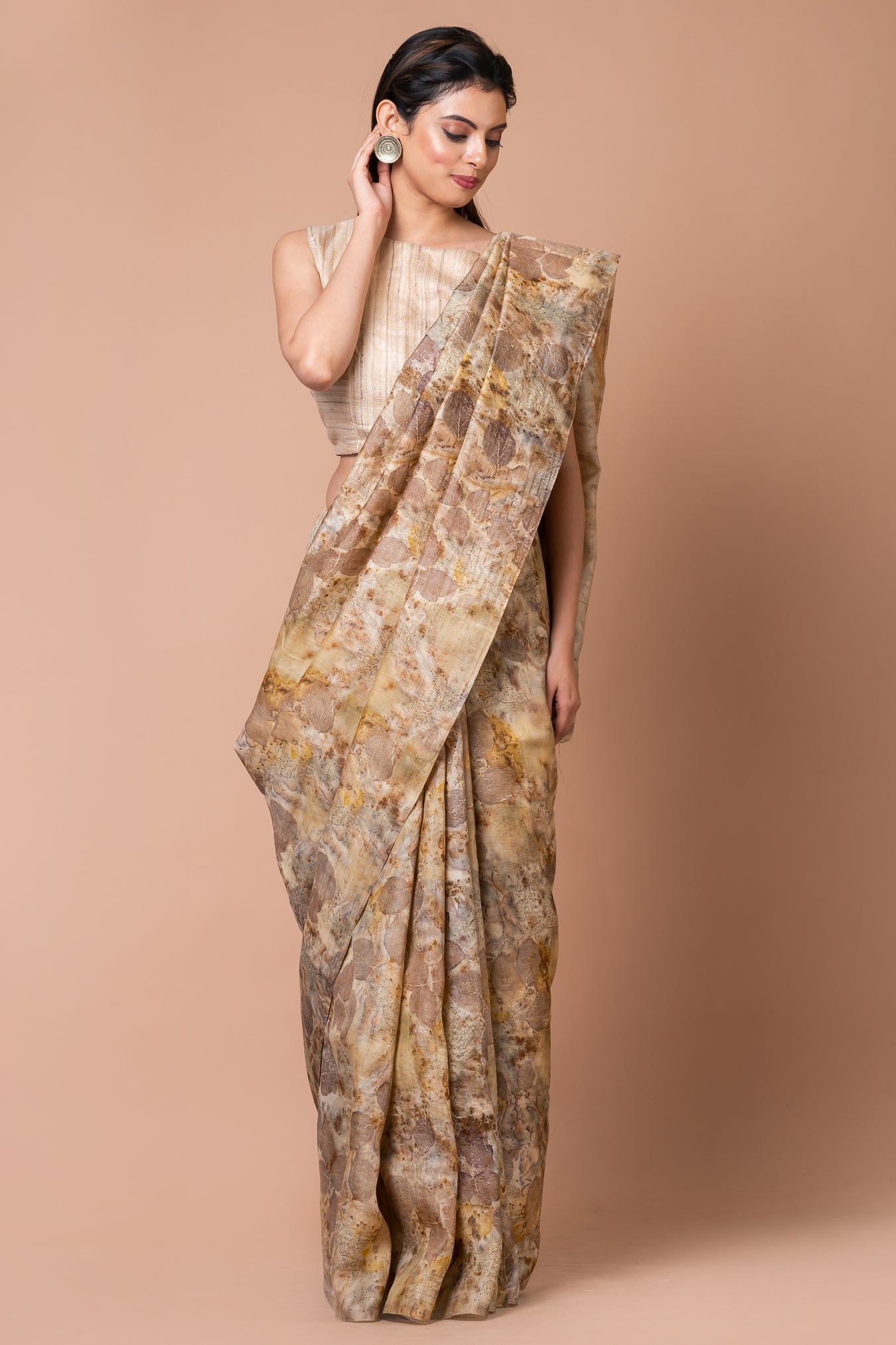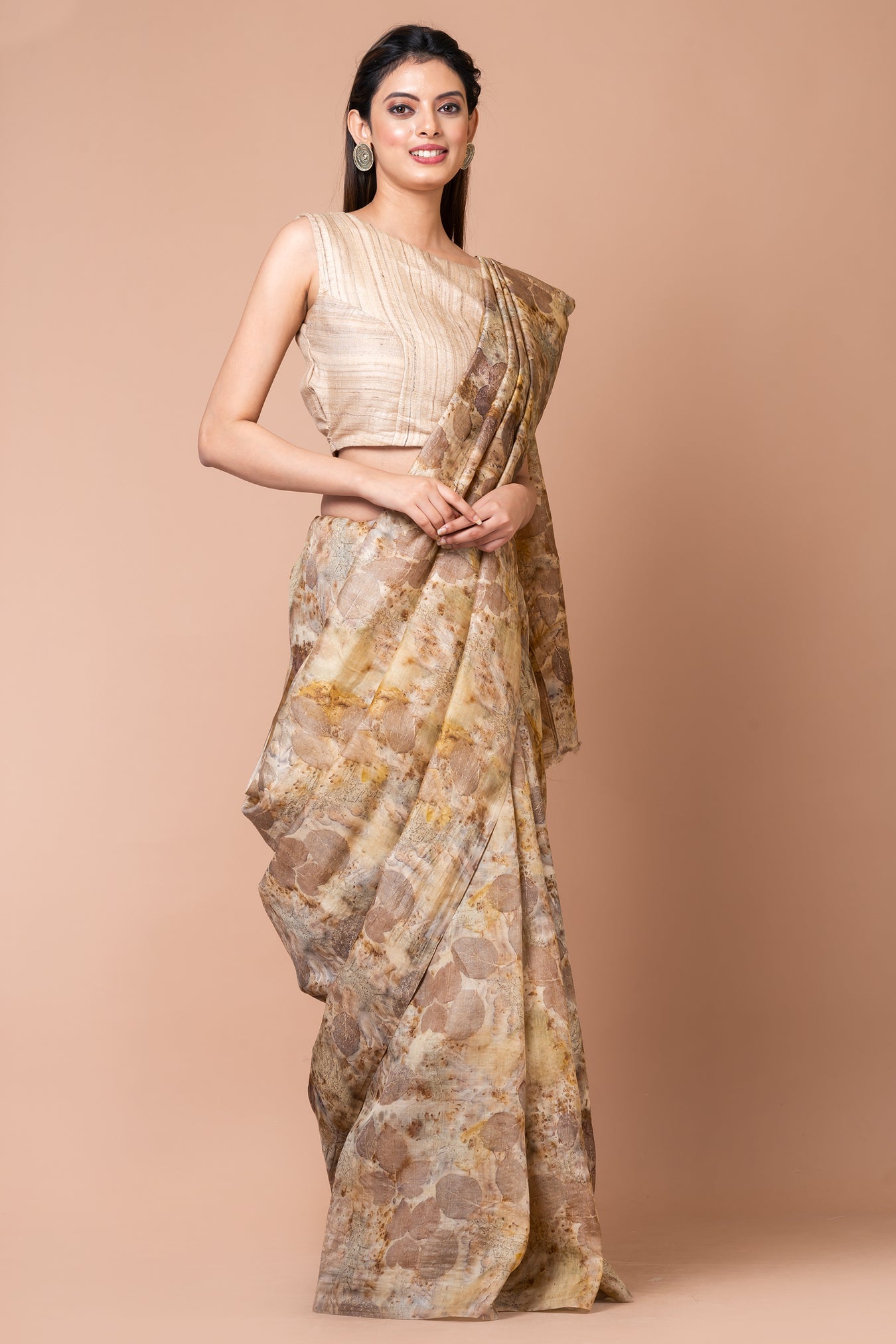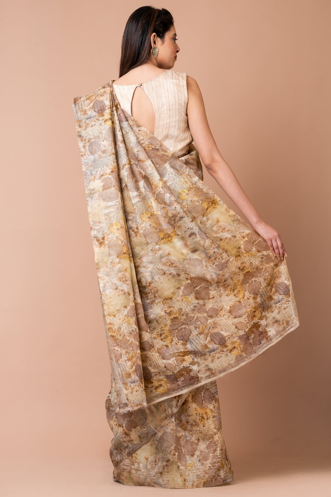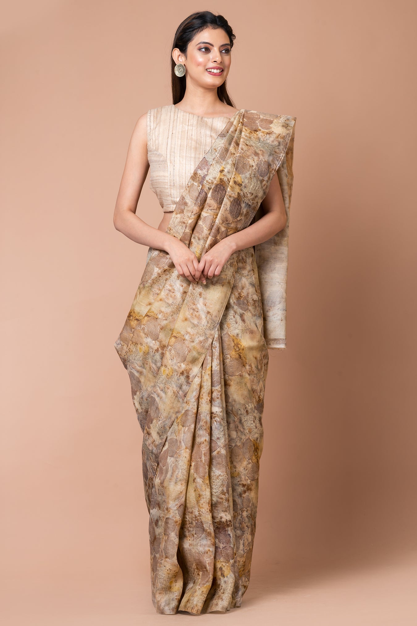 Size: S: 5.50Mtr B: 0.80MtrColour: PALE YELLOWFabric: TussarPattern and print: Introducing our eco-print style digital print tussar silk saree, a fusion of nature-inspired elegance and modern technology. Crafted with care, this saree features intricate foliage motifs digitally rendered onto luxurious tussar silk. Earthy tones and subtle embellishments enhance its charm. Pair with a simple blouse for effortless sophistication. Flaunt sustainable style with every wear.