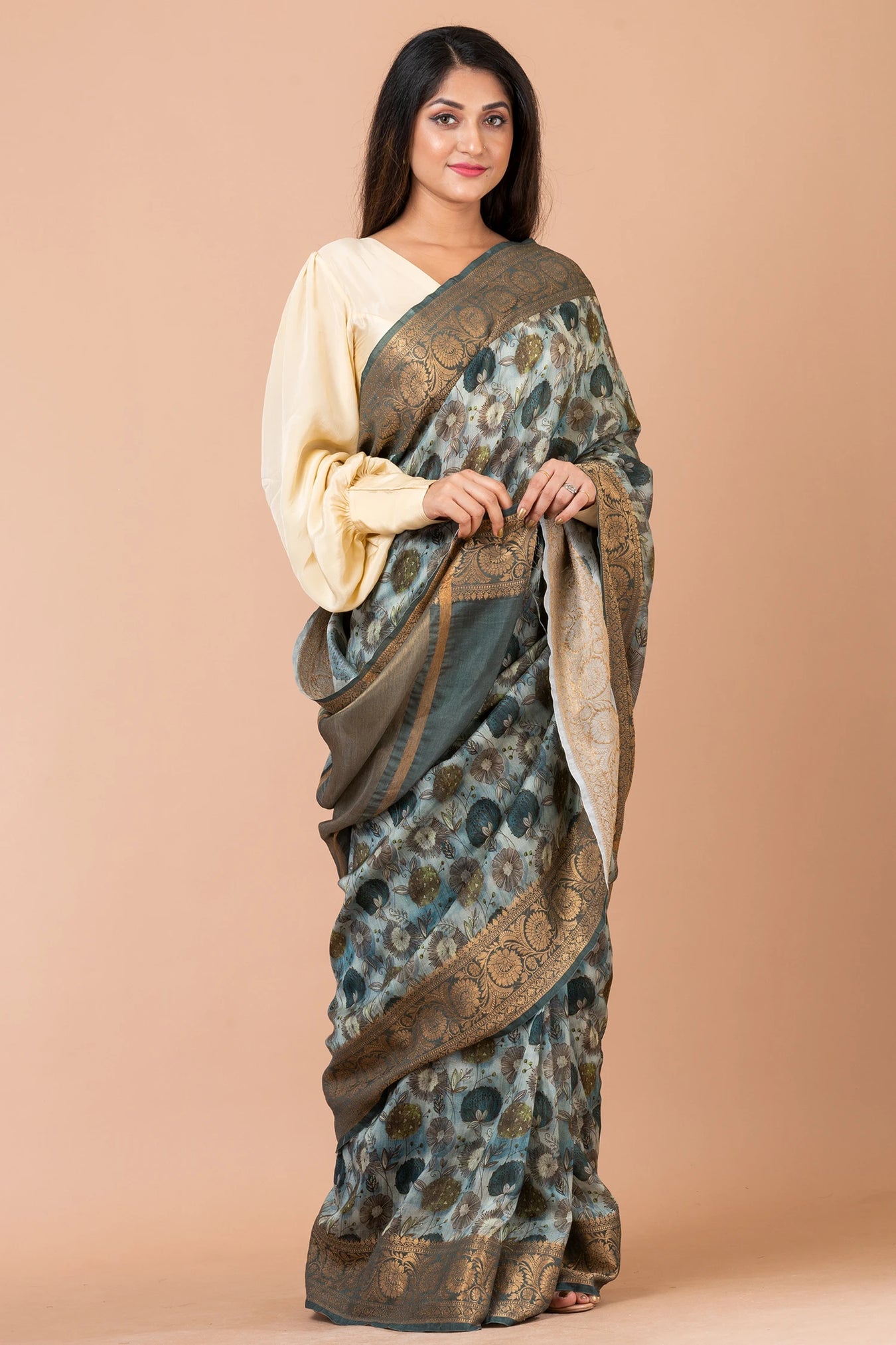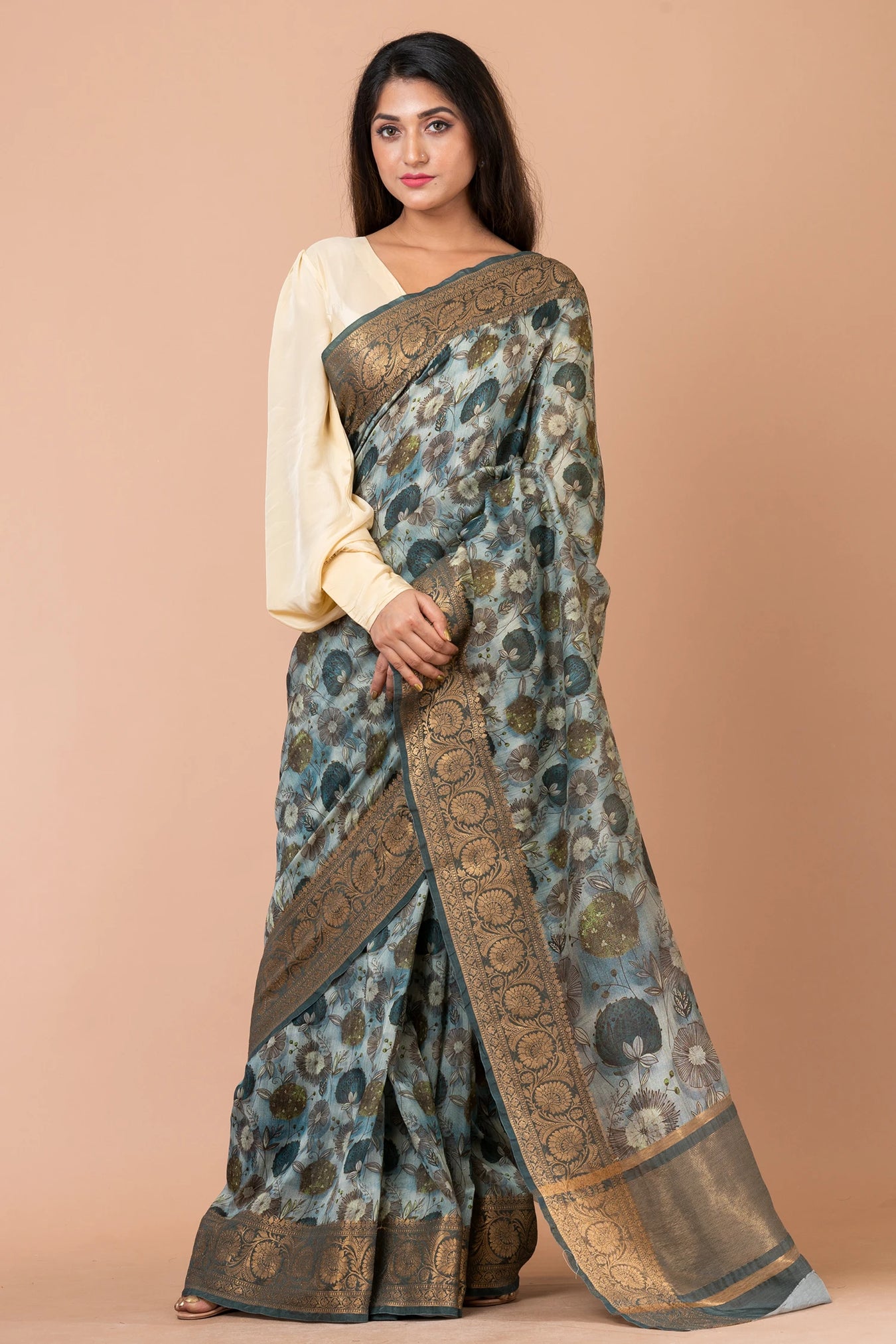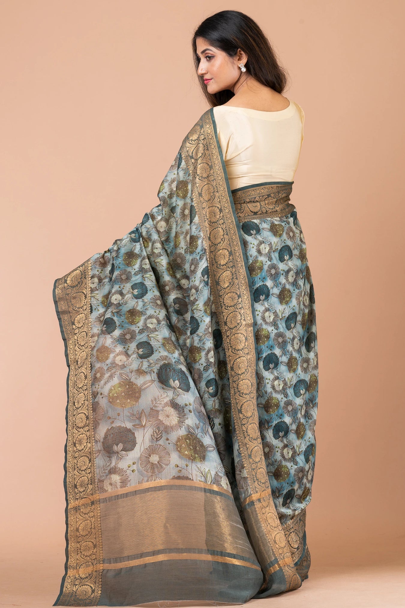Size: S: 5.50Mtr B: 0.80MtrColour: Steel grey with grey zari borderFabric: Chanderi Zari Woven sareeAttributes: Pattern and print: Step into the untamed beauty of our saree featuring a wild flower motif pattern, where nature's exuberance is artfully captured in a captivating and enchanting ensemble that celebrates the charm and grace of wild blooms in a mesmerizing array.Silk Purity: Pure ChanderiPack contains: 1 Saree, 1 BlouseCare instructions: Dry wash
