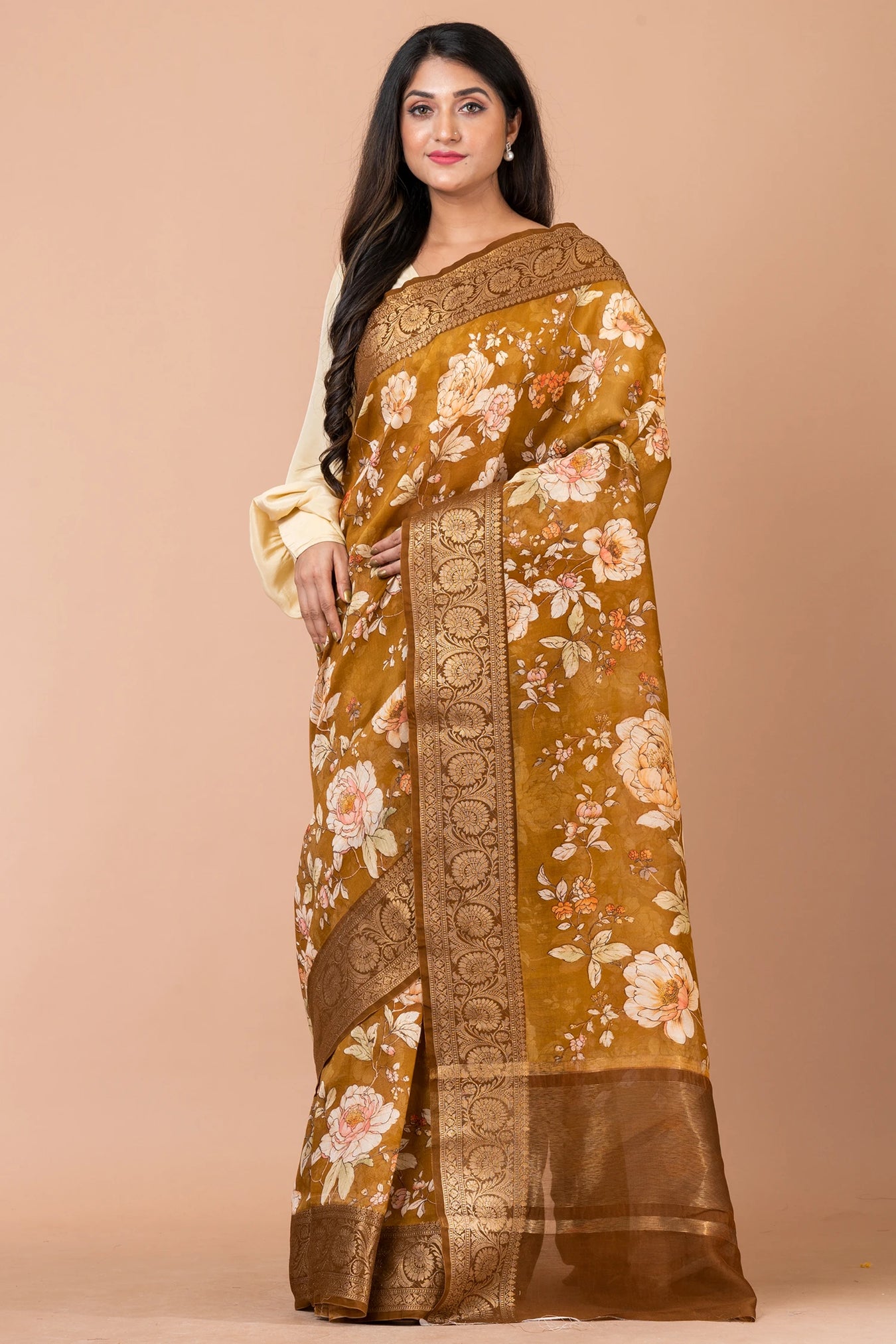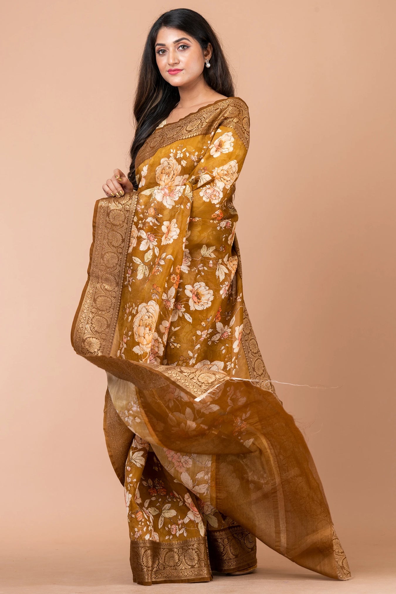 Size: S: 5.50Mtr B: 0.80MtrColour: Mehandi and Brown Fabric: Chanderi Zari Woven sareeAttributes: Pattern and print: Celebrate the elegance of our saree adorned with white roses and wild flower print, where the delicate beauty of roses blends with the untamed charm of wild blossoms, creating a captivating and enchanting ensemble that exudes grace and natural allure.Silk Purity: Pure ChanderiPack contains: 1 Saree, 1 BlouseCare instructions: Dry wash
