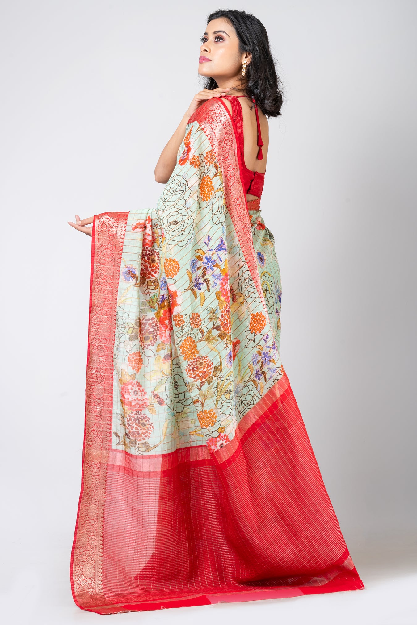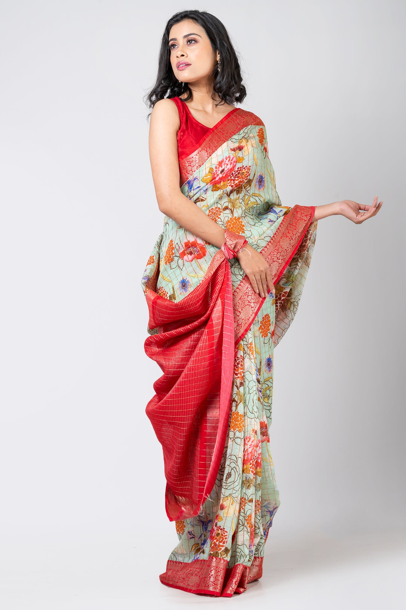 Size: 5.50Mtr B: 0.80MtrColour: SEA GREENFabric: CHANDERI CHECKSPattern and print: "This saree boasts a mesmerizing display of colorful garden floral prints, creating a vibrant and lively tapestry of nature-inspired beauty. The intricate and varied floral patterns gracefully adorn the fabric, infusing the ensemble with a burst of joyful hues.Silk purity: Pack contains: 1 Saree, 1 BlouseCare instructions: Dry wash