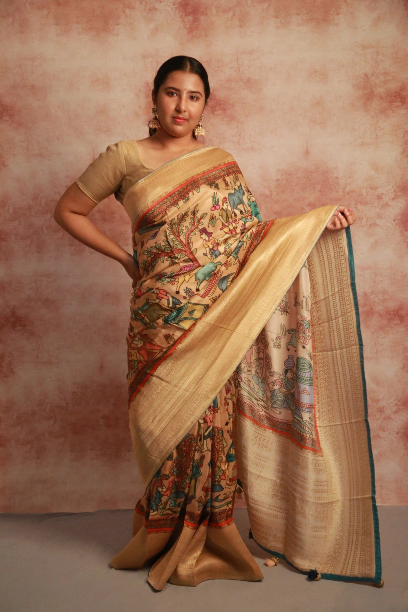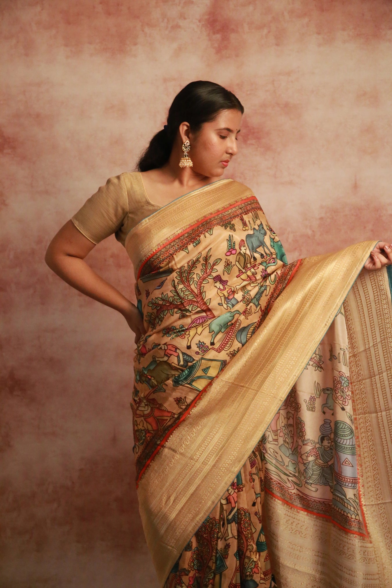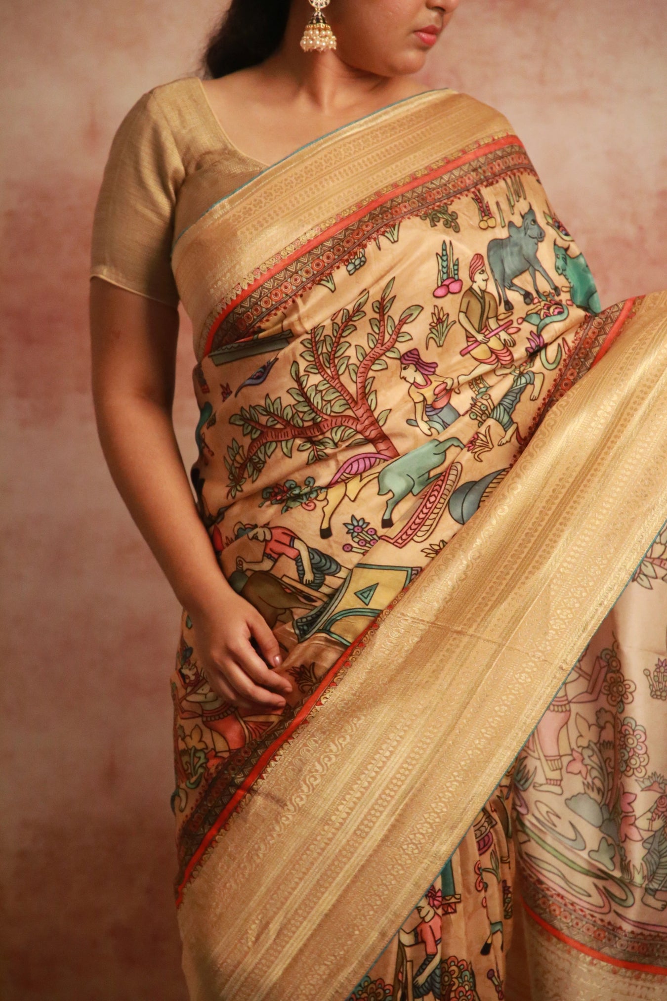 Step into the scenic beauty of a rustic village with our Village Vista saree! In a soothing beige hue, this saree features a Khaddi woven zari border and a captivating Kalamkari village scenic print pattern.