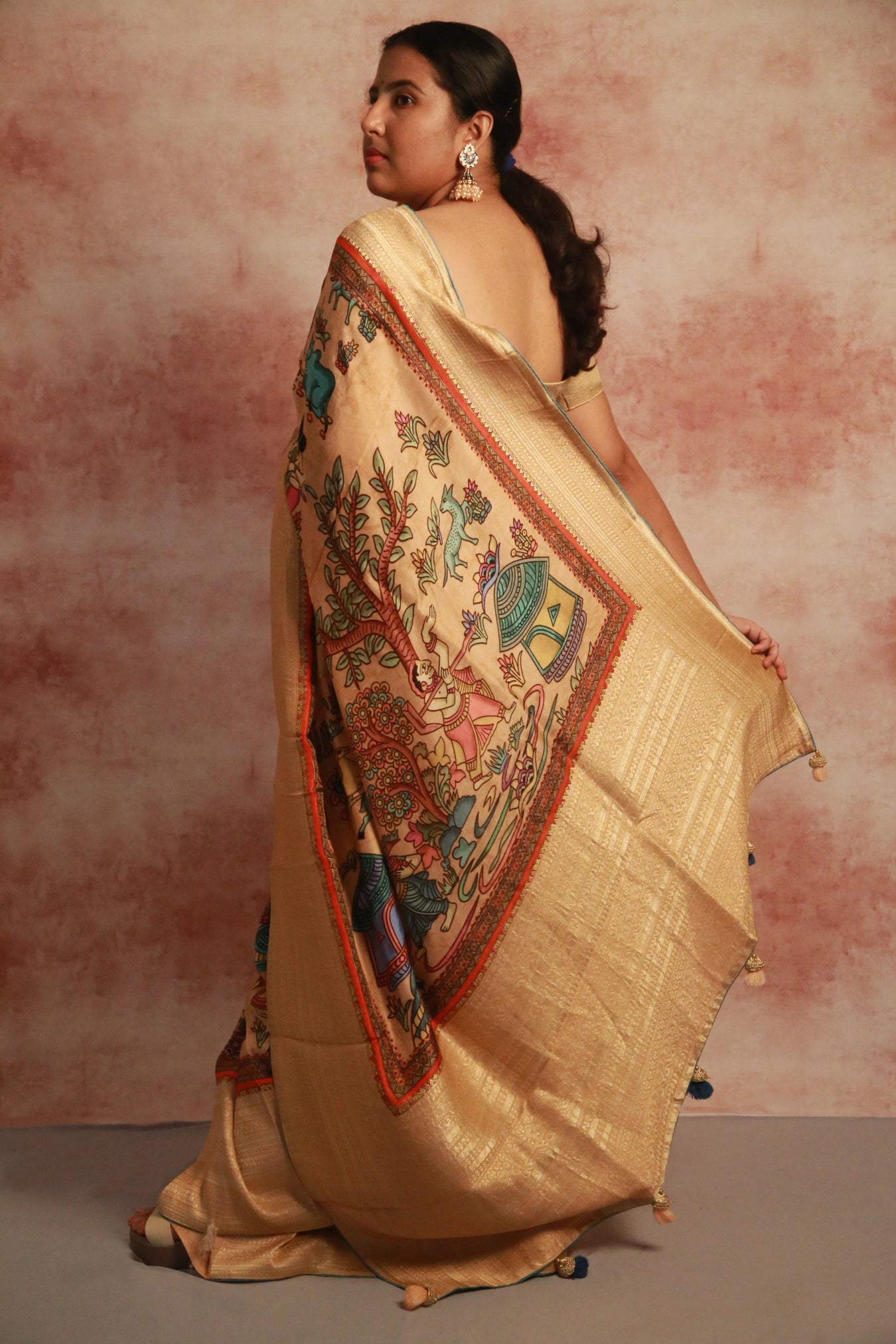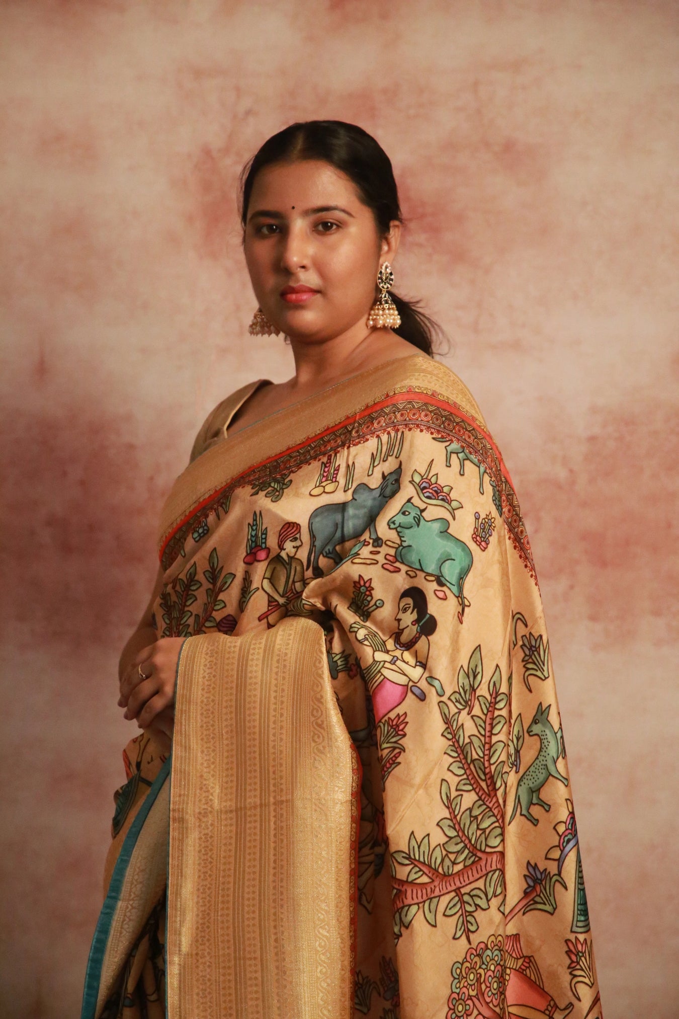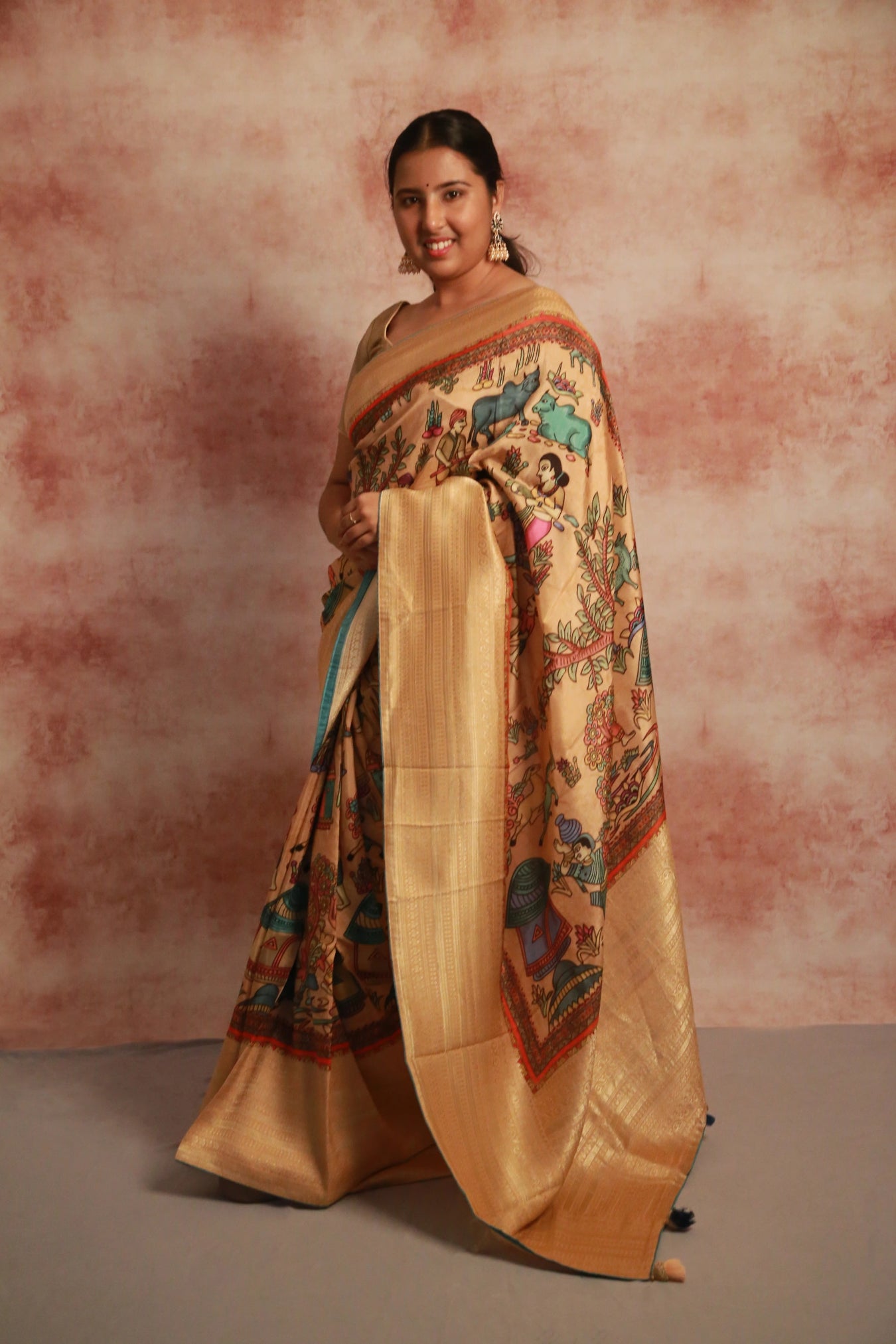 Step into the scenic beauty of a rustic village with our Village Vista saree! In a soothing beige hue, this saree features a Khaddi woven zari border and a captivating Kalamkari village scenic print pattern.