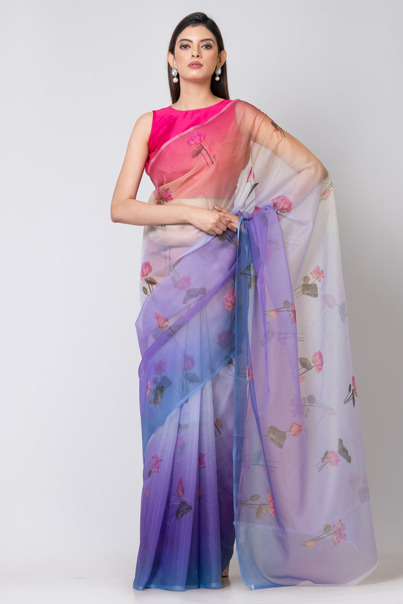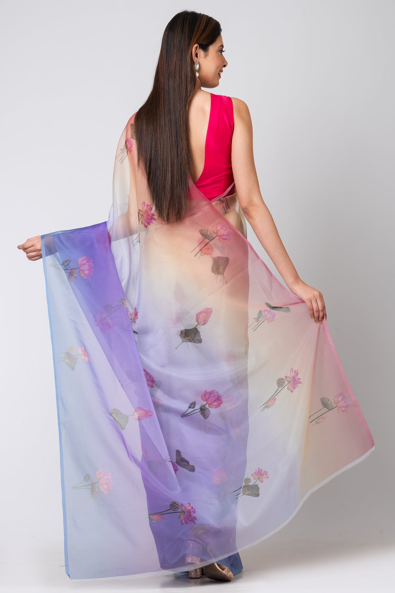 Size: 5.50Mtr B: 0.80MtrColour: MultiFabric: OrganzaAttribute:Â Handwork bead scallopingPattern and print:Â Blossoming lotus with multi colour shadesStep into a world of elegance with our soft floral print saree, celebrating the gentle beauty of nature in style.Pack contains:Â 1 Saree, 1 BlouseCare instructions:Â Dry wash