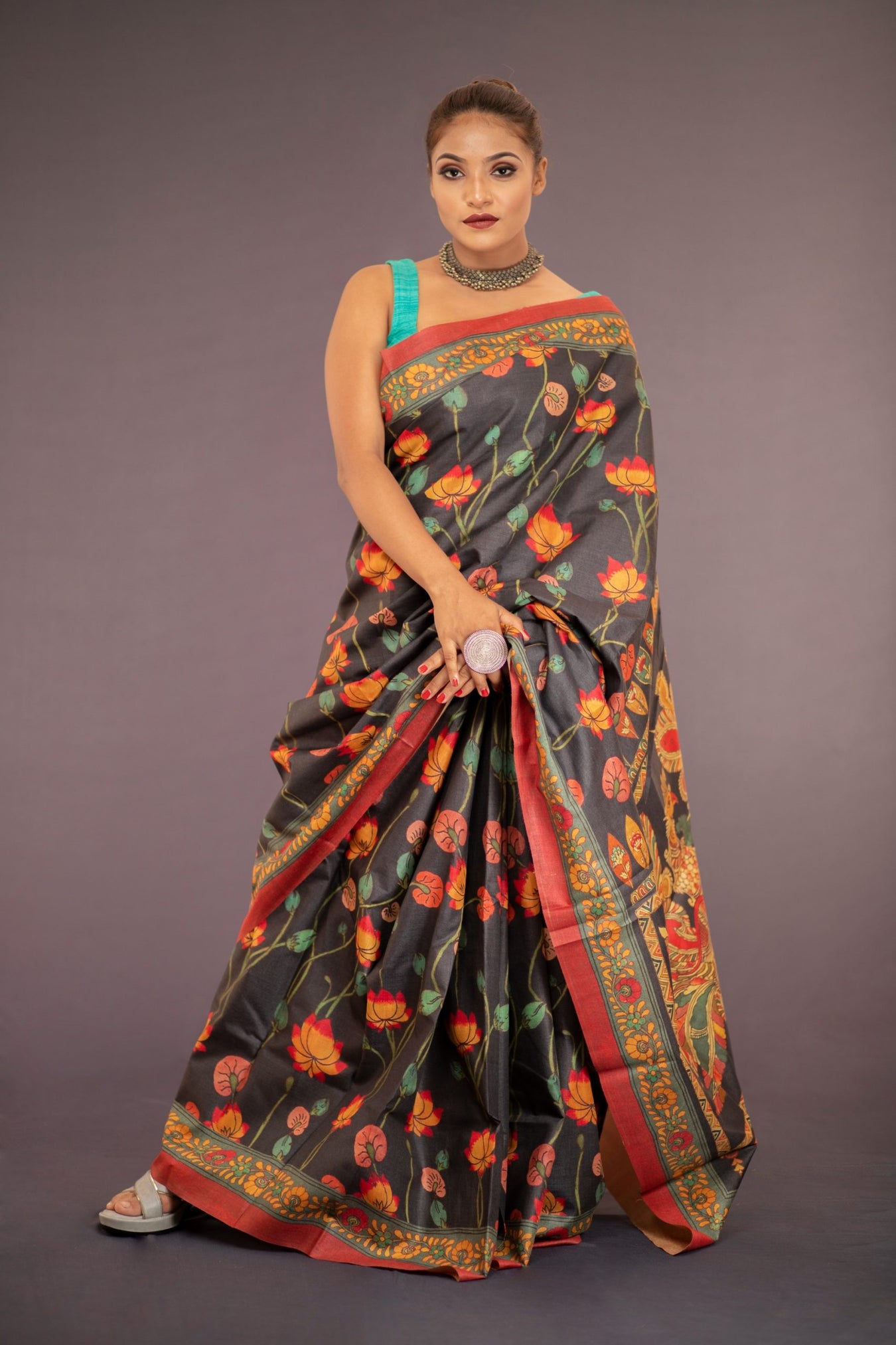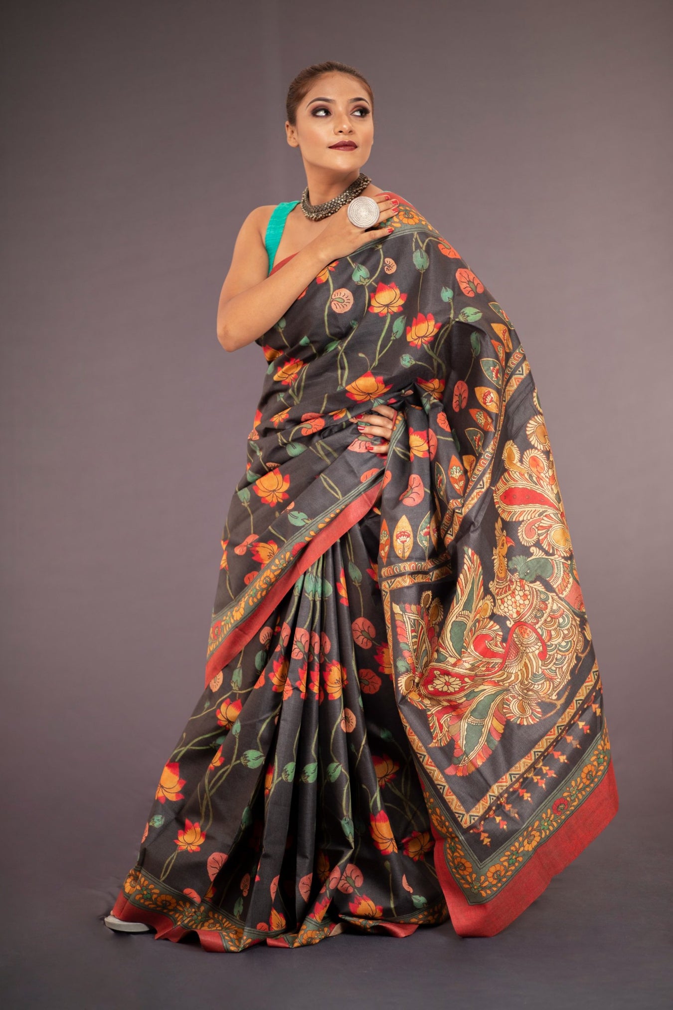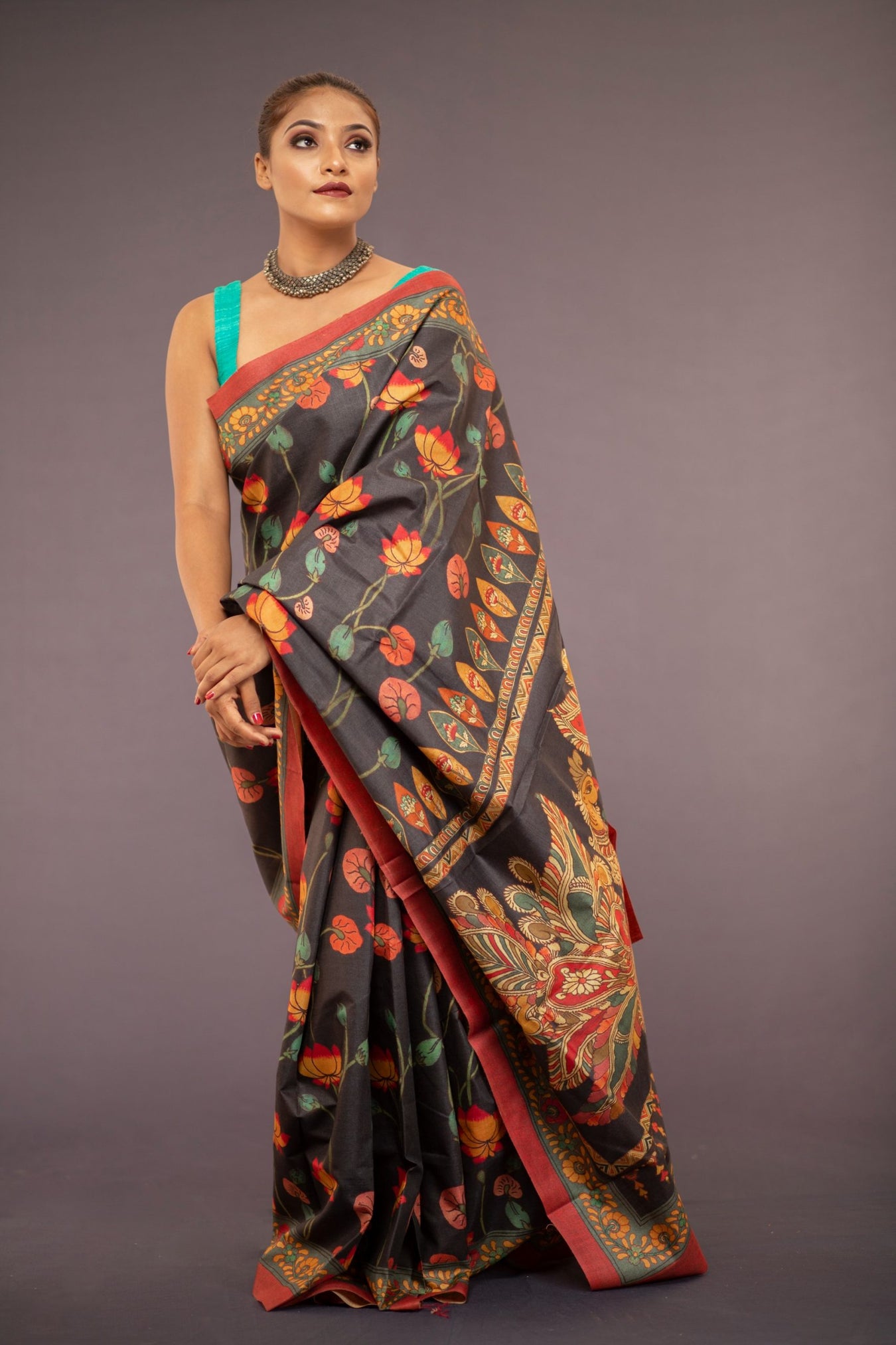 Colour: BLACKFabric: TUSSAR ZARI Pattern and print: Kalamkari lotus jaal printed all over the body and elaborate intricate design printed on Rich Tussar silk saree. The boldness and vibrancy of the whole look, makes the saree stand out among other collections. The saree makes you feel confident, bold and provides a statement look, making the wearer the center of attraction.Silk purity: Pure Tussar SilkPack contains: 1 Saree, 1 BlouseCare instructions: Dry wash