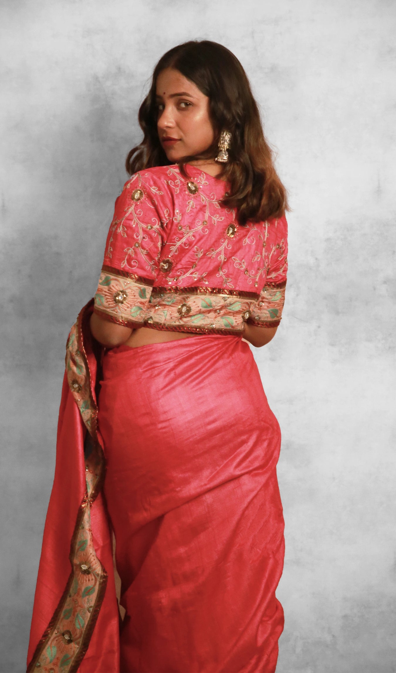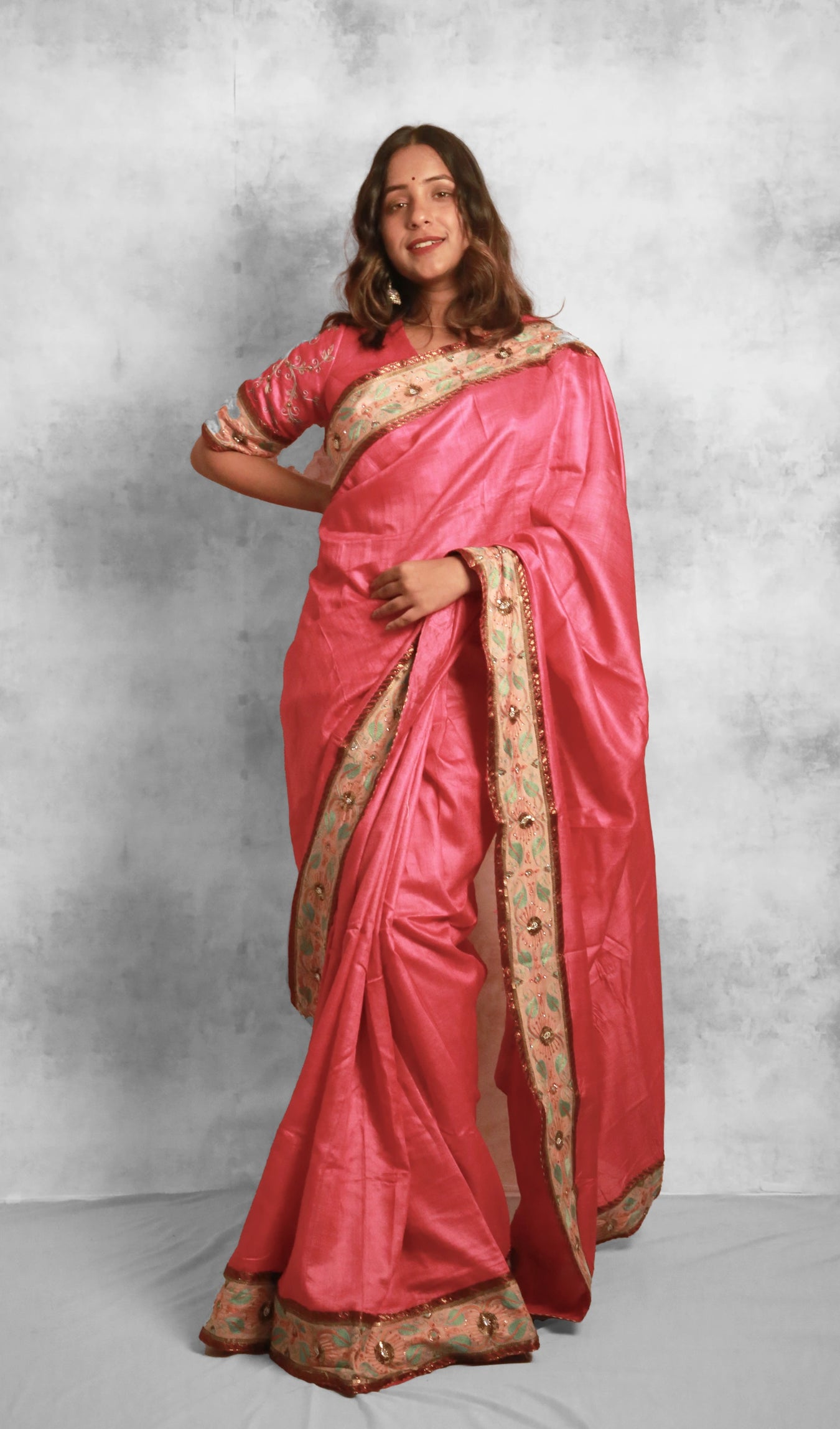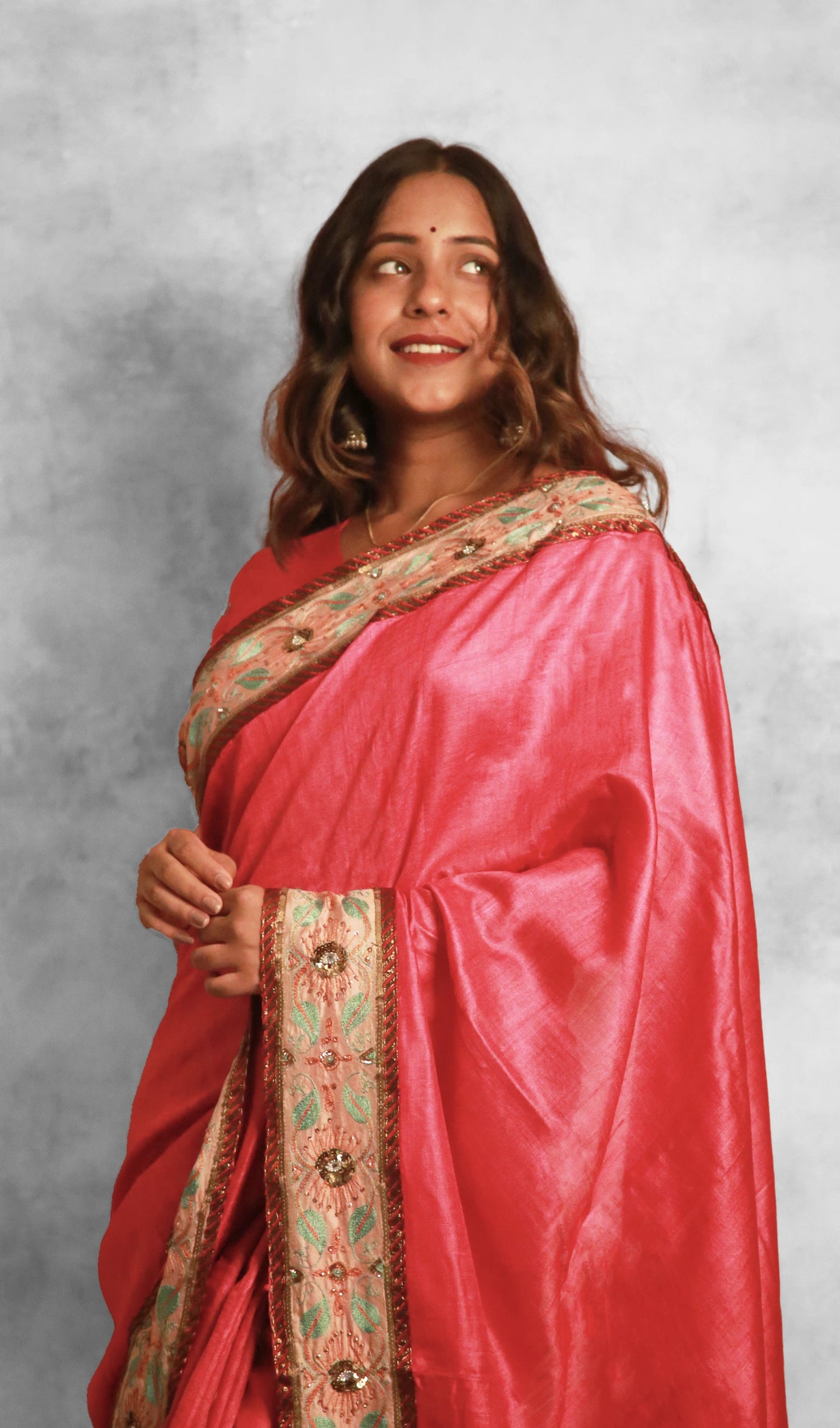 This saree features a vibrant fusia color allowing you to make a bold and stylish statement. The highlight of the saree is the intricate Zardozi handwork done on the border, adding a touch of opulence and artistry.