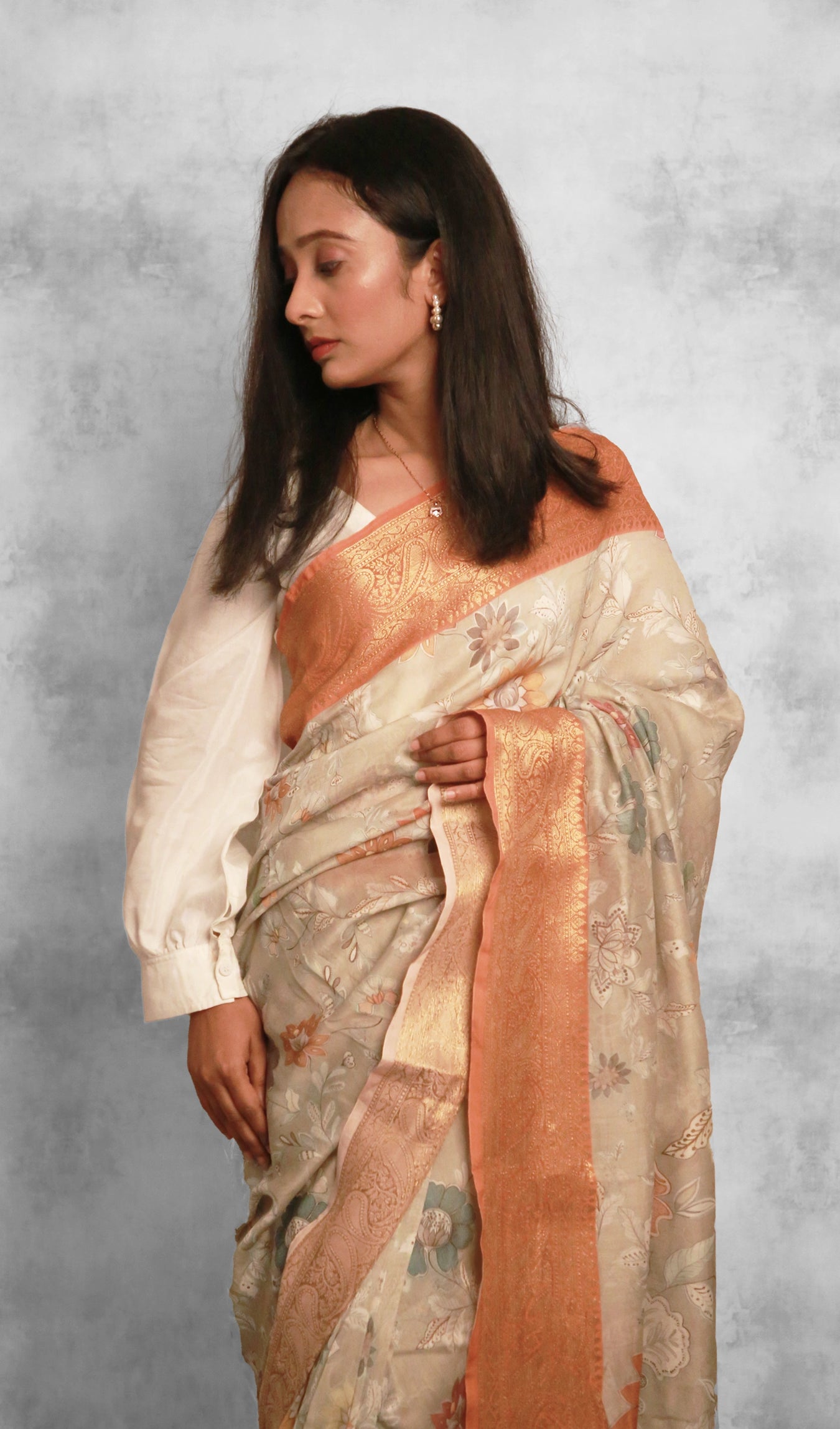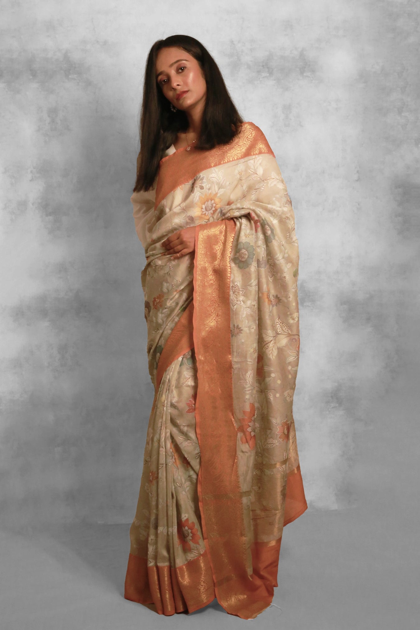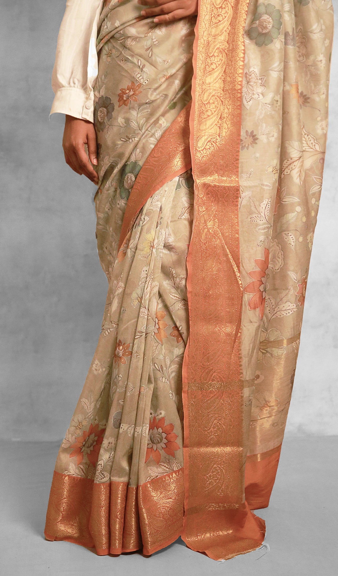 This saree features a soothing sweet celadon base with a vibrant orange border. The soft and delicate wild floral prints add a touch of whimsy and elegance. Let the gentle whispers of wildflowers envelop you as you drape yourself in this ethereal creation.