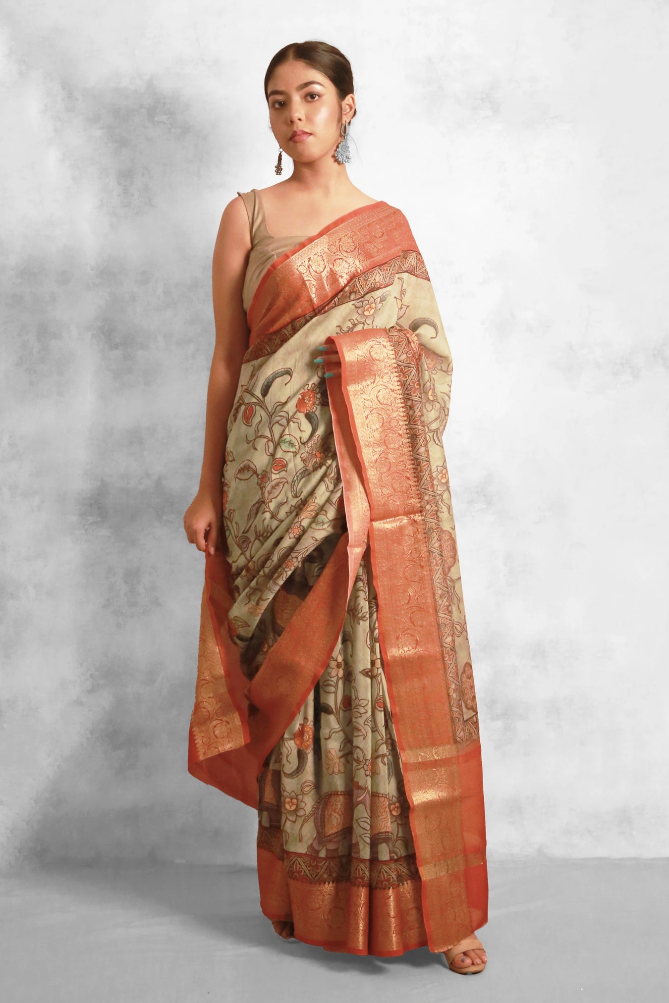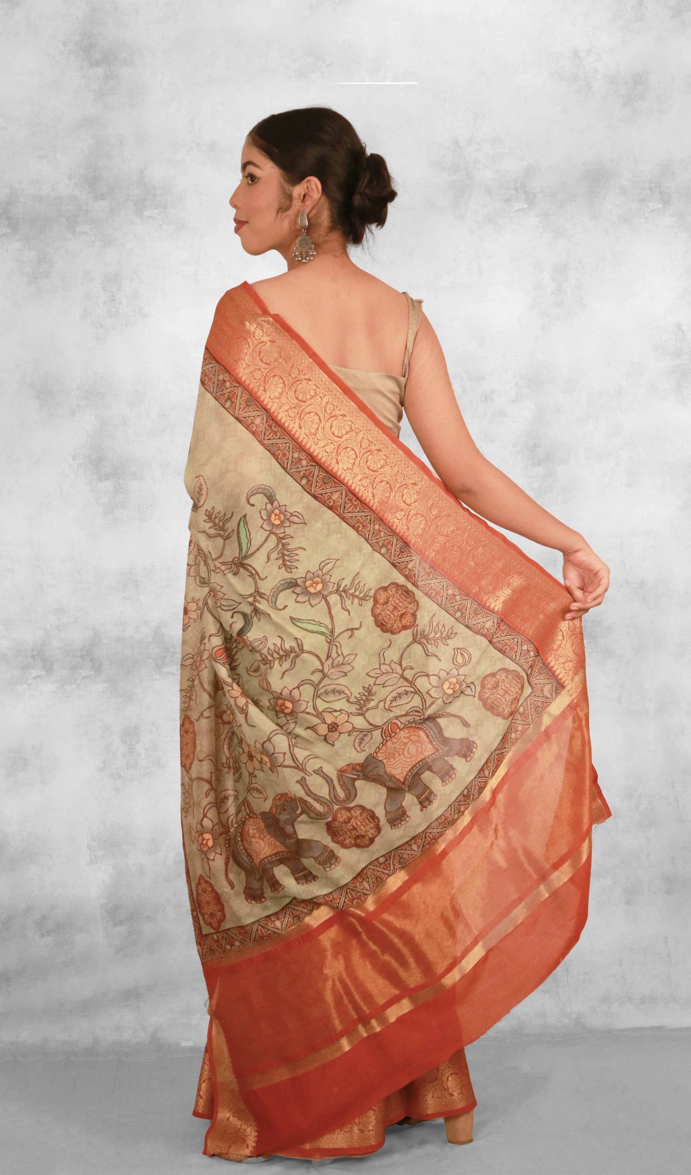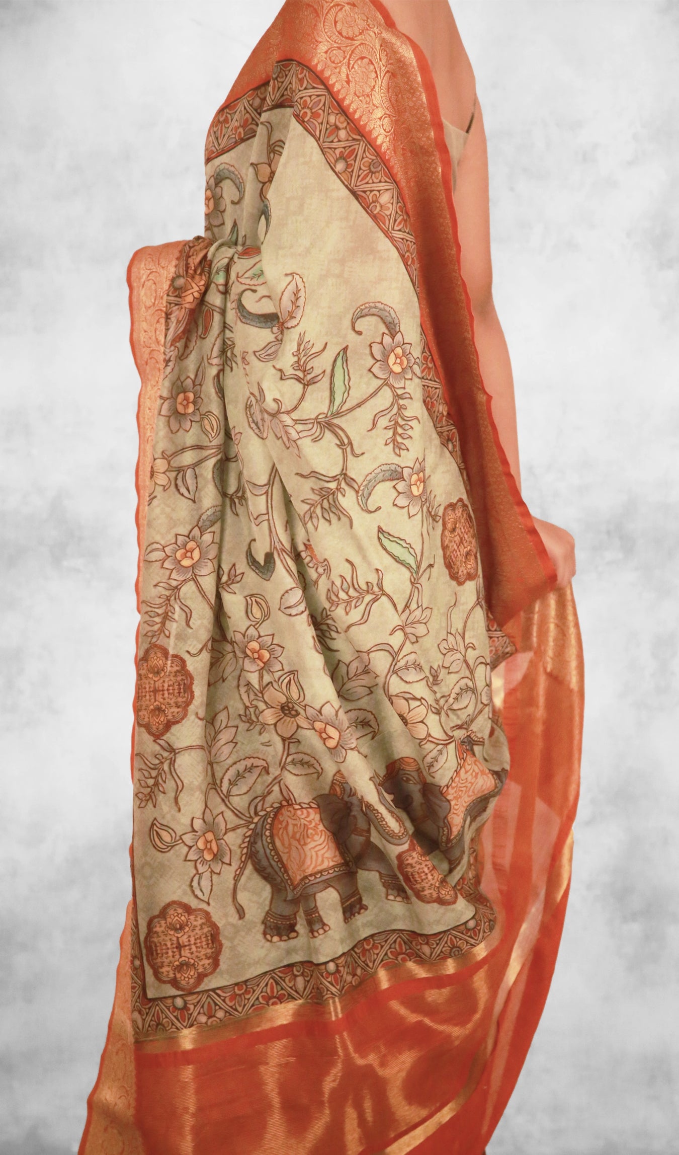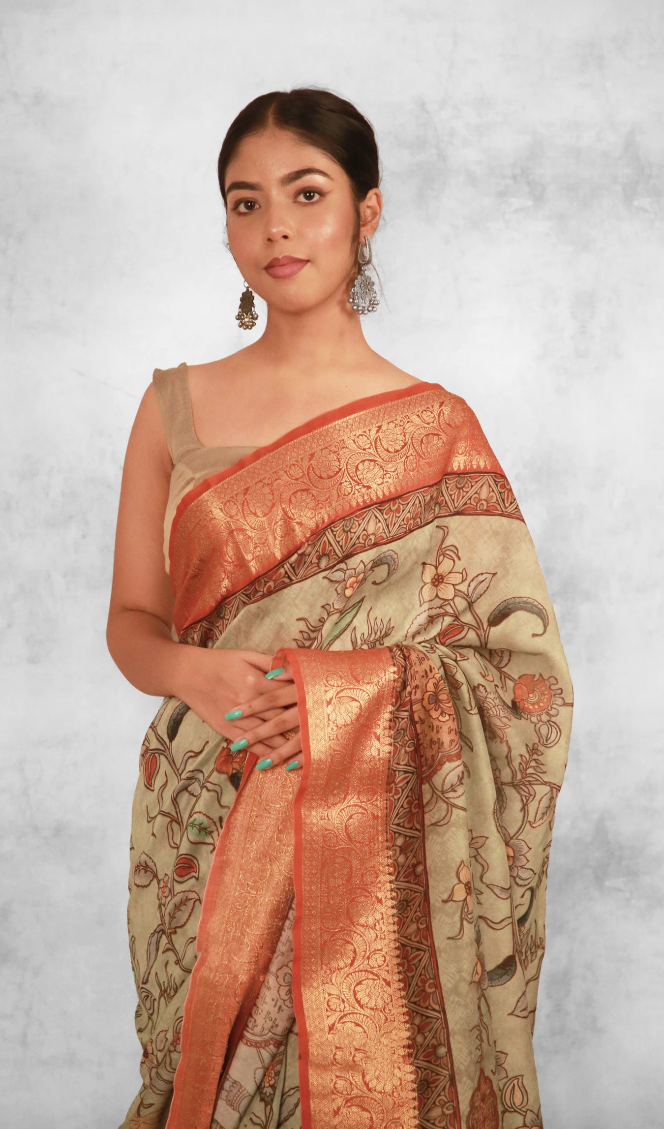 Indulge in the elegance of wildflowers with our Chanderi Zari Woven saree. The pale green saree with an orange border creates a captivating combination. Adorned with a bold Kalamkari digital floral print, this saree is a celebration of nature's beauty.