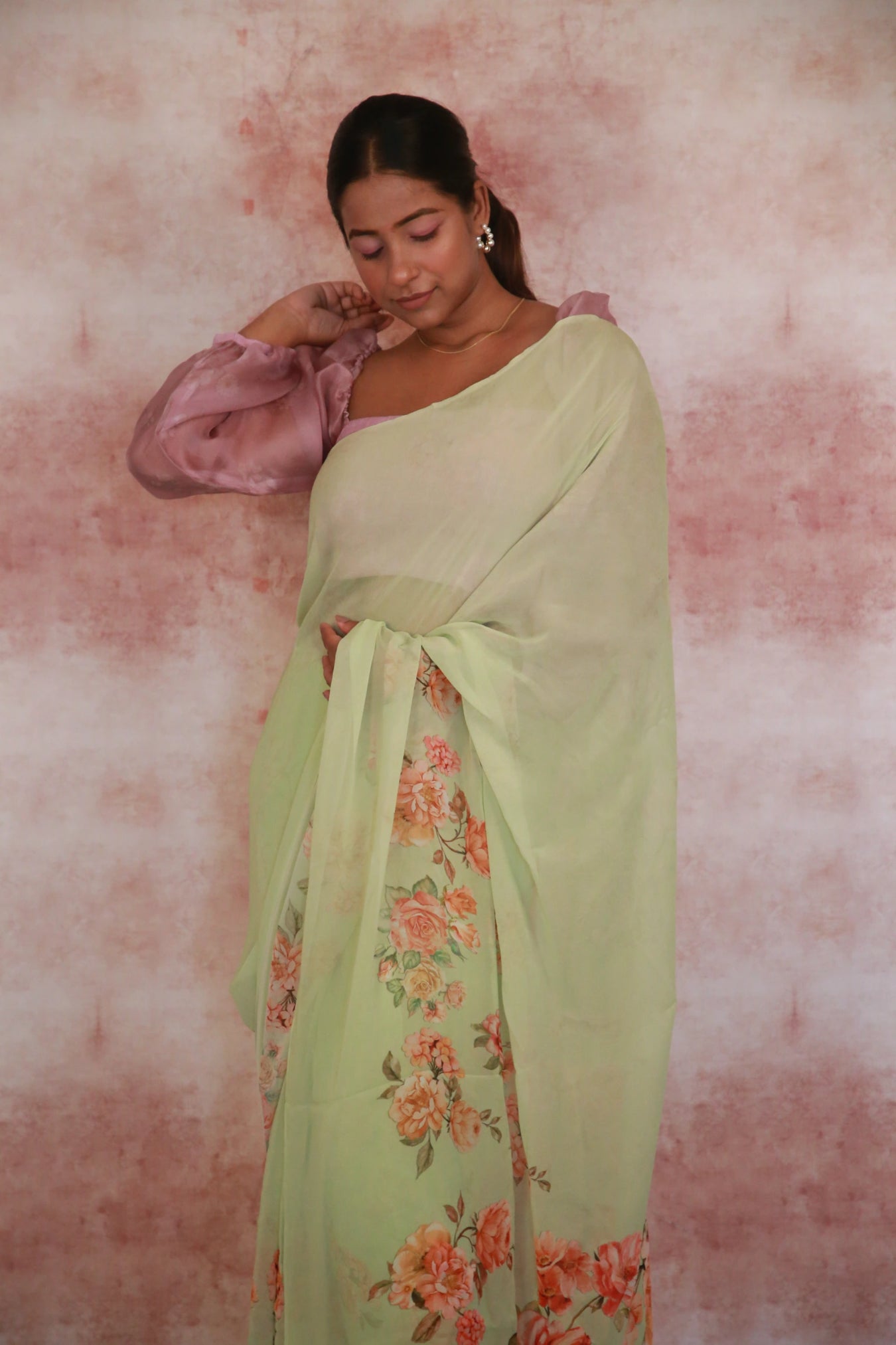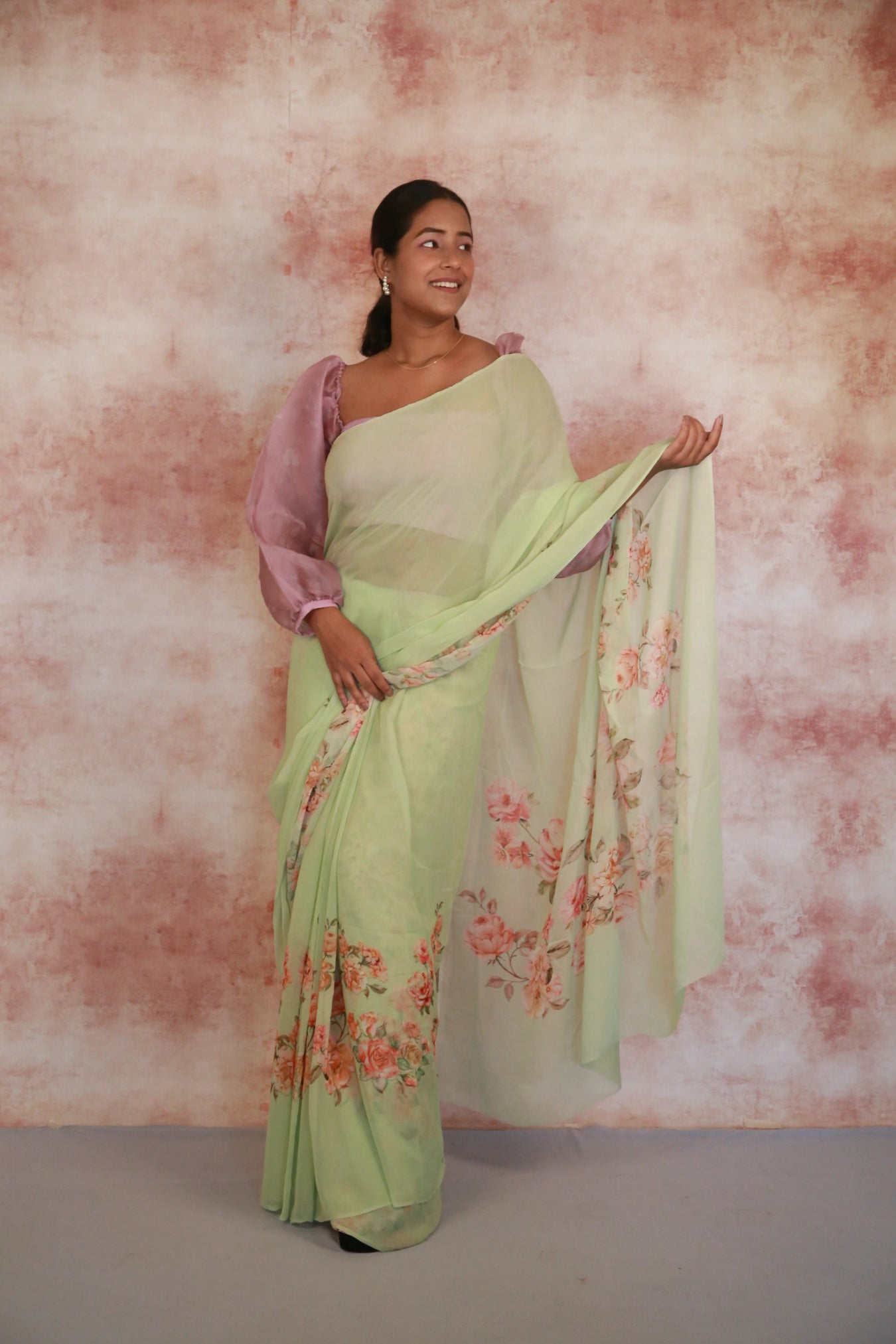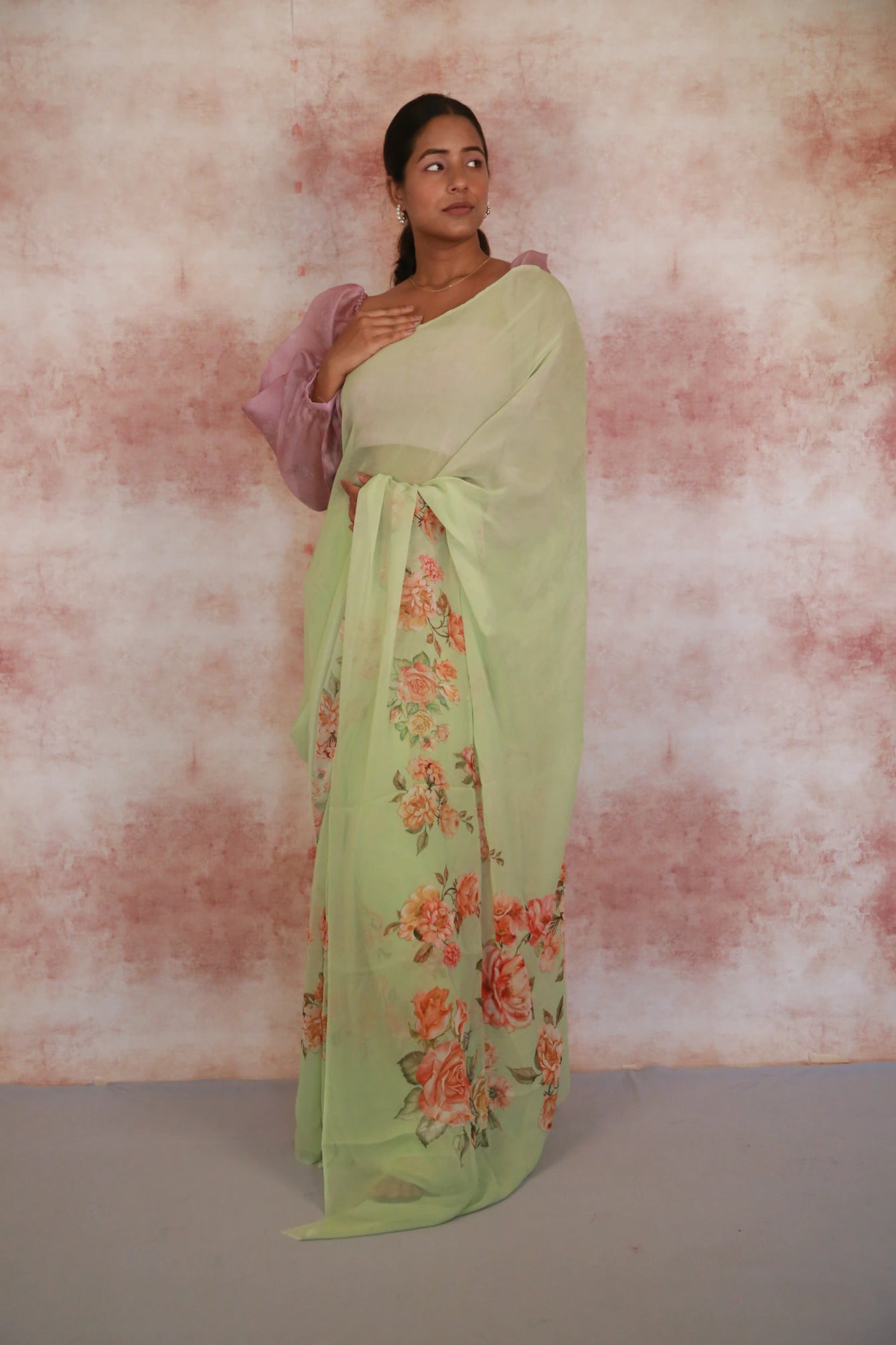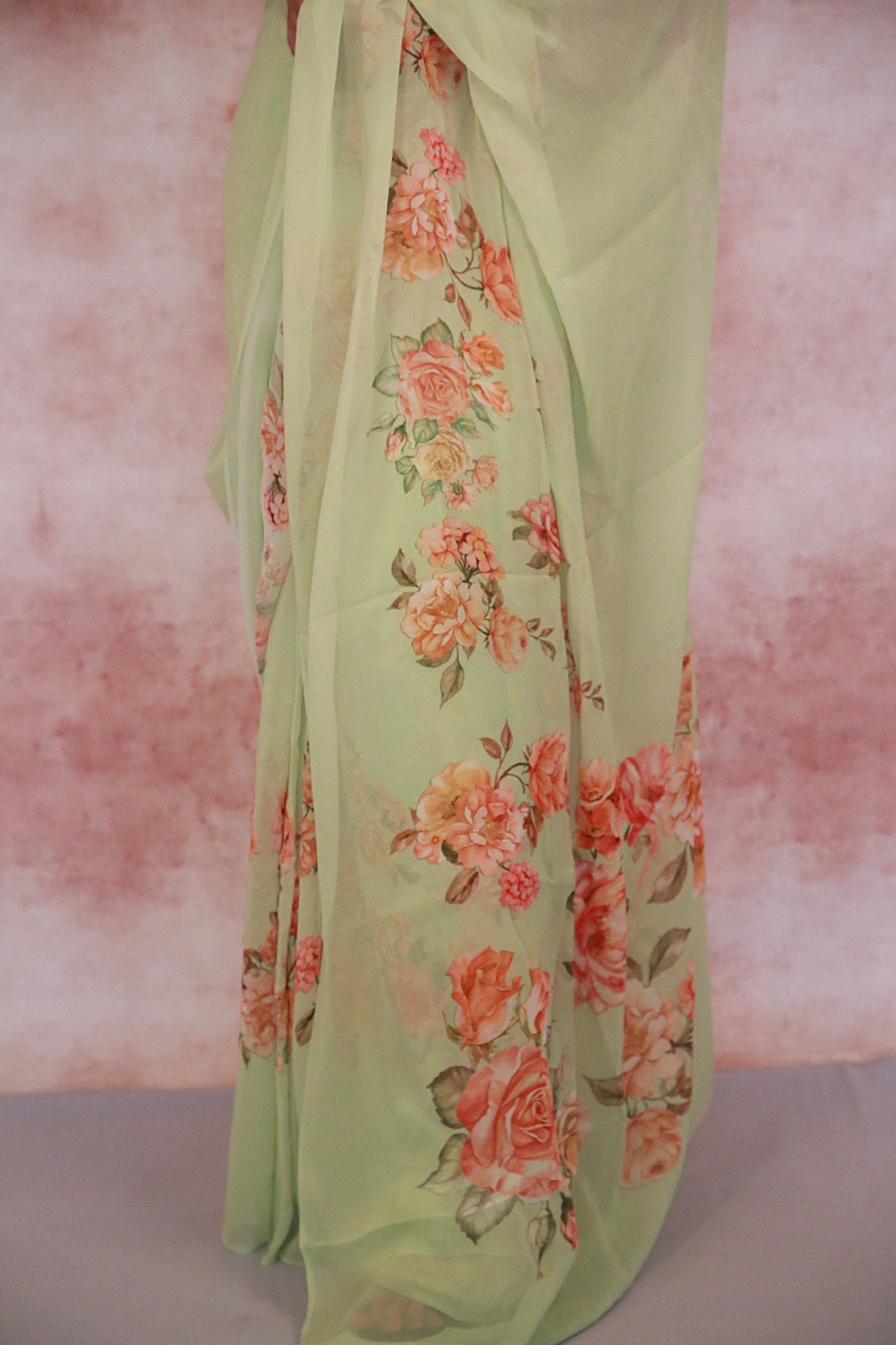 Size:Â S: 5.50Mtr B: 0.80MtrColour: Sea greenFabric: GeorgetteAttributes:Â Pattern and print: The Sea green georgette saree adorned with a captivating design featuring Orange and pink flower branches throughout the fabric. Georgette is a lightweight and sheer fabric known for its flowing and draping characteristics. It adds an ethereal and graceful quality to the saree, making it a popular choice for traditional wear.Purity:Pack contains:Â 1 Saree, 1 BlouseCare instructions: Cold hand wash